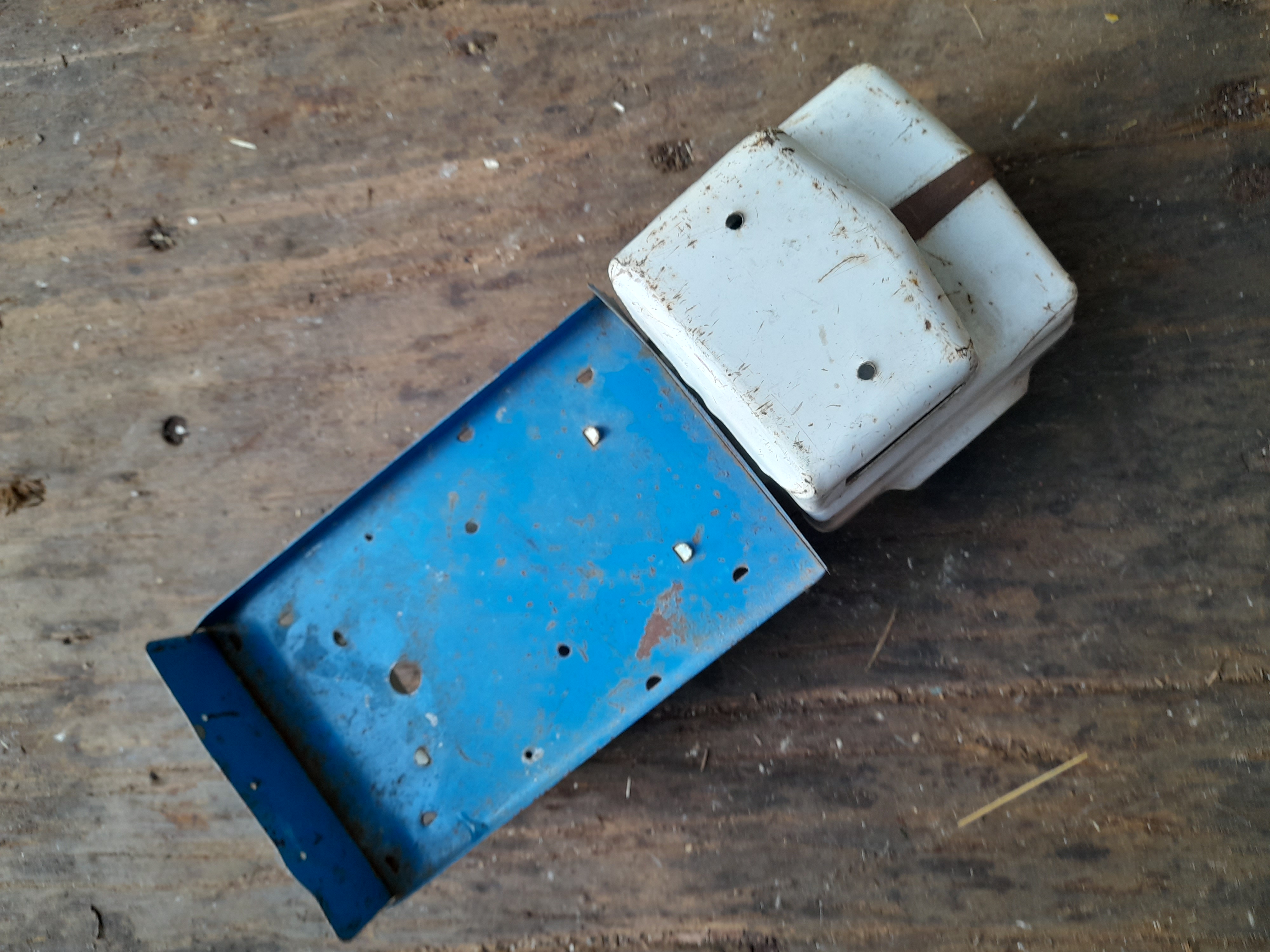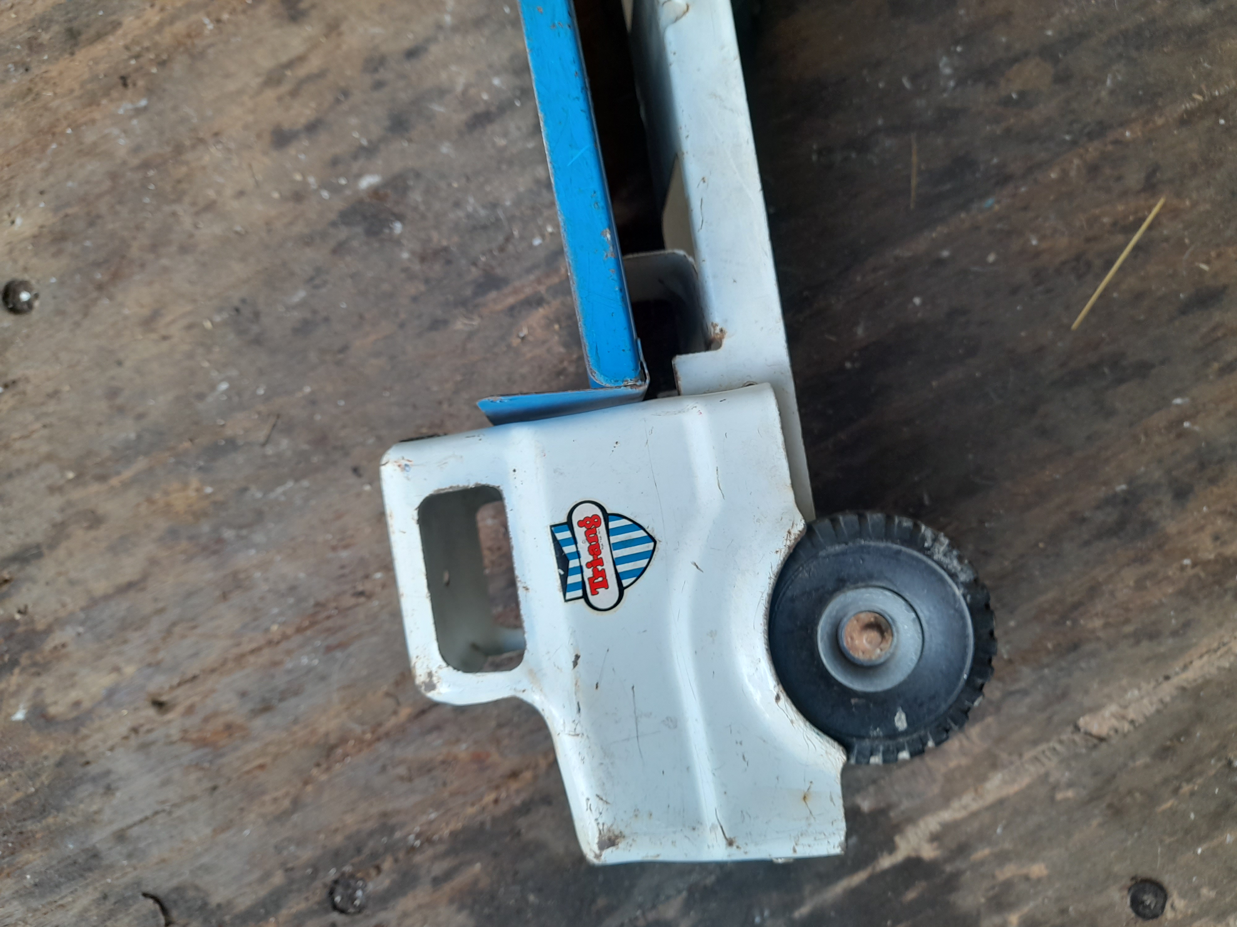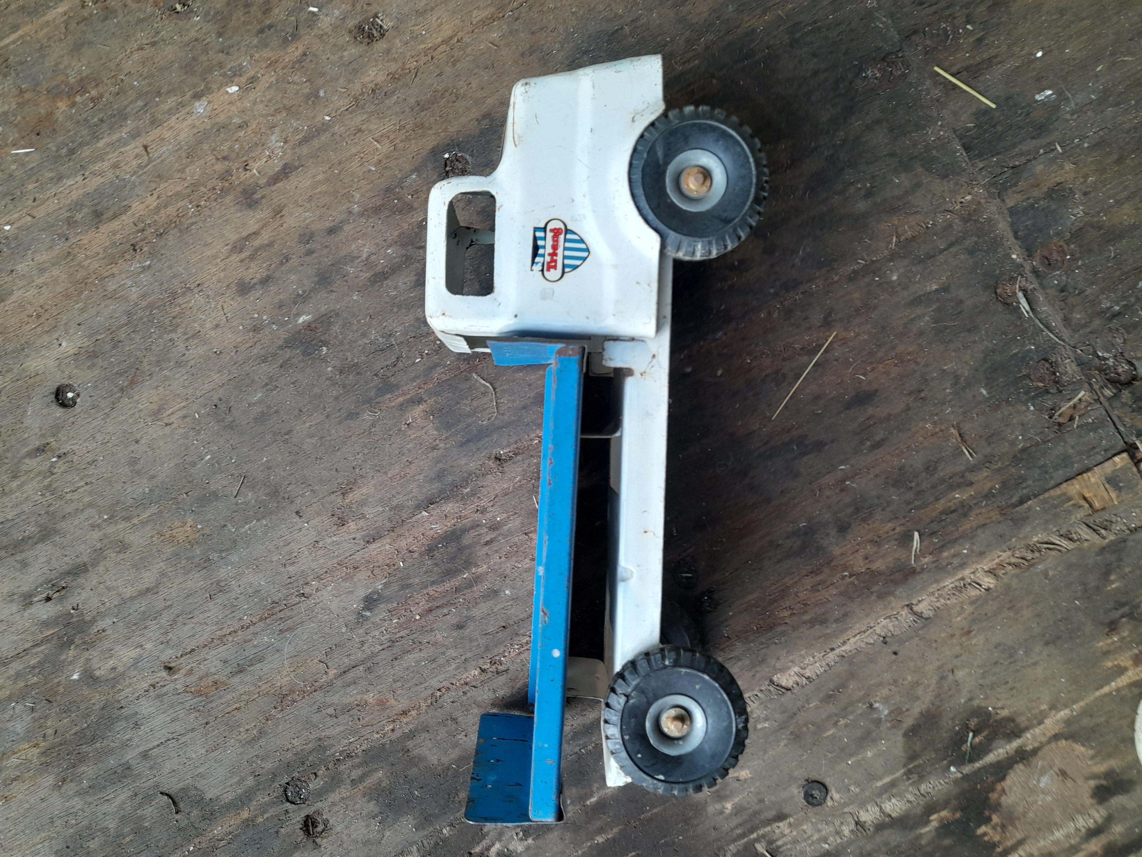 A vintage pressed steel toy truck featuring a white cab with a Tri-ang maker’s mark and a blue flatbed trailer on black wheels.