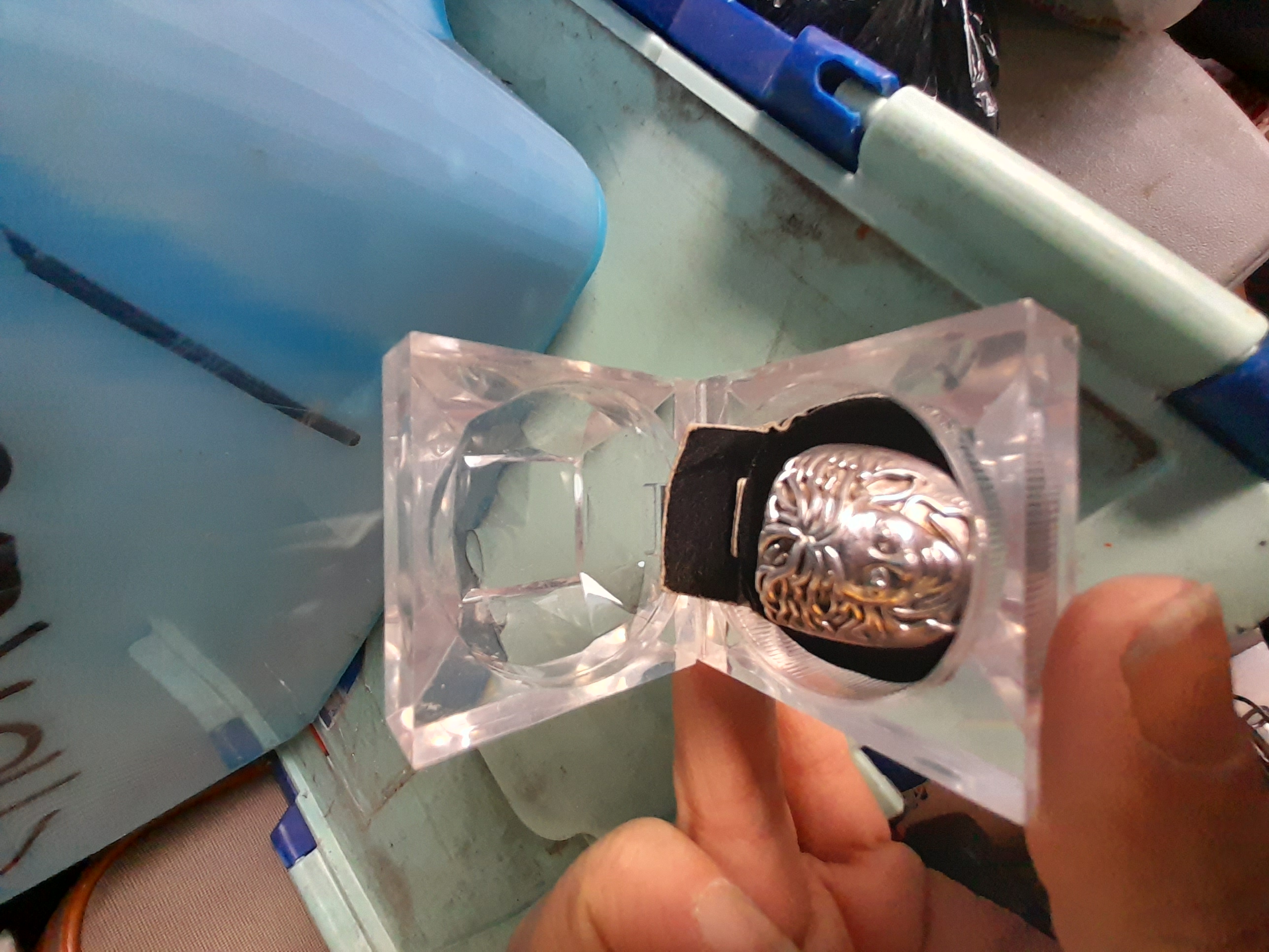 A silver-coloured ornate ring featuring a stylized face design, presented within a clear faceted plastic display case.