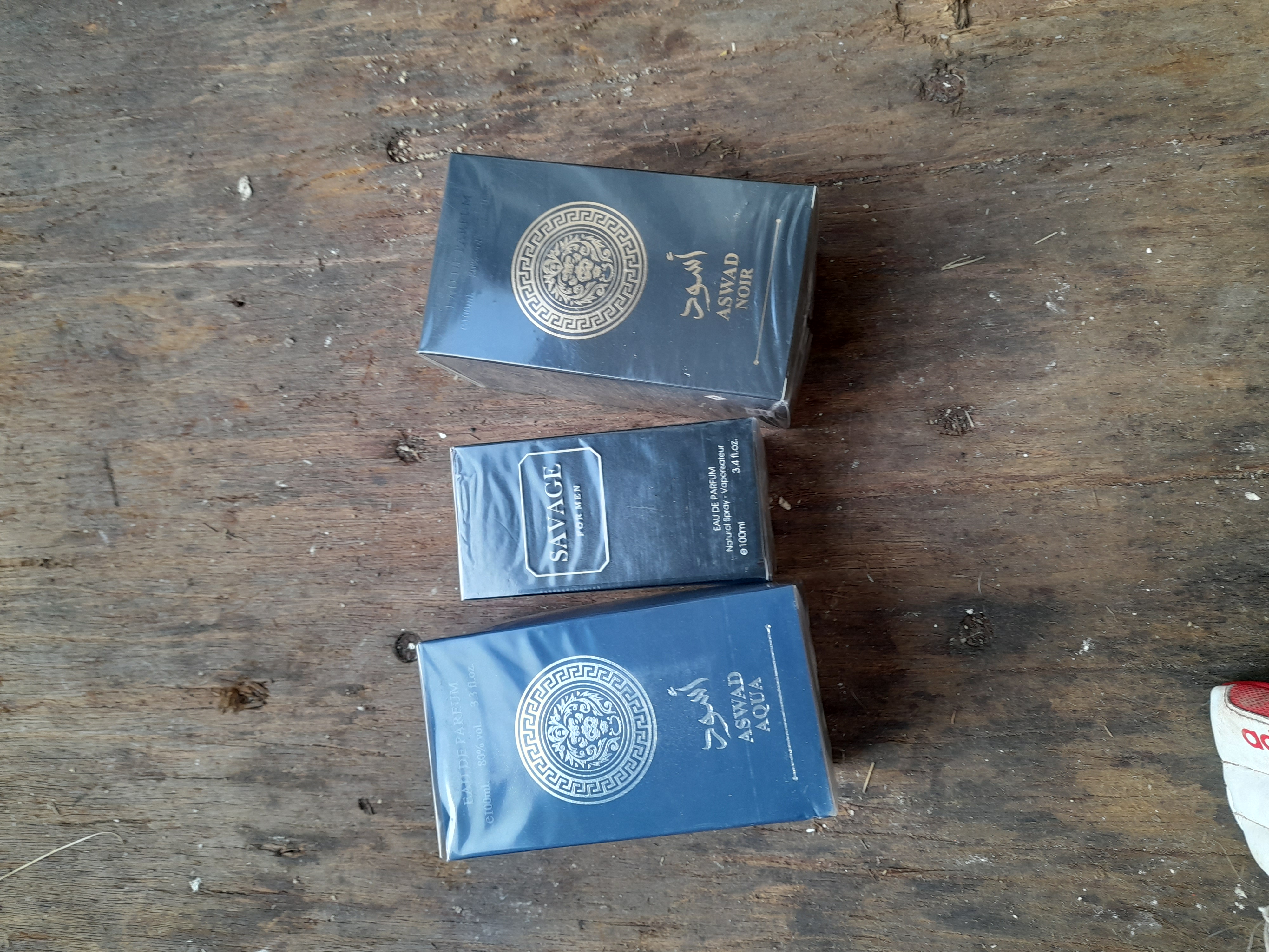 A trio of boxed 100ml eau de parfum fragrances including Aswad Noir, Savage For Men, and Aswad Aqua, all presented in original sealed packaging.
