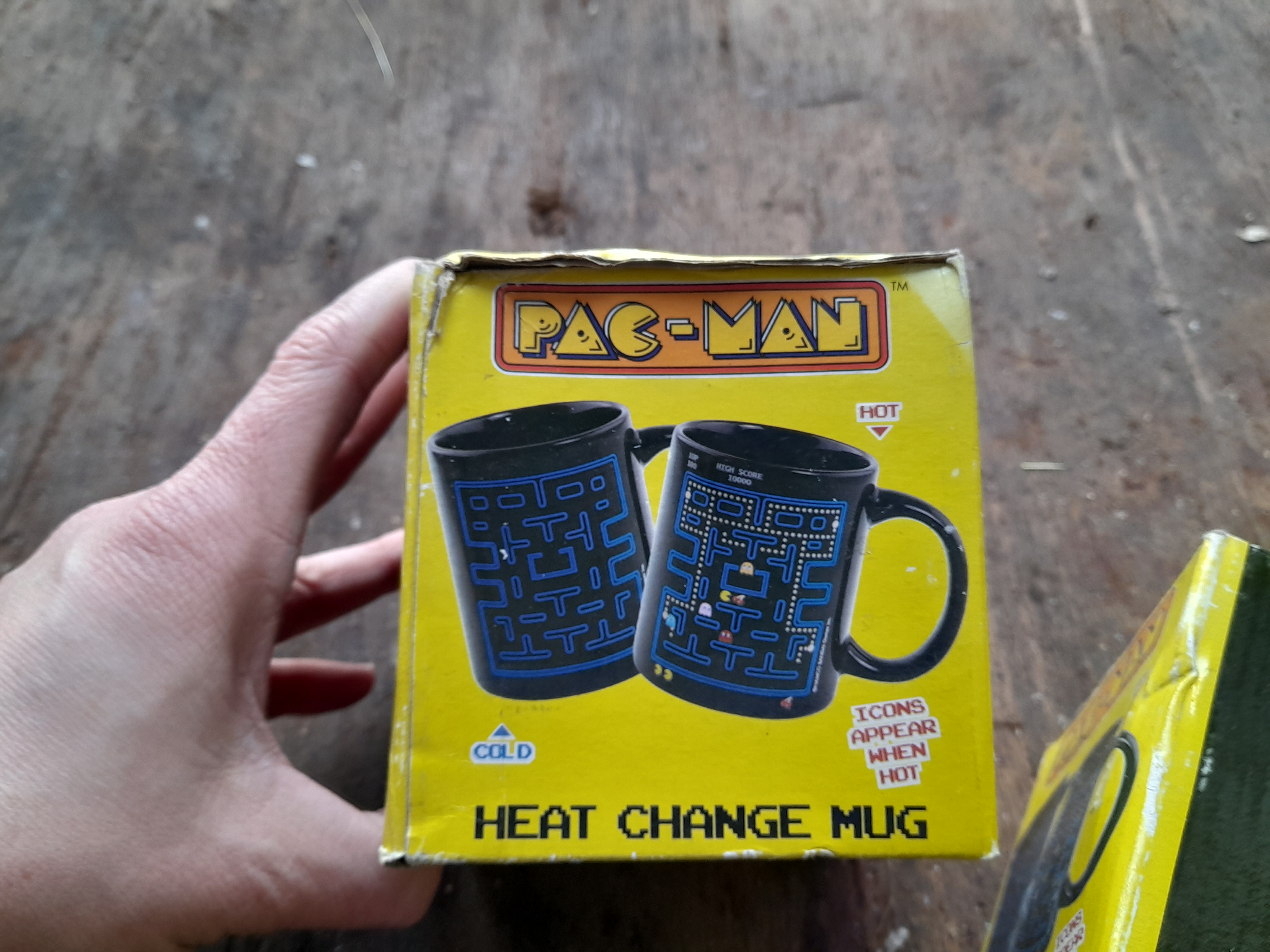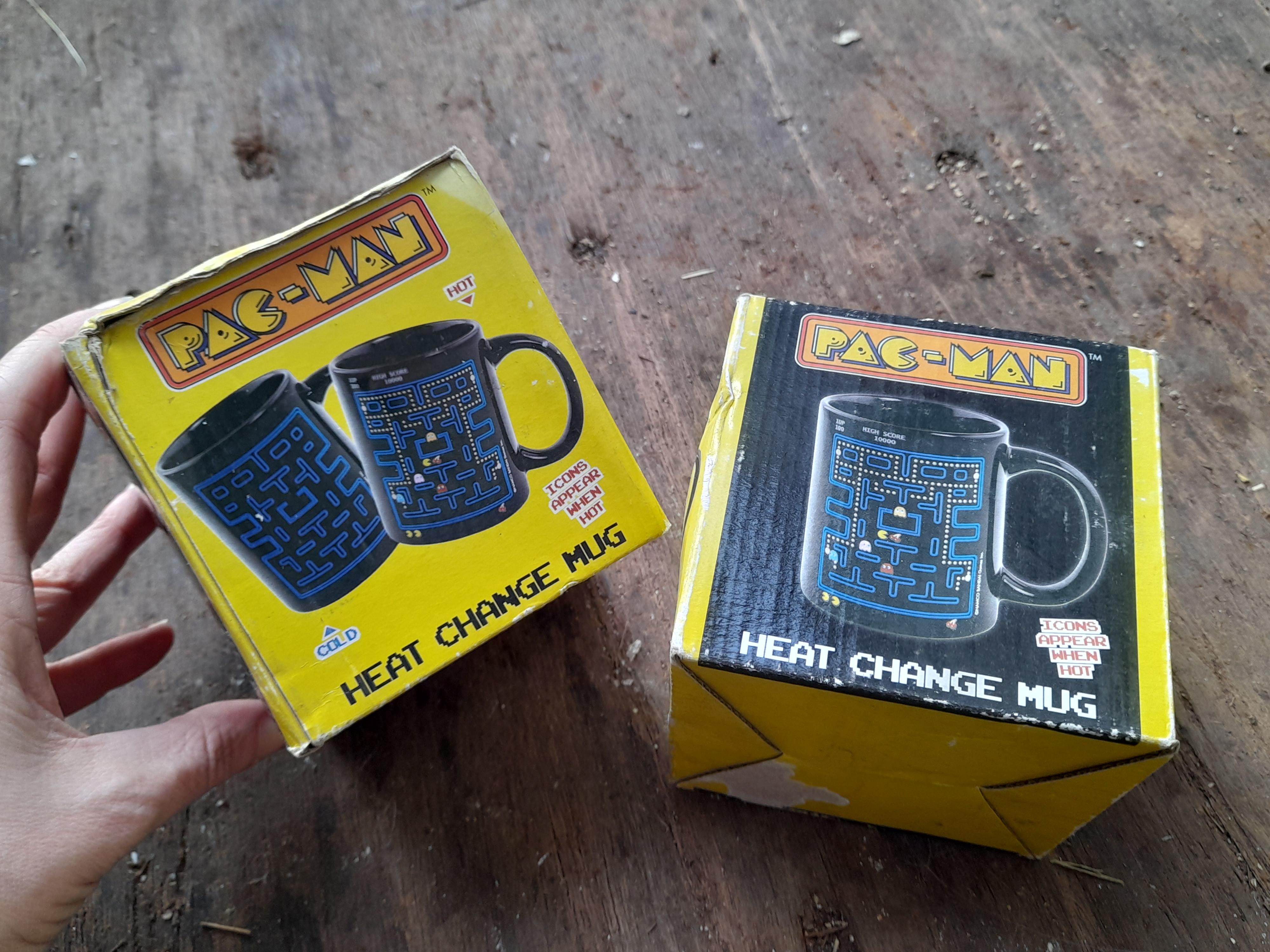 A pair of officially licensed ceramic coffee mugs featuring heat-activated Pac-Man maze graphics, housed in their original branded packaging.