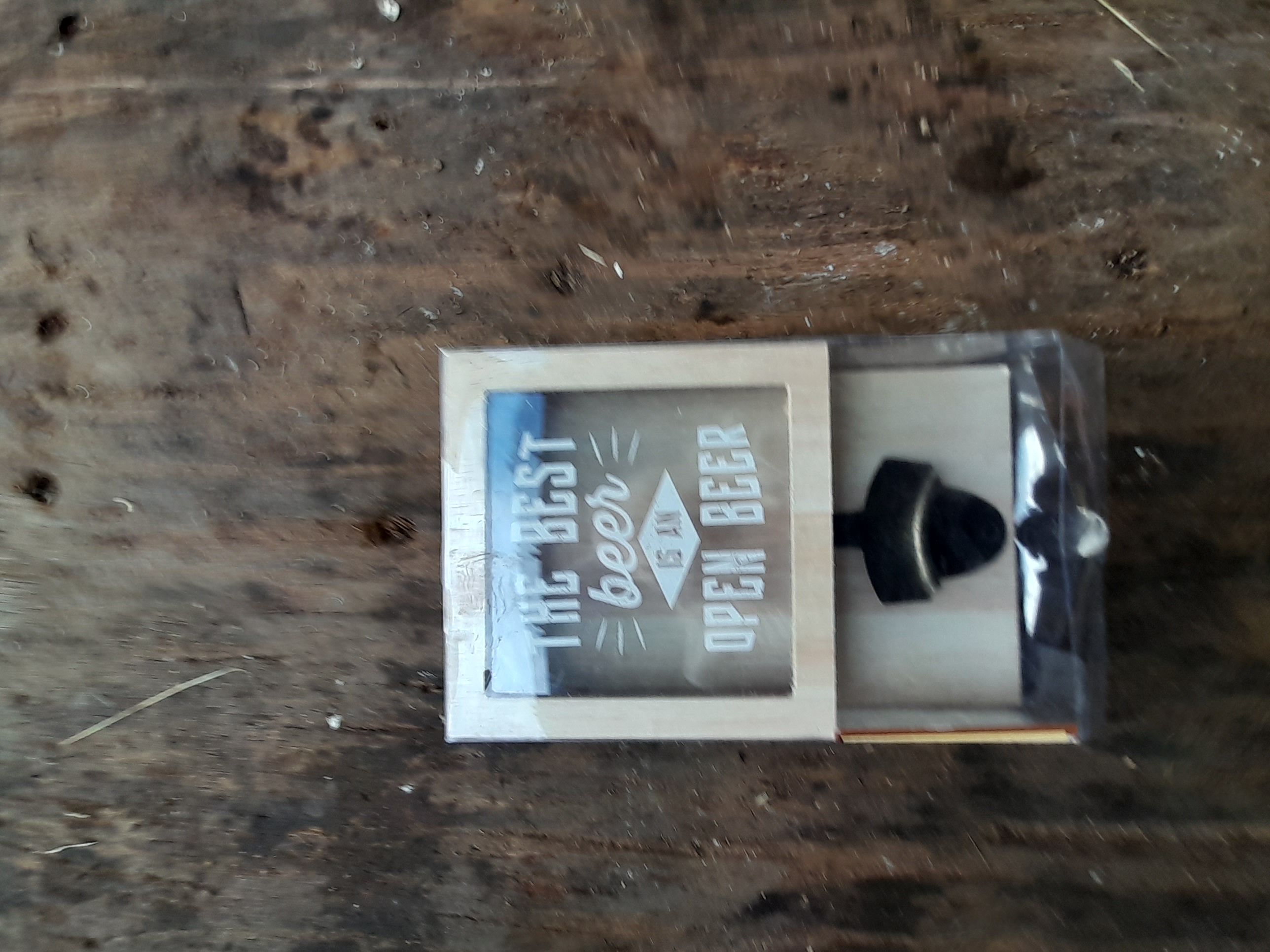 A wall-mounted bottle opener and cap catcher in natural wood and black metal featuring the inscription The Best Beer is an Open Beer on the front panel, measuring 10.25 inches in height.