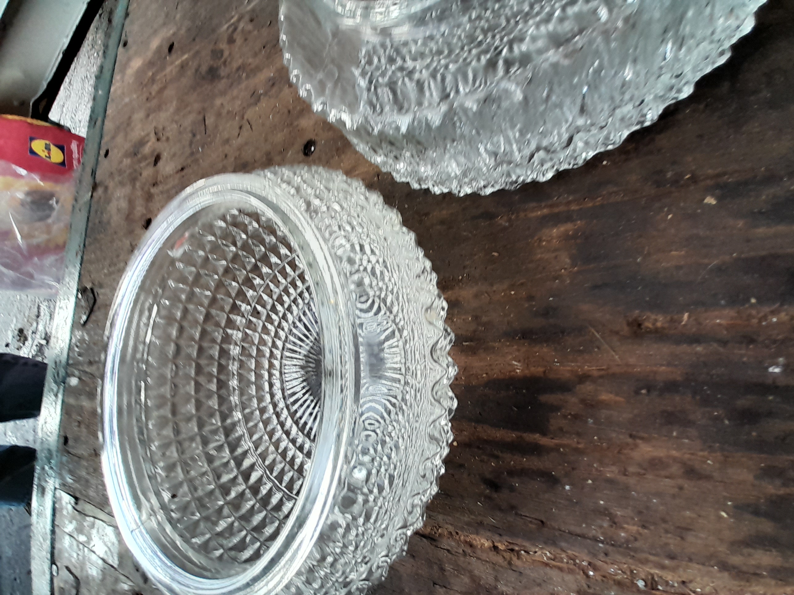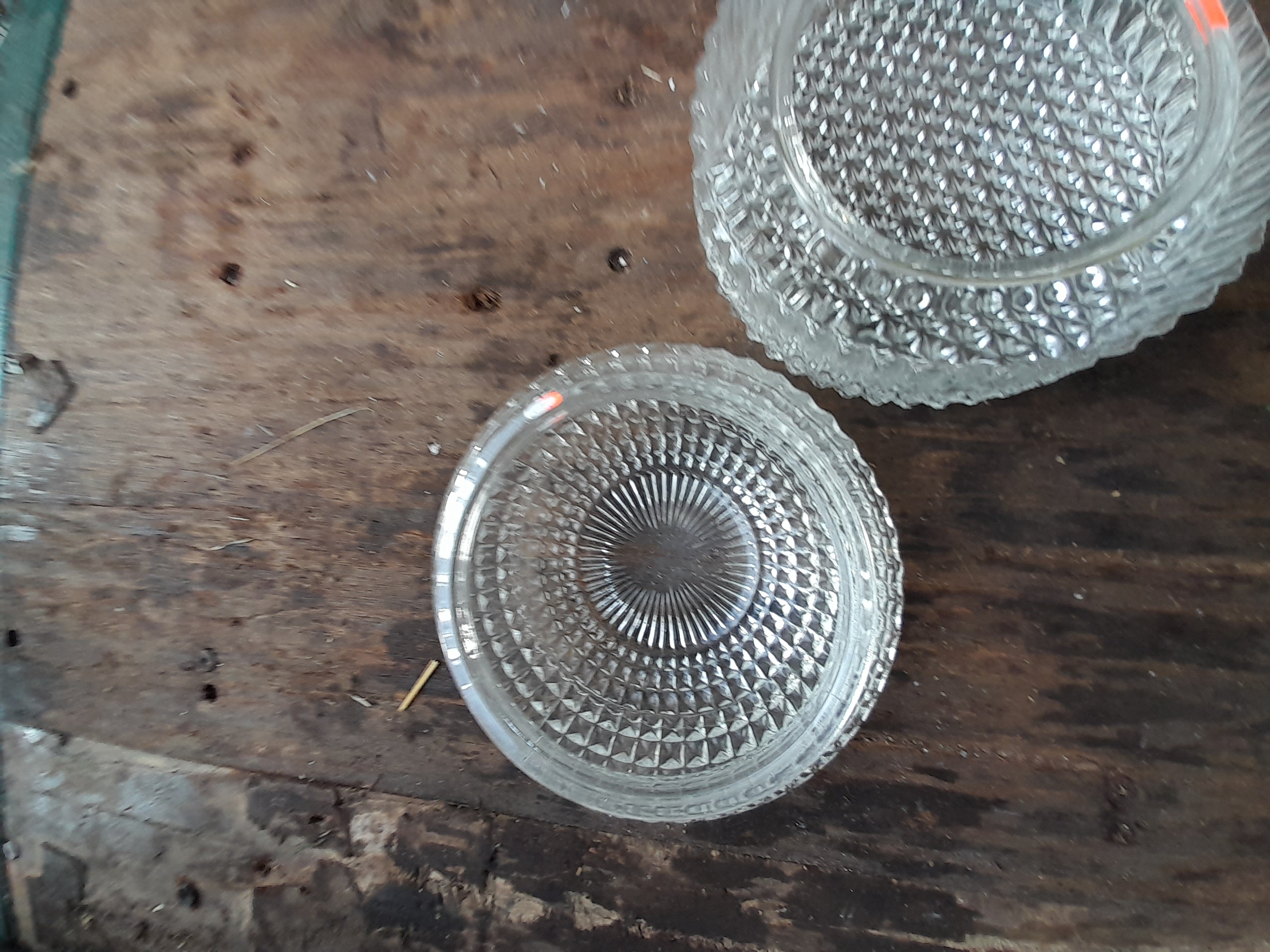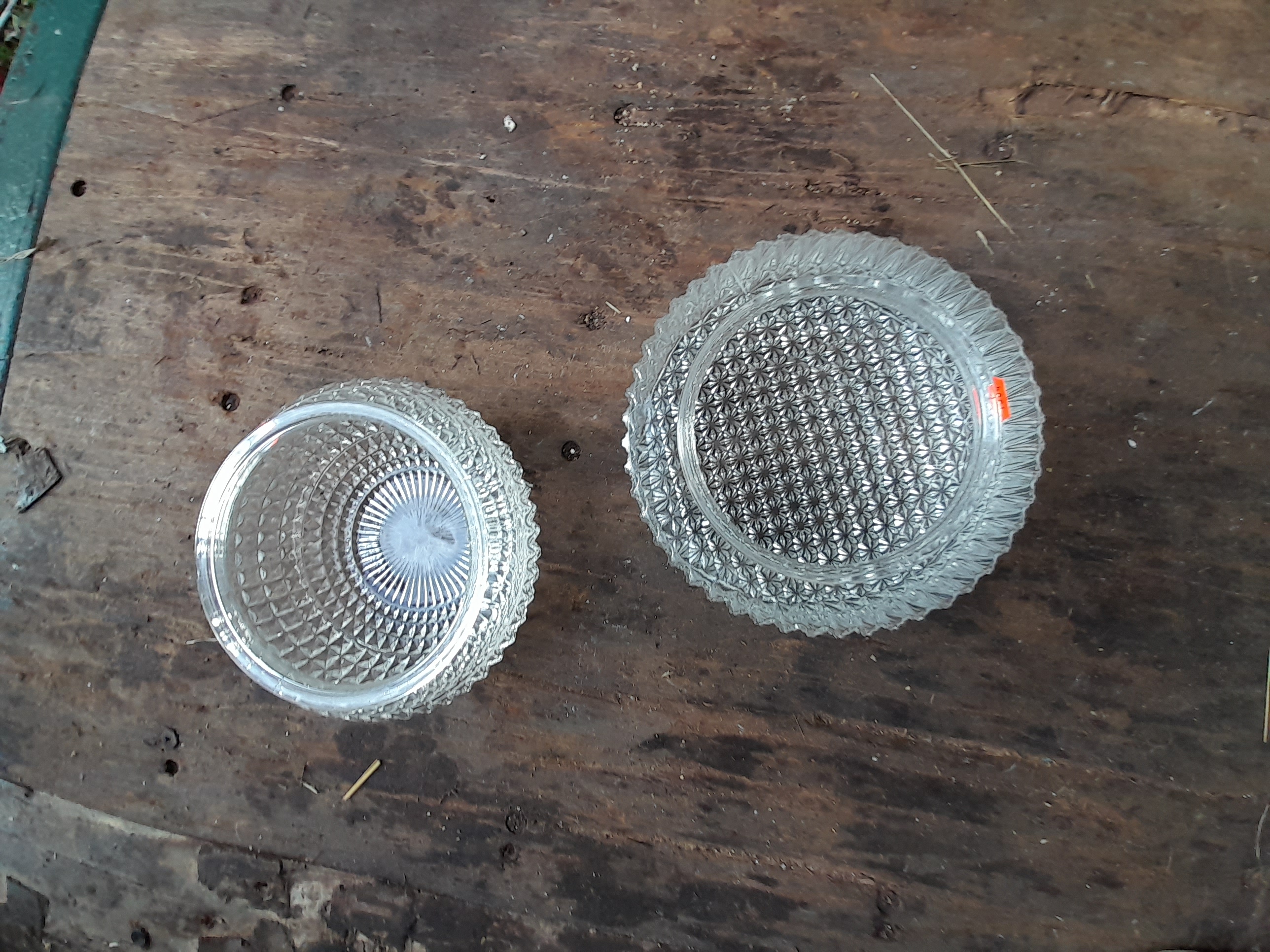 A collection of clear pressed glass dishes featuring intricate geometric and diamond-point textured patterns throughout.