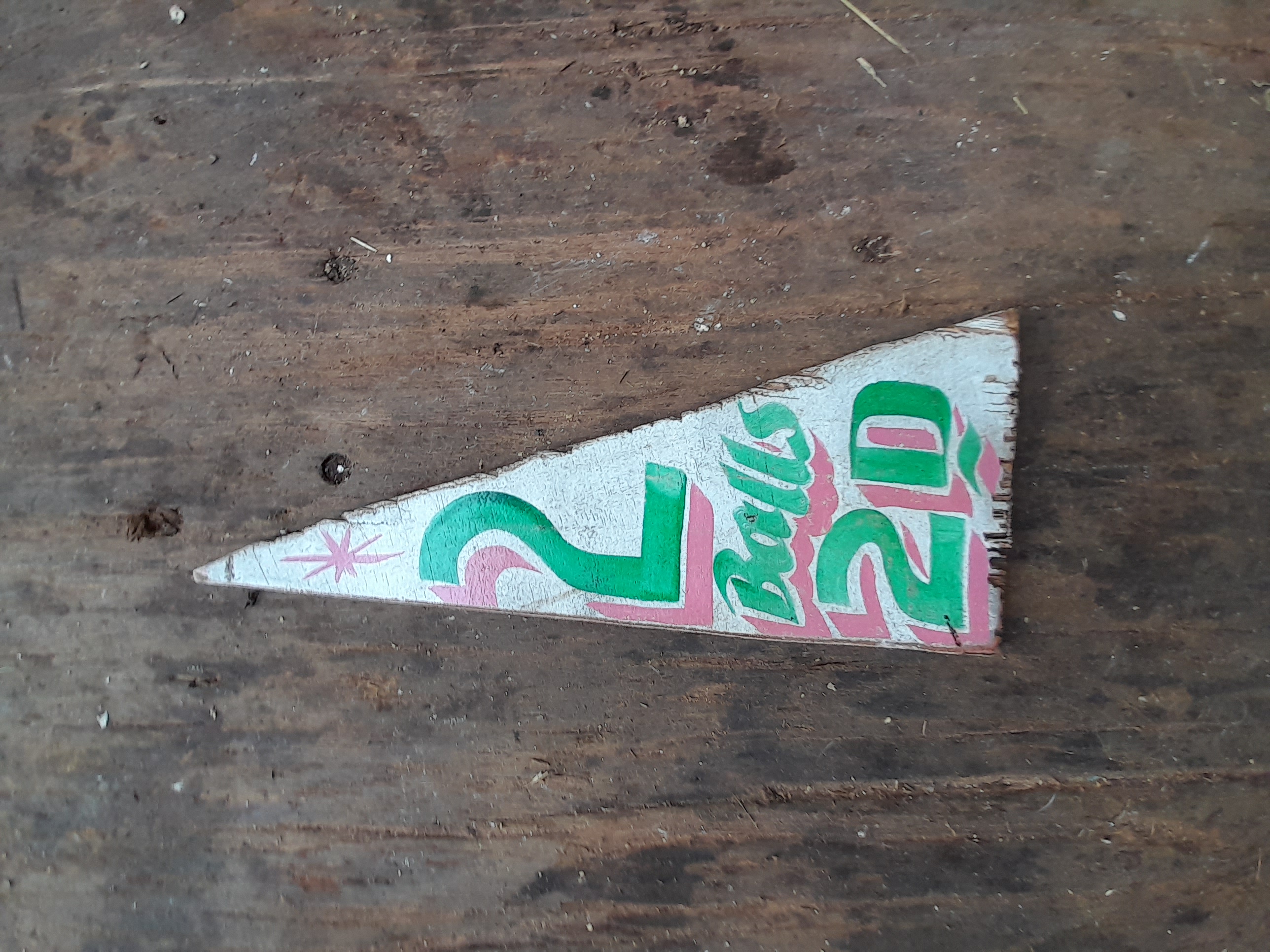 A small triangular hand-painted wooden sign featuring a white background with green and pink graphics reading 2 Balls 2D.fairground sign
