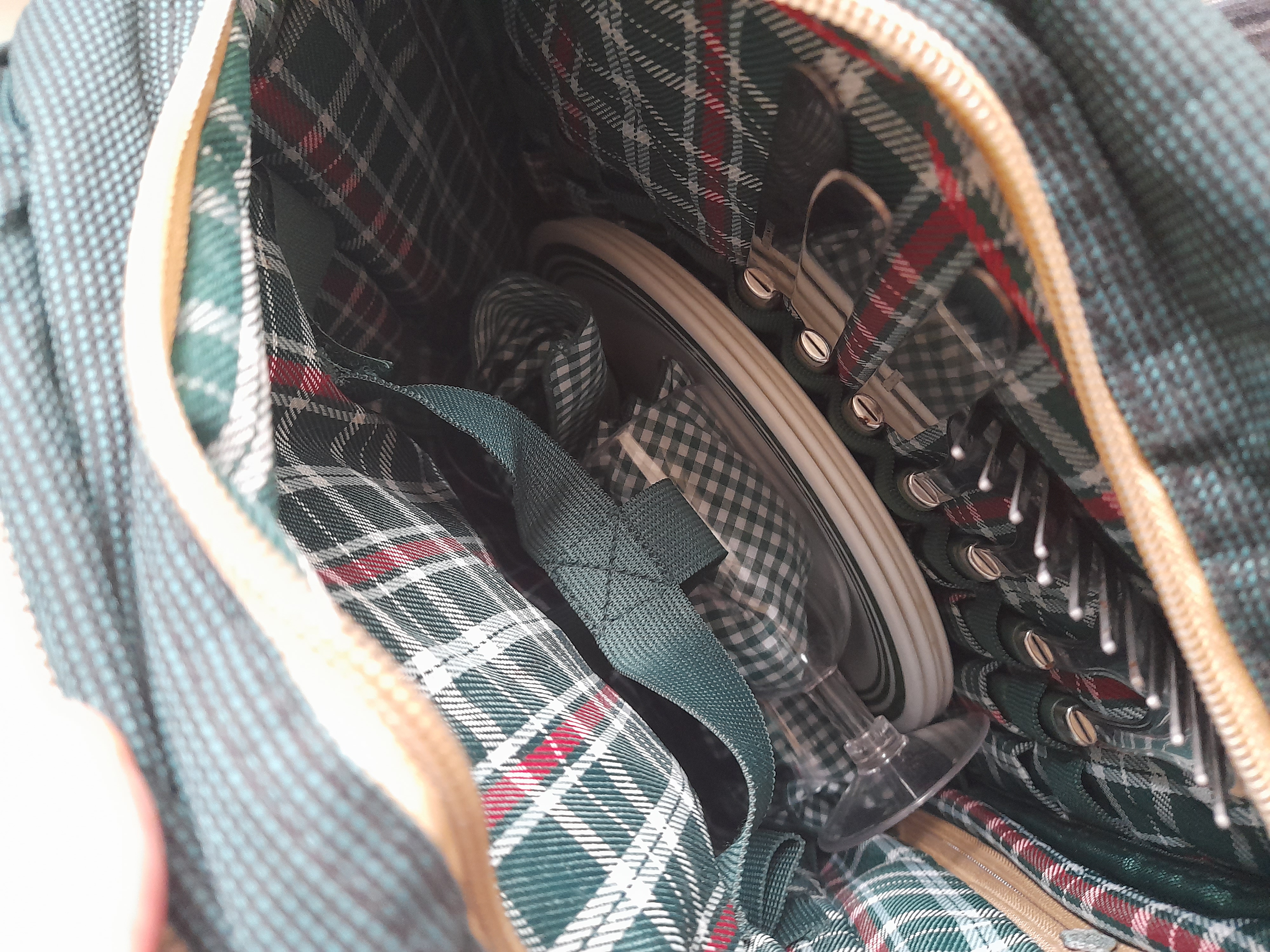 A dark green Gelert brand picnic backpack containing a collection of picnic-ware including several pieces of stainless steel cutlery, plates, and glassware.