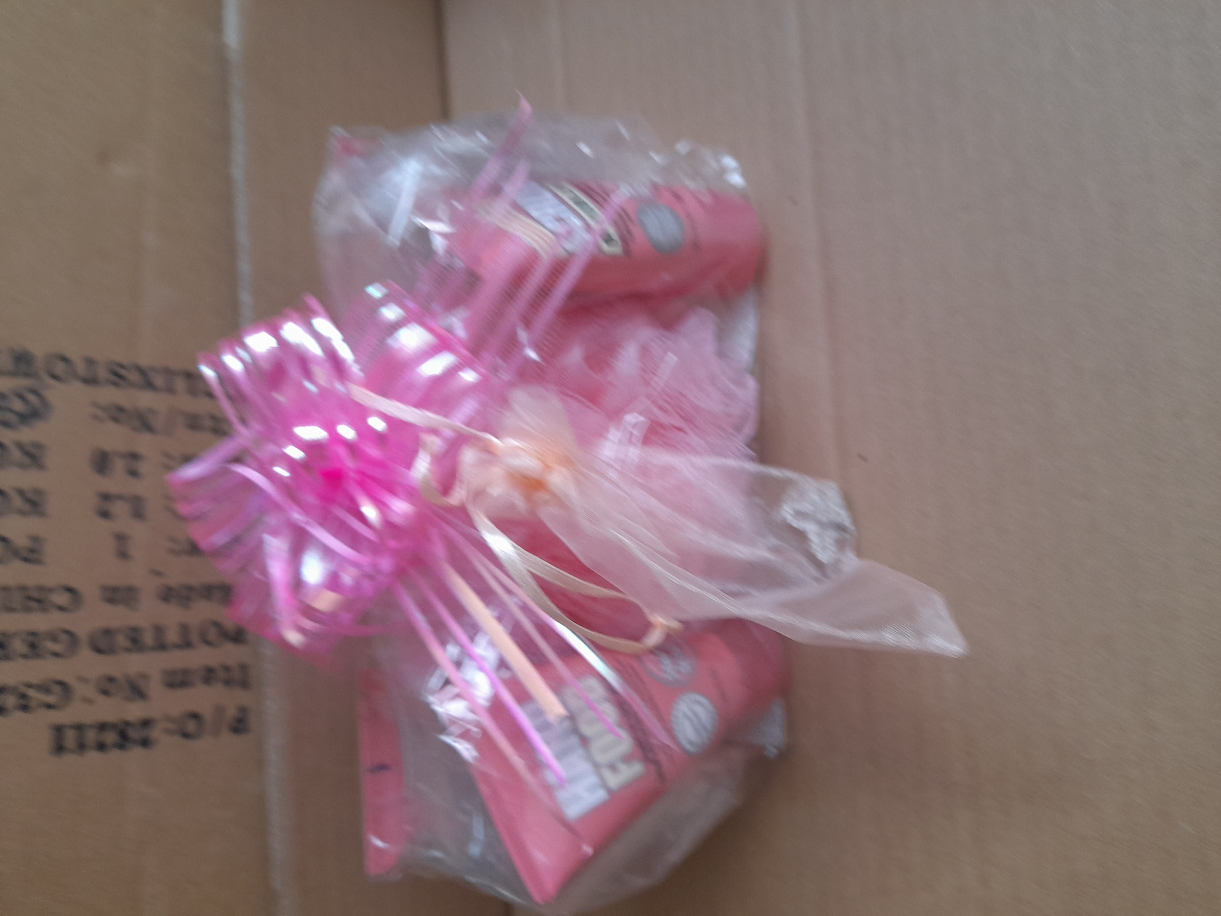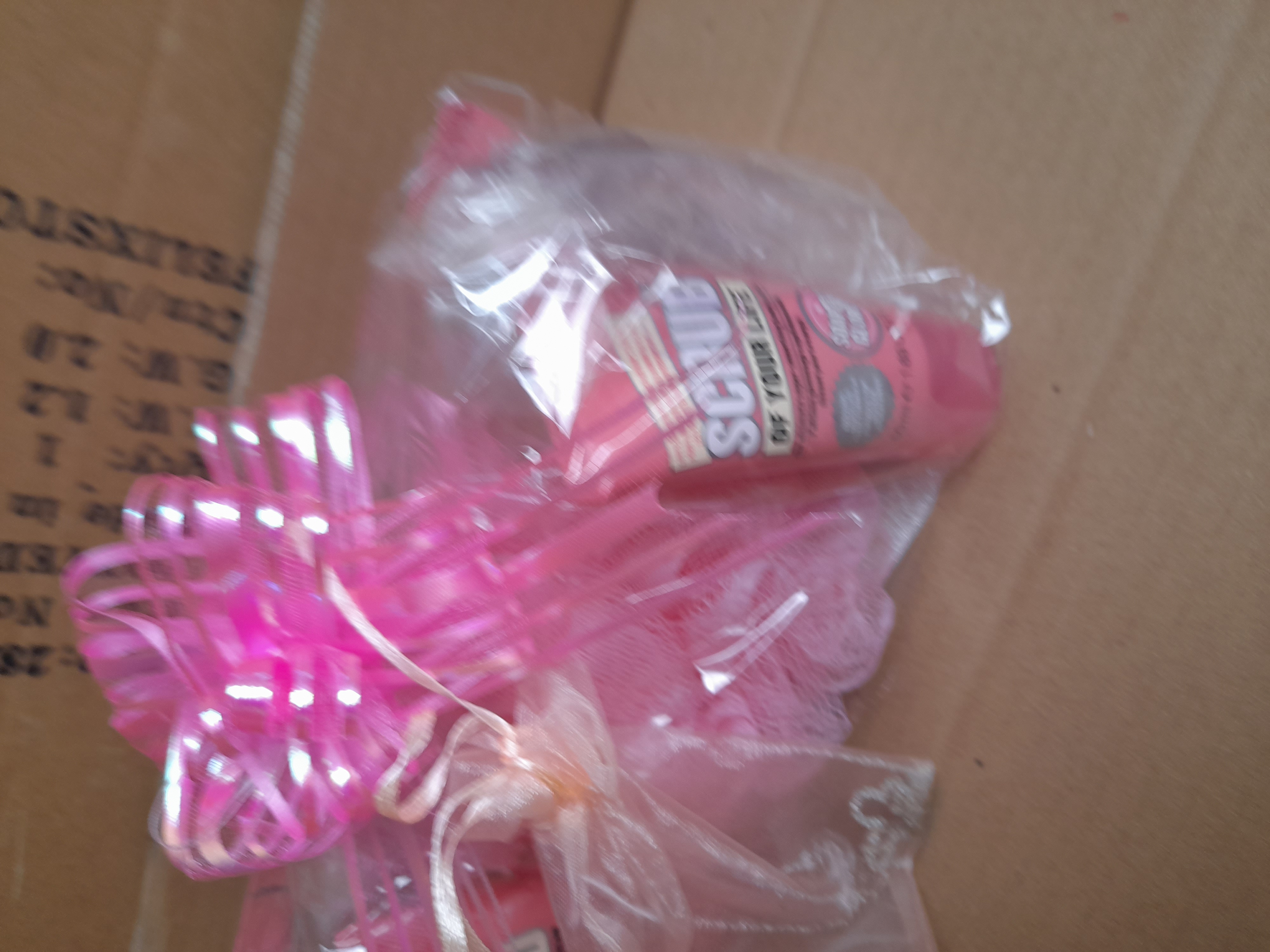 A collection of pink bath and body products including tubes labeled Scrub of Your Life and Hand Food alongside a pink mesh sponge, all contained within a gift-wrapped bag featuring a large pink bow.