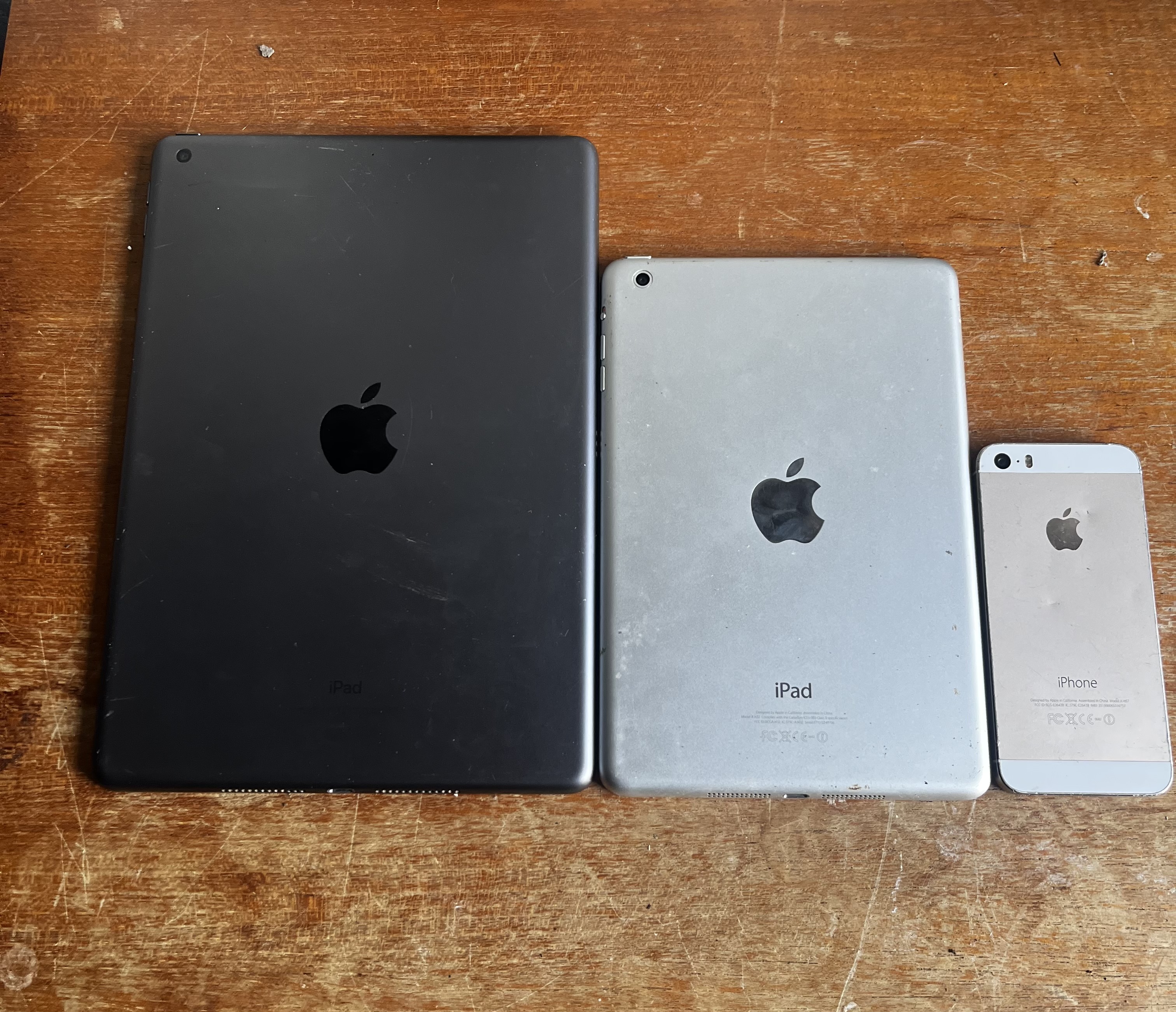 Including- iPad 7th generation, I pad mini first gen, and an iPhone 5s spares or repair – they all power on
