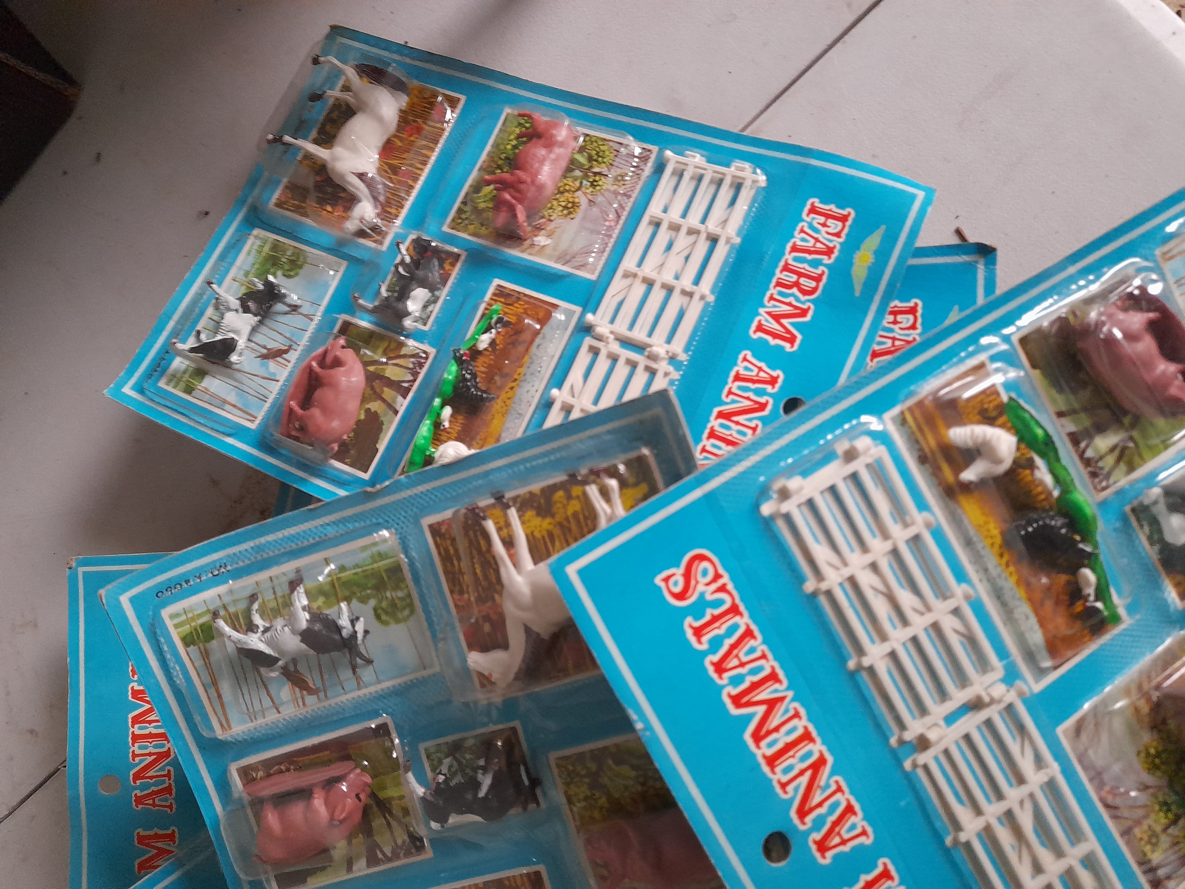 This lot features multiple vintage Farm Animals figurine playsets produced by an unidentified manufacturer, distinguished by a winged star logo on the header. These sets are constructed from moulded plastic and represent classic dime store rack toys from the 1970s to 1980s era. Each set is a static display containing approximately seven to eight animal figurines, including horses, pigs, and cows, accompanied by two interlocking white plastic fence sections. The items are New Old Stock, housed in their original factory blister pack cards which feature a vibrant blue background and individual illustrated compartments for the contents.