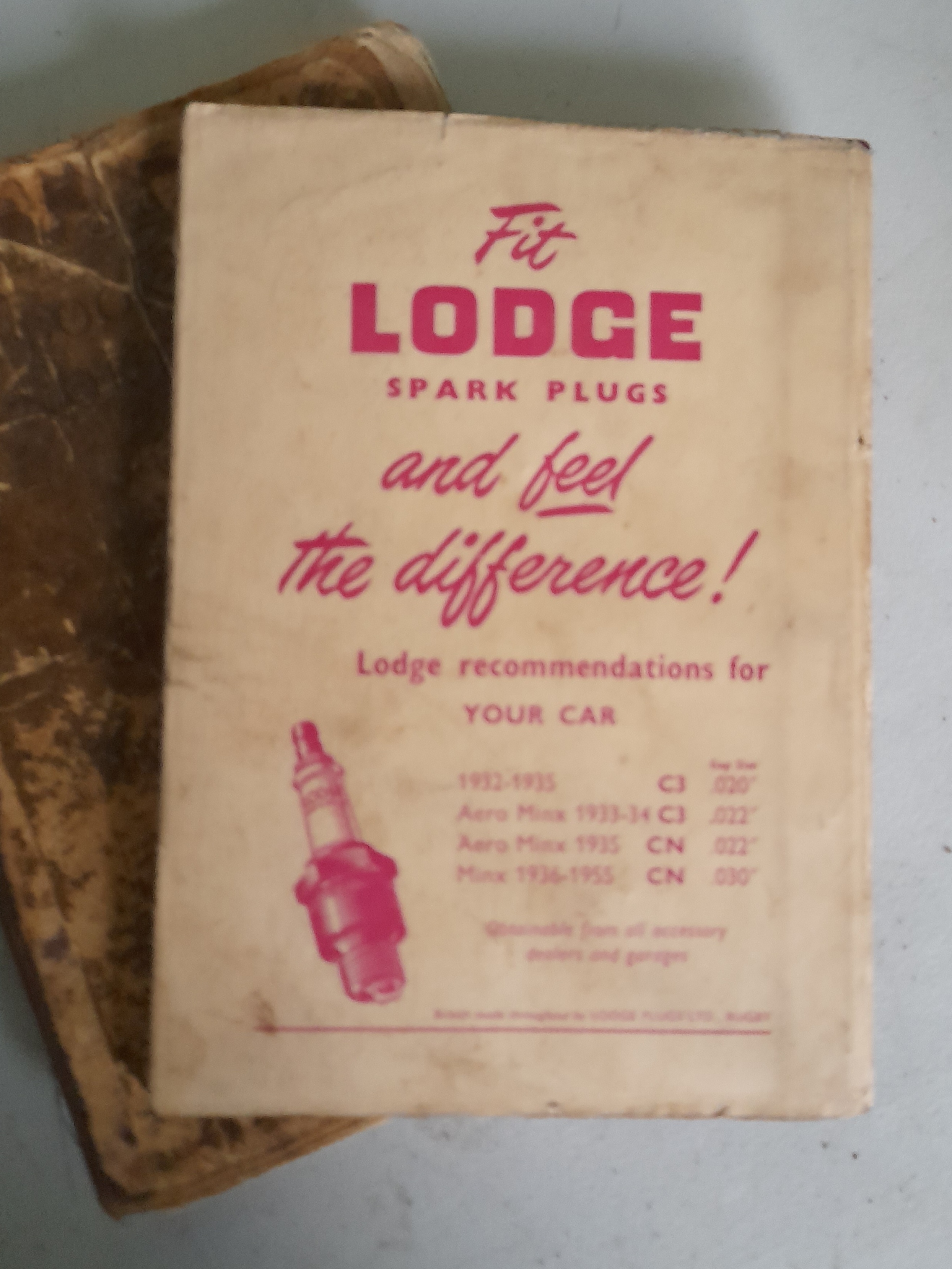 This lot features two original mid-20th century pieces of British automotive ephemera. The primary item is a copy of The First Hillman Minx Handbook from the Pitman’s Motorist’s Library series, specifically for 1932-47 side-valve models. The red card cover displays a central graphic of a steering wheel encircling engine components and tools, with text reading THE FIRST HILLMAN MINX HANDBOOK (1932-47 SIDE-VALVE MODELS) and PITMAN’S MOTORIST’S LIBRARY. The reverse features a full-page advertisement for Lodge Spark Plugs with a recommendation chart for Hillman models including the Aero Minx and models through to 1955, stating Fit LODGE SPARK PLUGS and feel the difference!. The second item is a promotional maintenance booklet titled Revive your NORTON with LODGE SPARK PLUGS. These are authentic period items produced in the United Kingdom, with the Hillman guide published by Pitman and the Lodge advertisement noting production by Lodge Plugs Ltd. of Rugby. Dimensions: Approx. 18cm x 12cm.