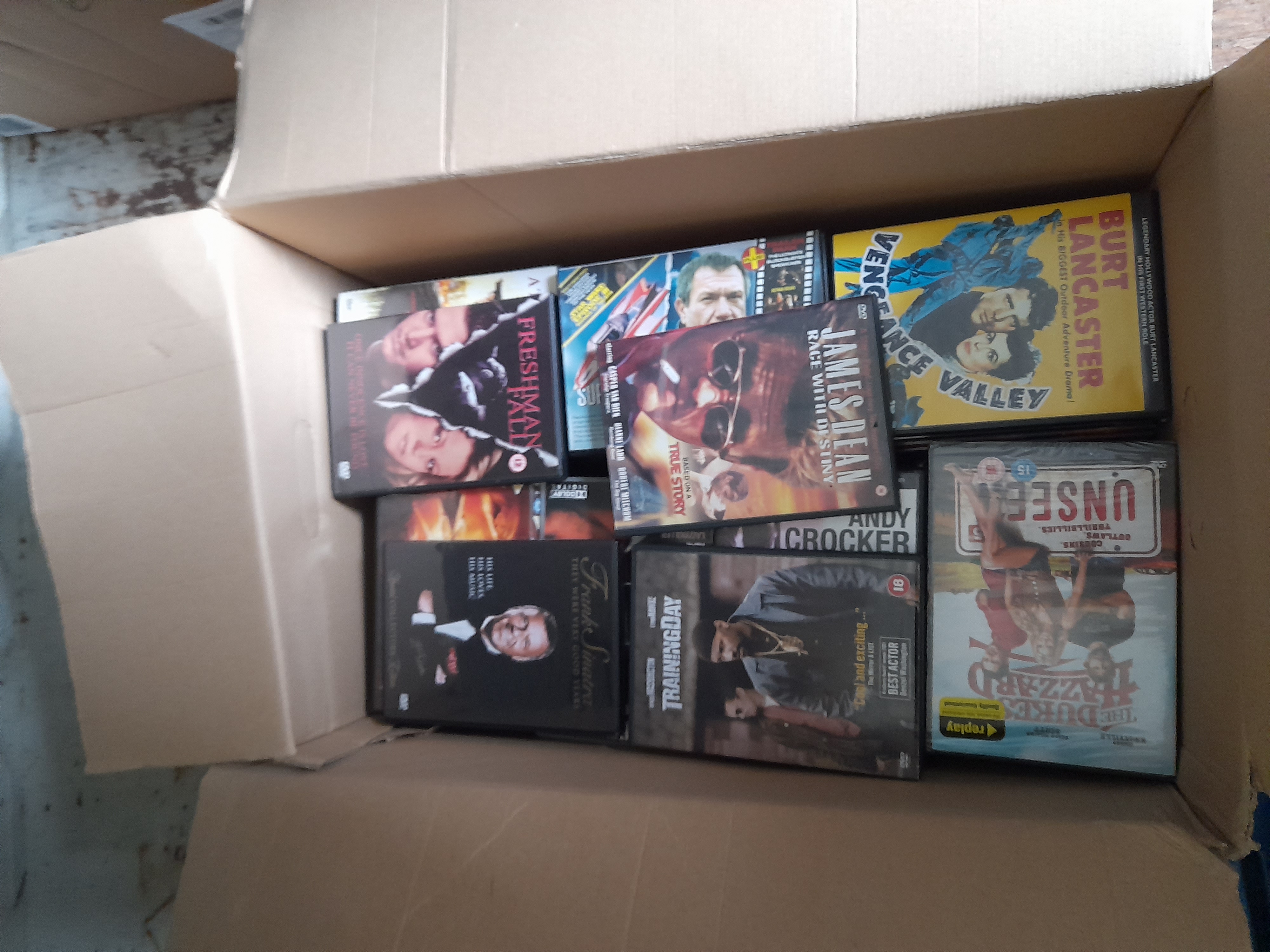 A comprehensive collection of feature films and documentaries on DVD, housed within a single cardboard shipping container. The assembly includes a diverse range of titles such as Training Day, James Dean: Race with Destiny, Vengeance Valley featuring Burt Lancaster, The Freshman, and a Frank Sinatra-themed release. The media is contained within standard plastic cases with original lithographed paper inserts. Of particular note is a copy of The Dukes of Hazzard which remains in its original factory-sealed shrink-wrap. The collection reflects the era of physical media distribution by various major film studios and independent publishers from the late 20th and early 21st centuries. Box dimensions approximately 40 cm x 30 cm x 25 cm.