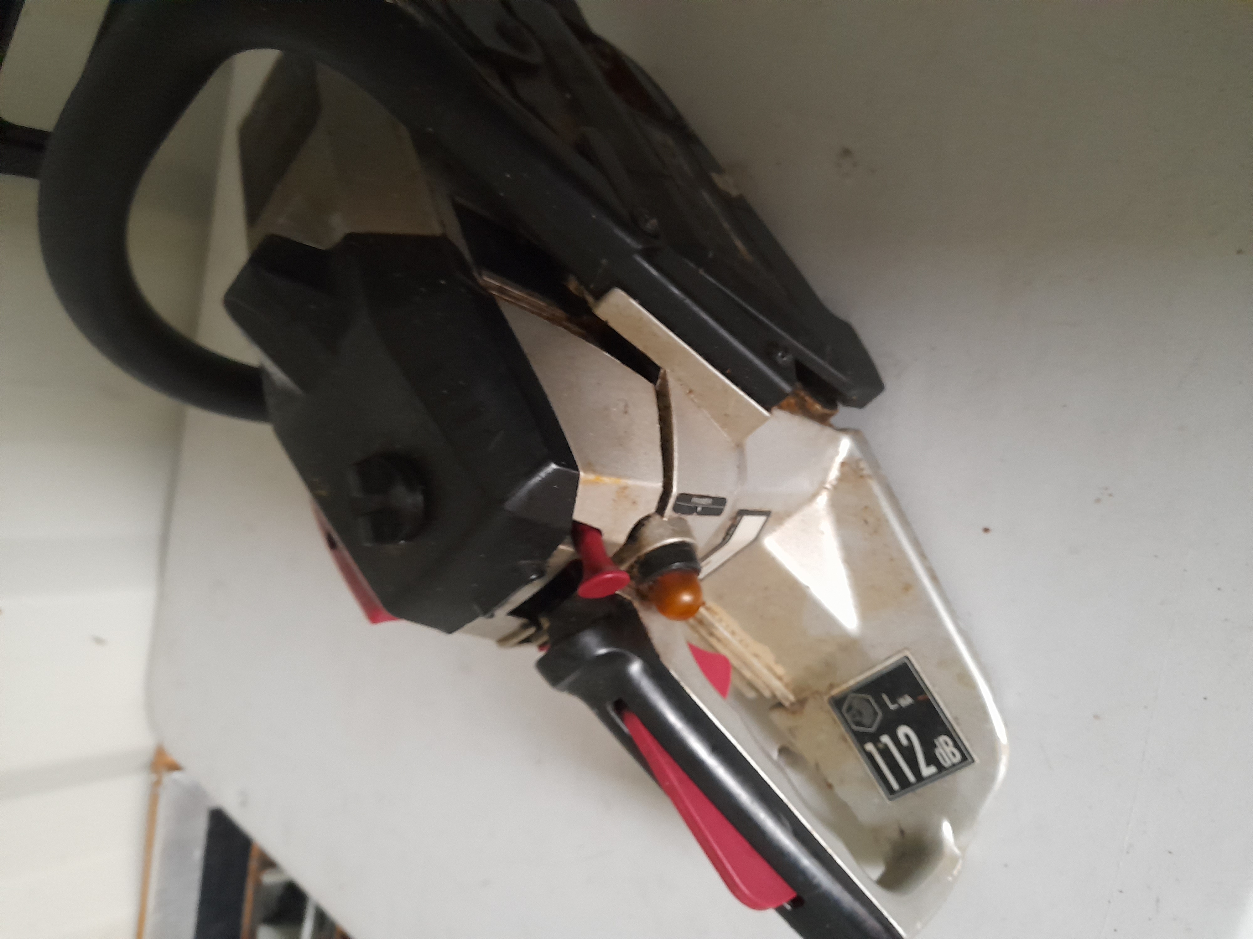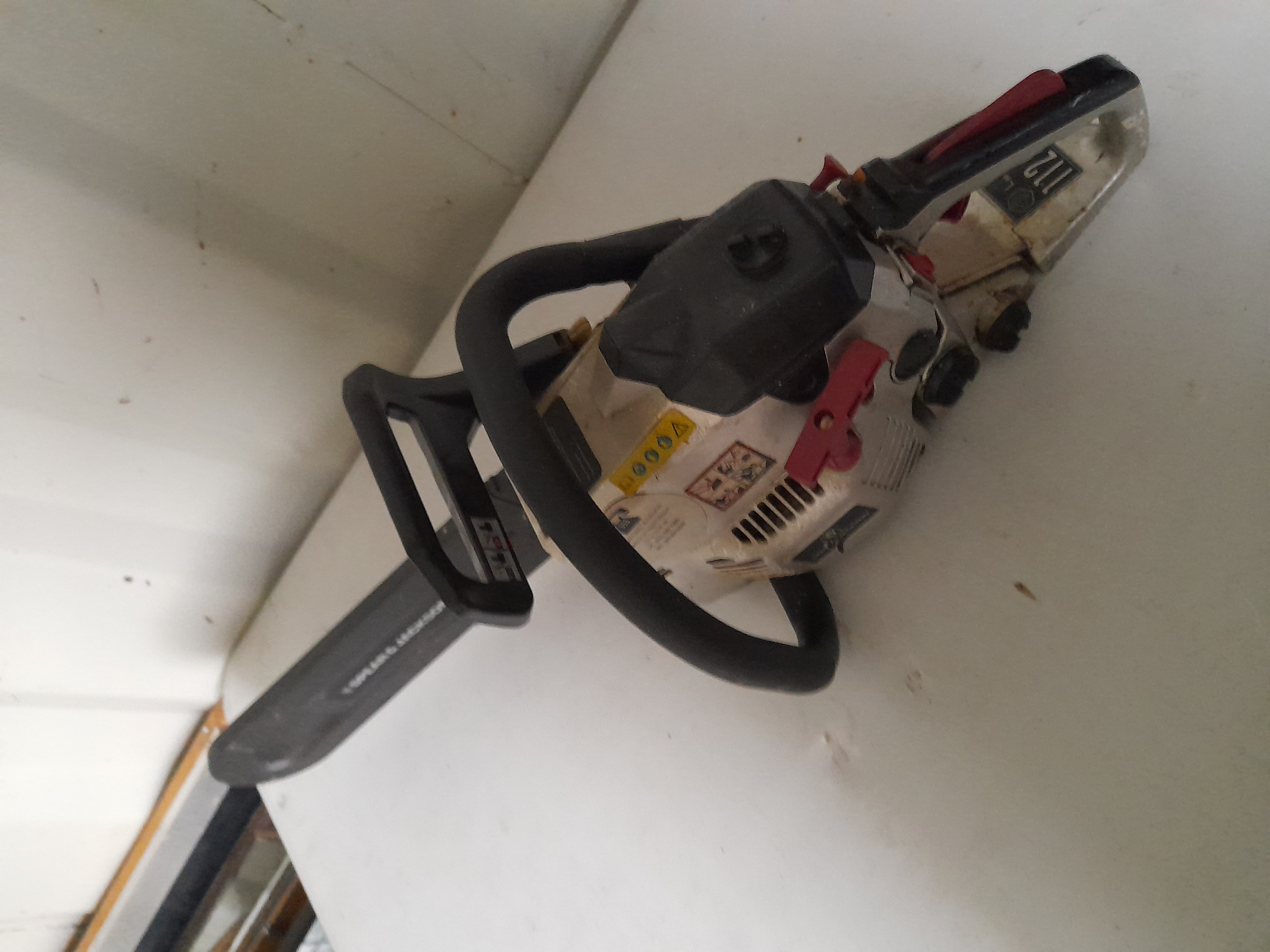 A Spear and Jackson petrol chainsaw featuring a white and black body with red accents and a black guide bar cover.