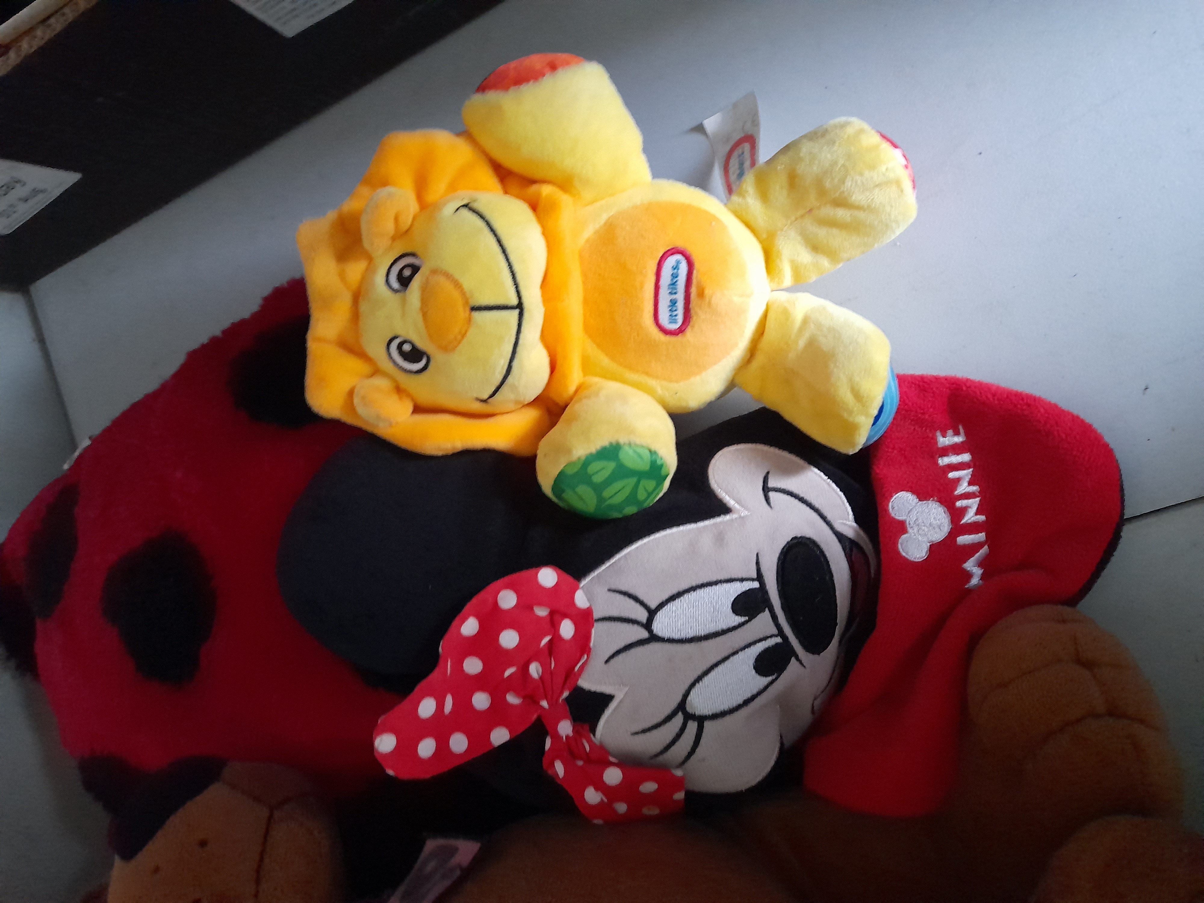 A collection of plush toys in various colours featuring a Little Tikes lion, a Minnie Mouse cushion, Scooby-Doo, Wallace, and The Flash.