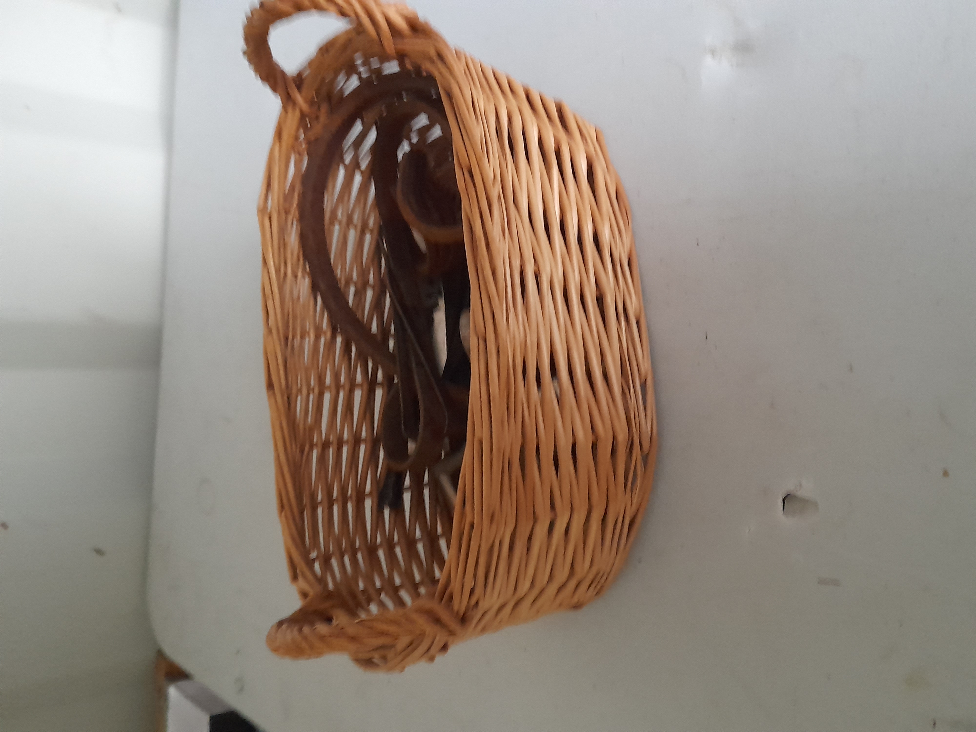 A collection of miscellaneous rusted and silver-toned metal tools and hardware contained within a brown woven wicker basket with handles.