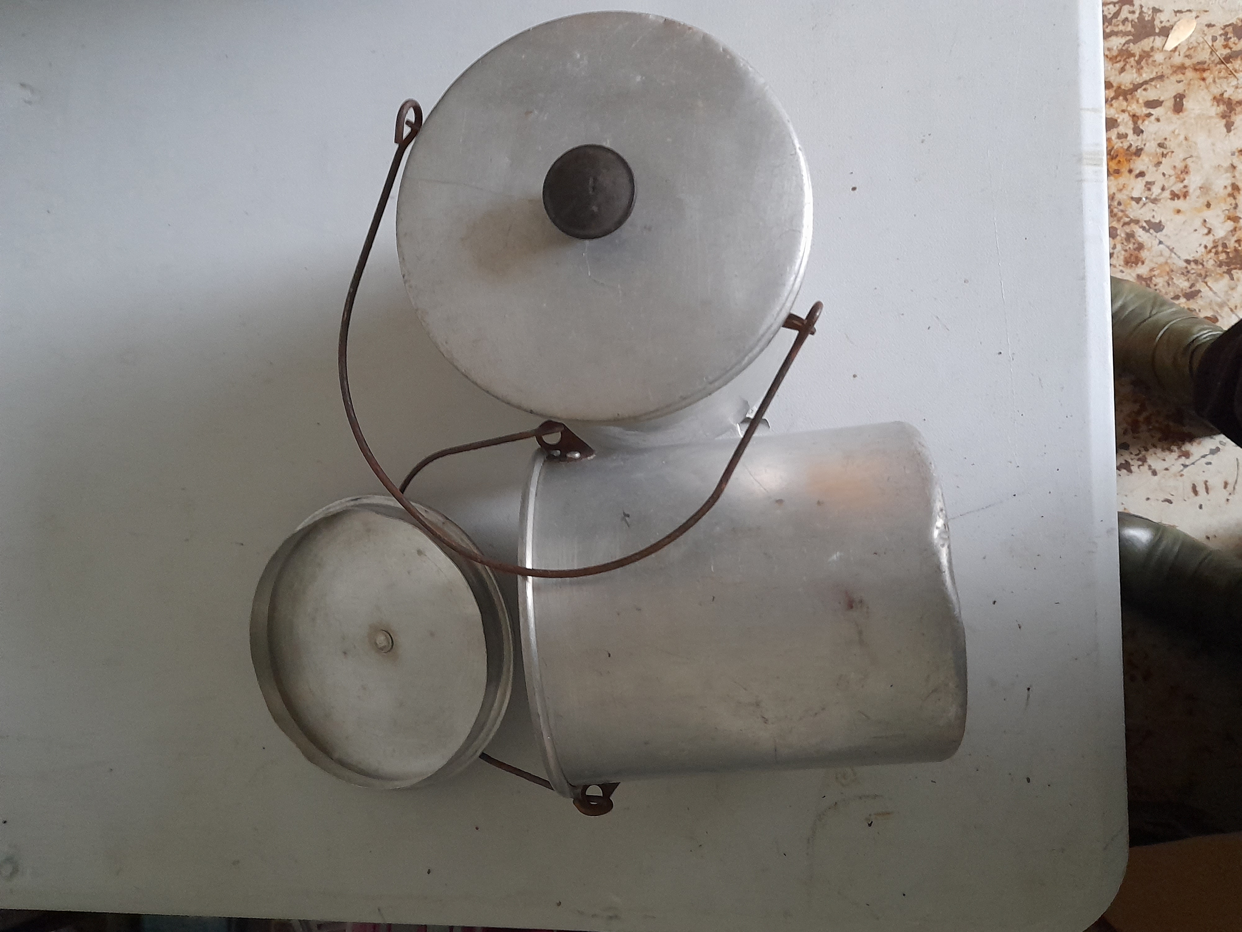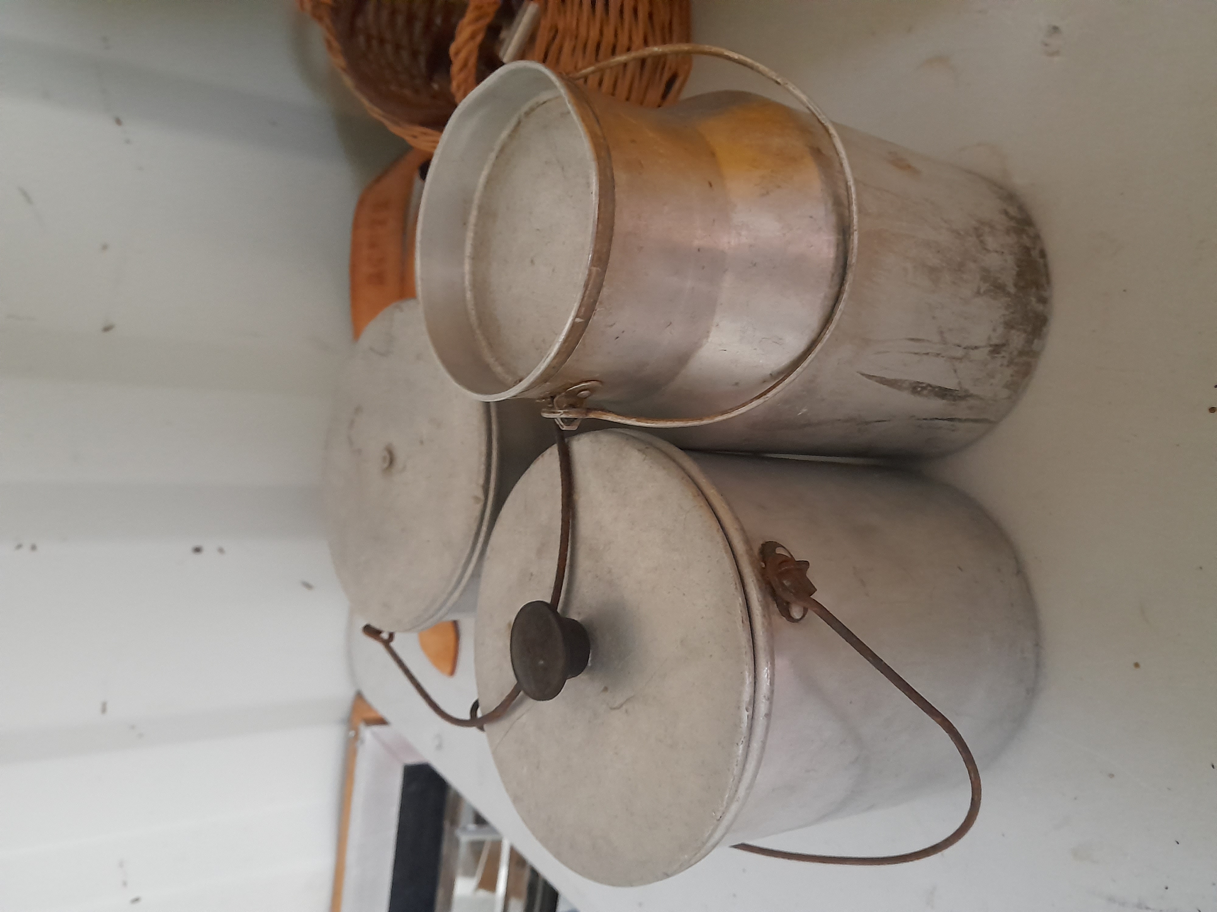 A collection of several silver-coloured aluminium canisters and pots featuring wire handles, lids, and a milk-churn style vessel.