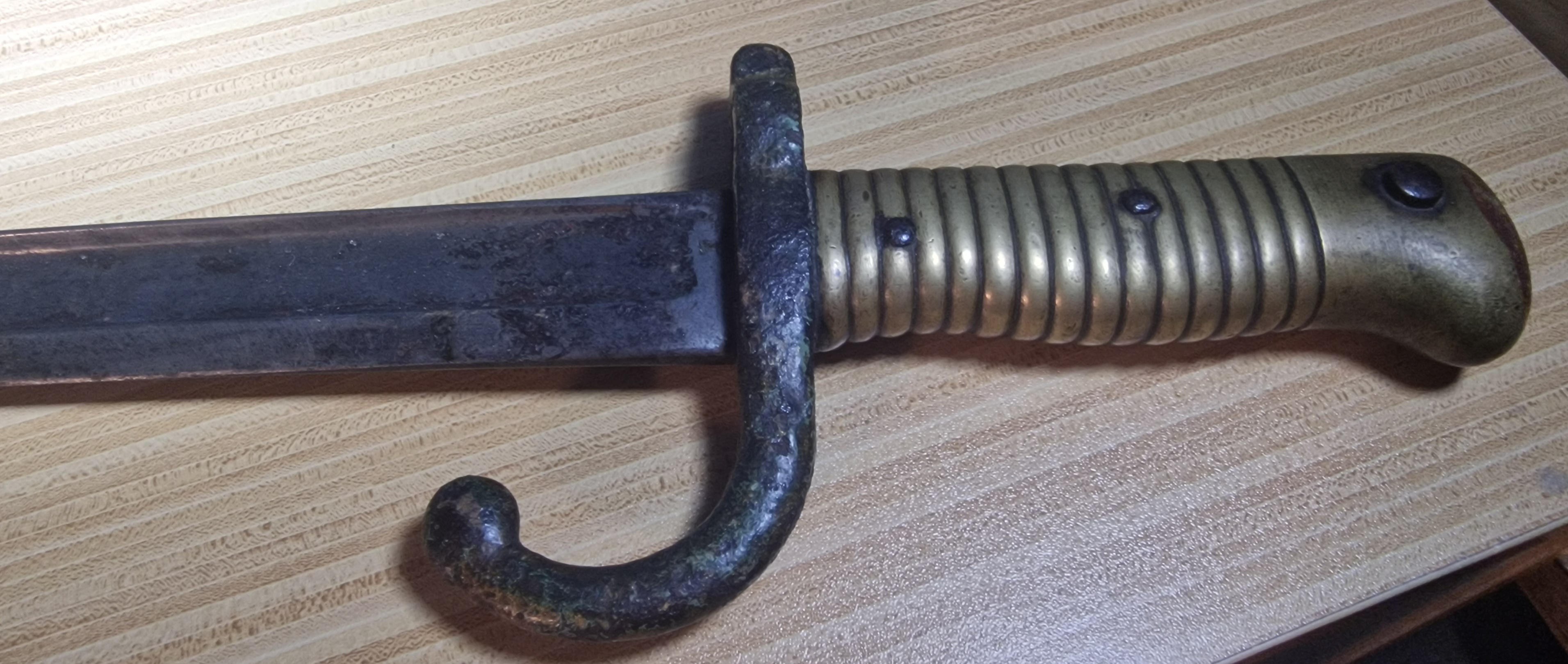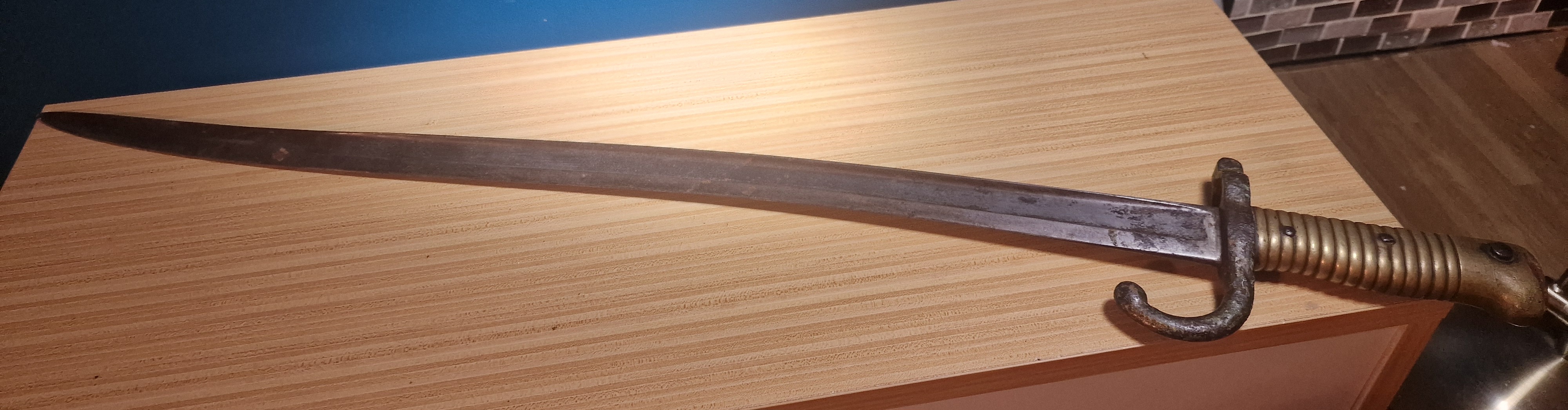 Offered here is a classic French Épée-Baïonnette Modèle 1866, designed for use with the Chassepot rifle. This bayonet features a yataghan-style curved blade measuring approximately 57 cm (22.5 inches), with a total length of approximately 69 cm (27 inches) when sheathed.