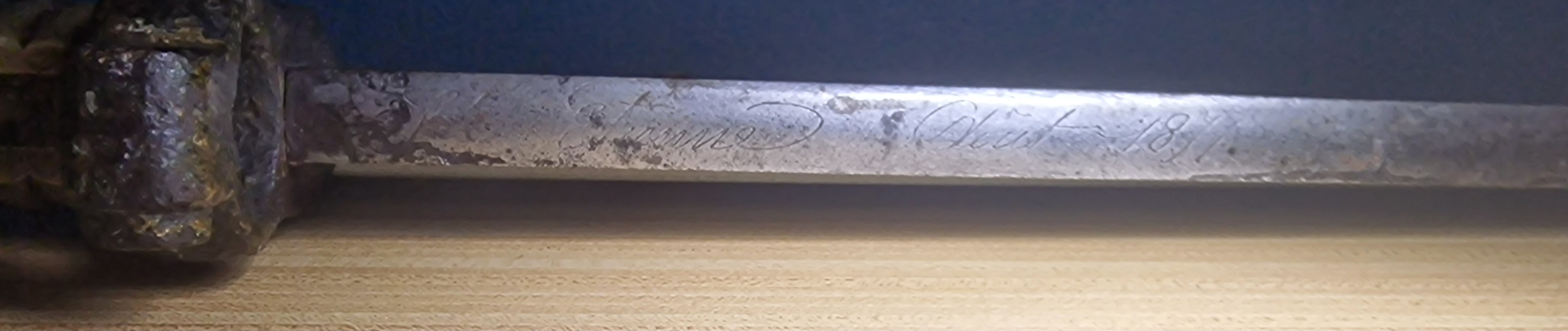 Scabbard: Original steel scabbard, blued finish, with some light pitting and minor dents consistent with age.