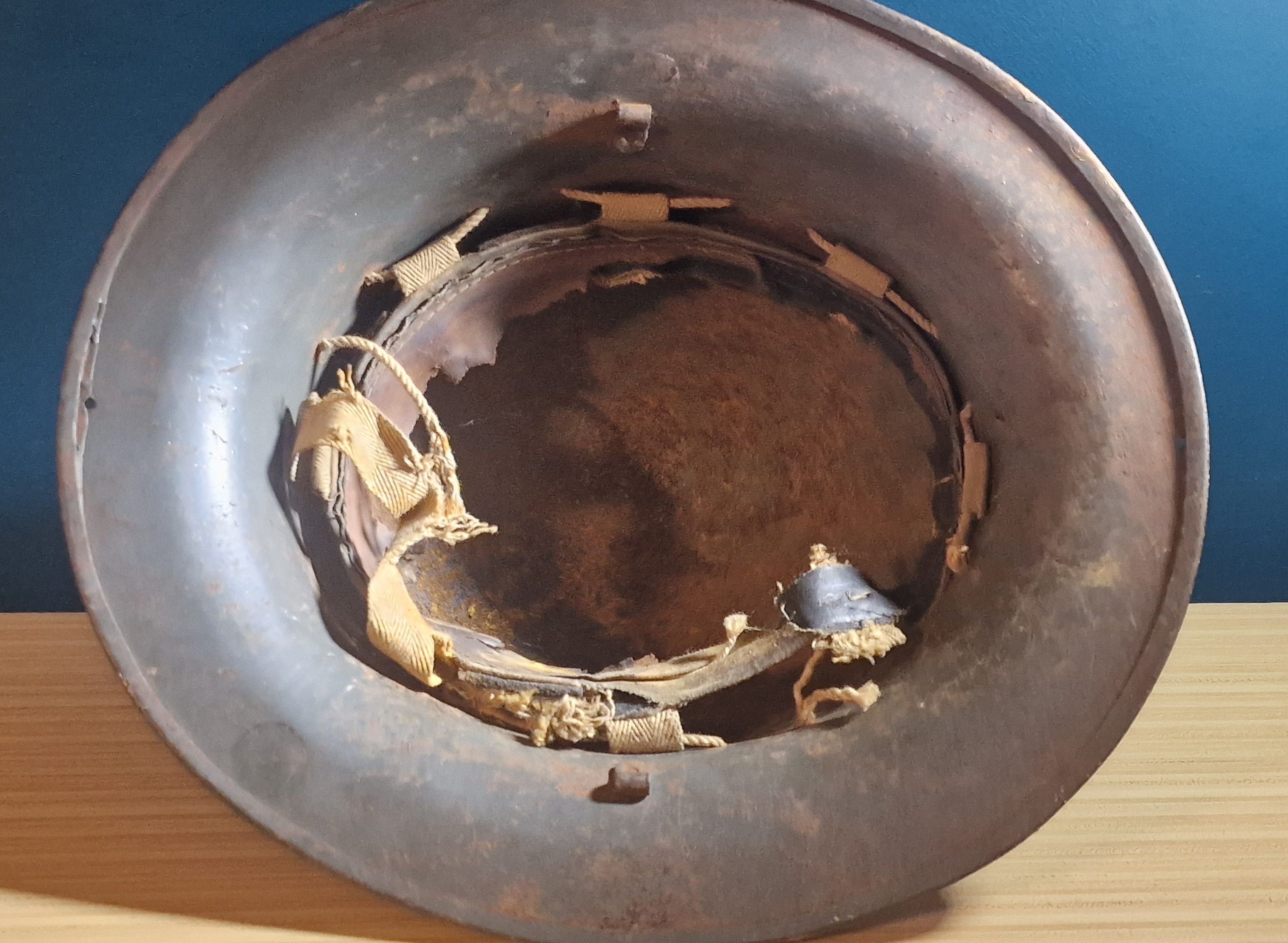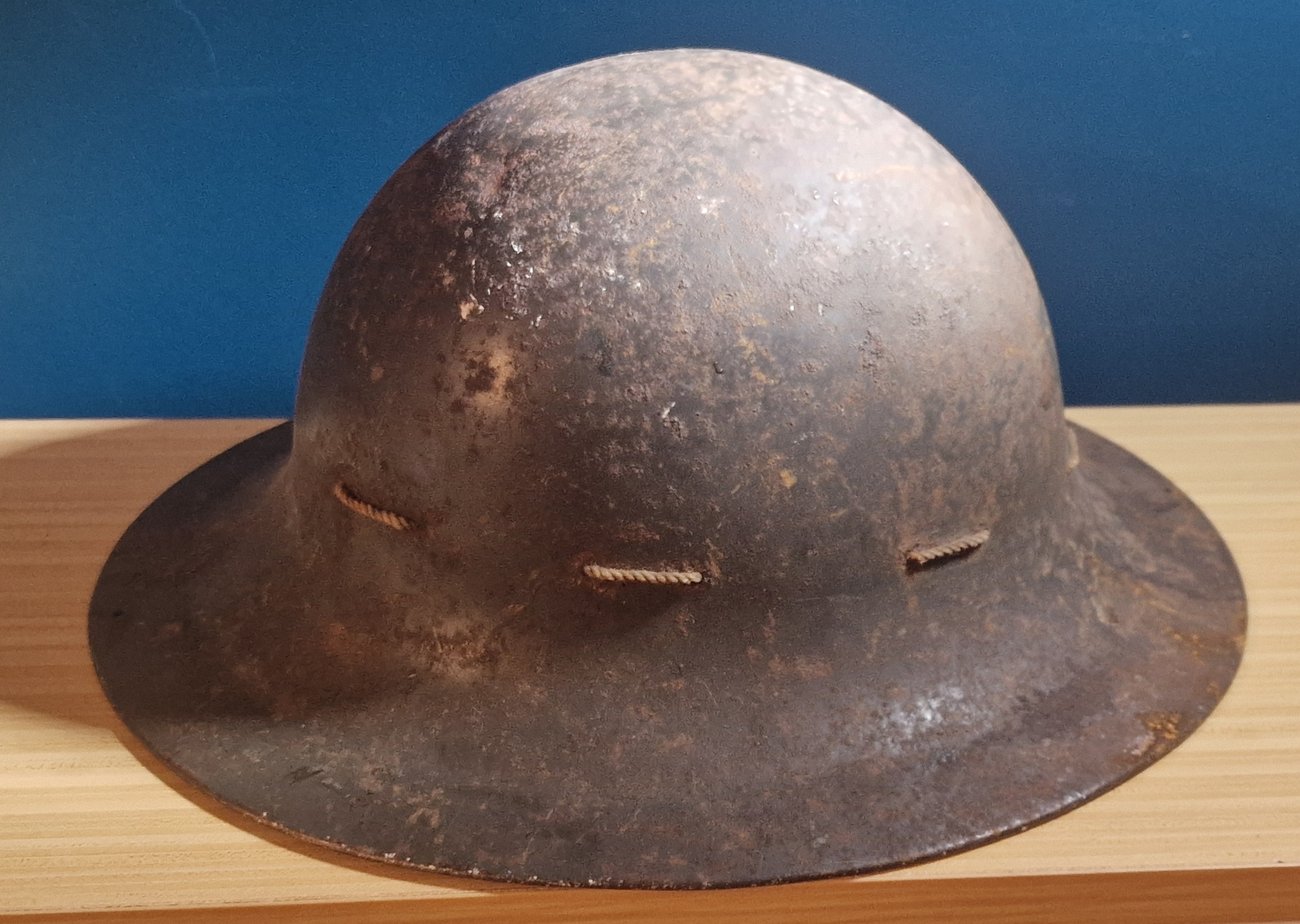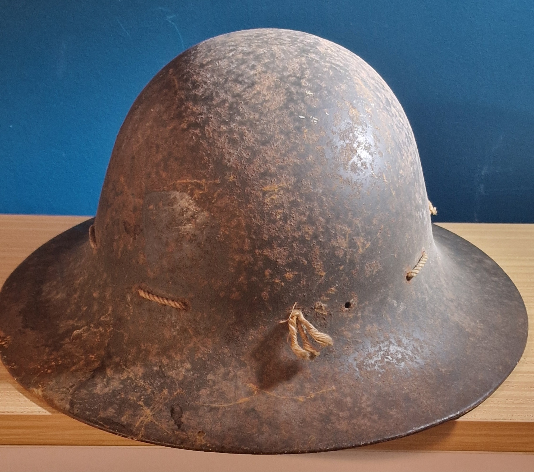 An original wartime Zuckerman helmet issued for Home Front Civil Defence use during World War II. This example is in as-found condition, untouched and retaining its original factory paint, now showing surface rust, dirt, and grime consistent with decades of storage.