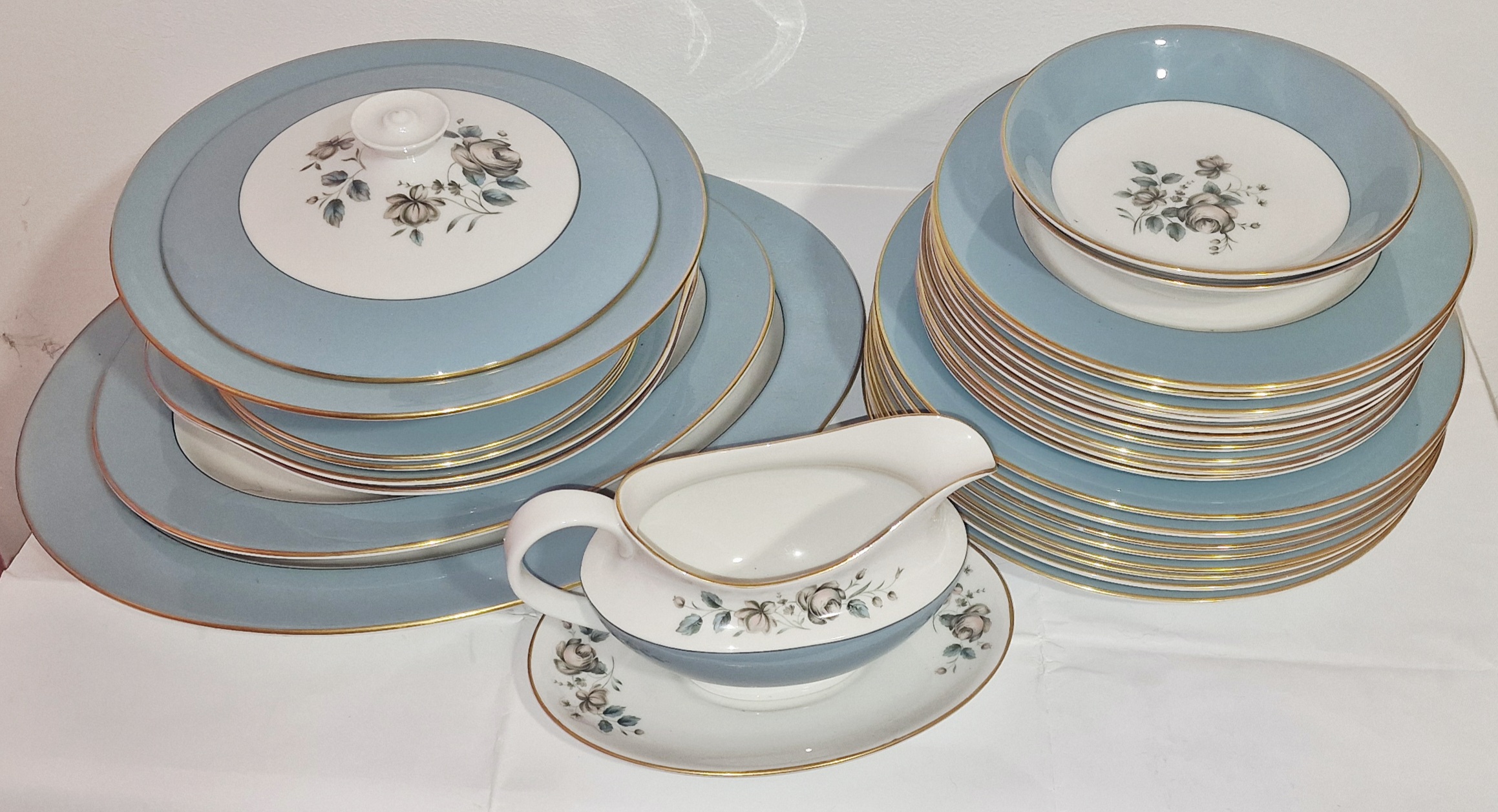 A beautiful and highly collectible 28-piece dinner service by Royal Doulton, featuring the discontinued “Rose Elegans” pattern (T.C.1010). This timeless design combines a soft teal blue band with delicate pink rose clusters and fine detailing, bringing a refined vintage charm to any table setting.