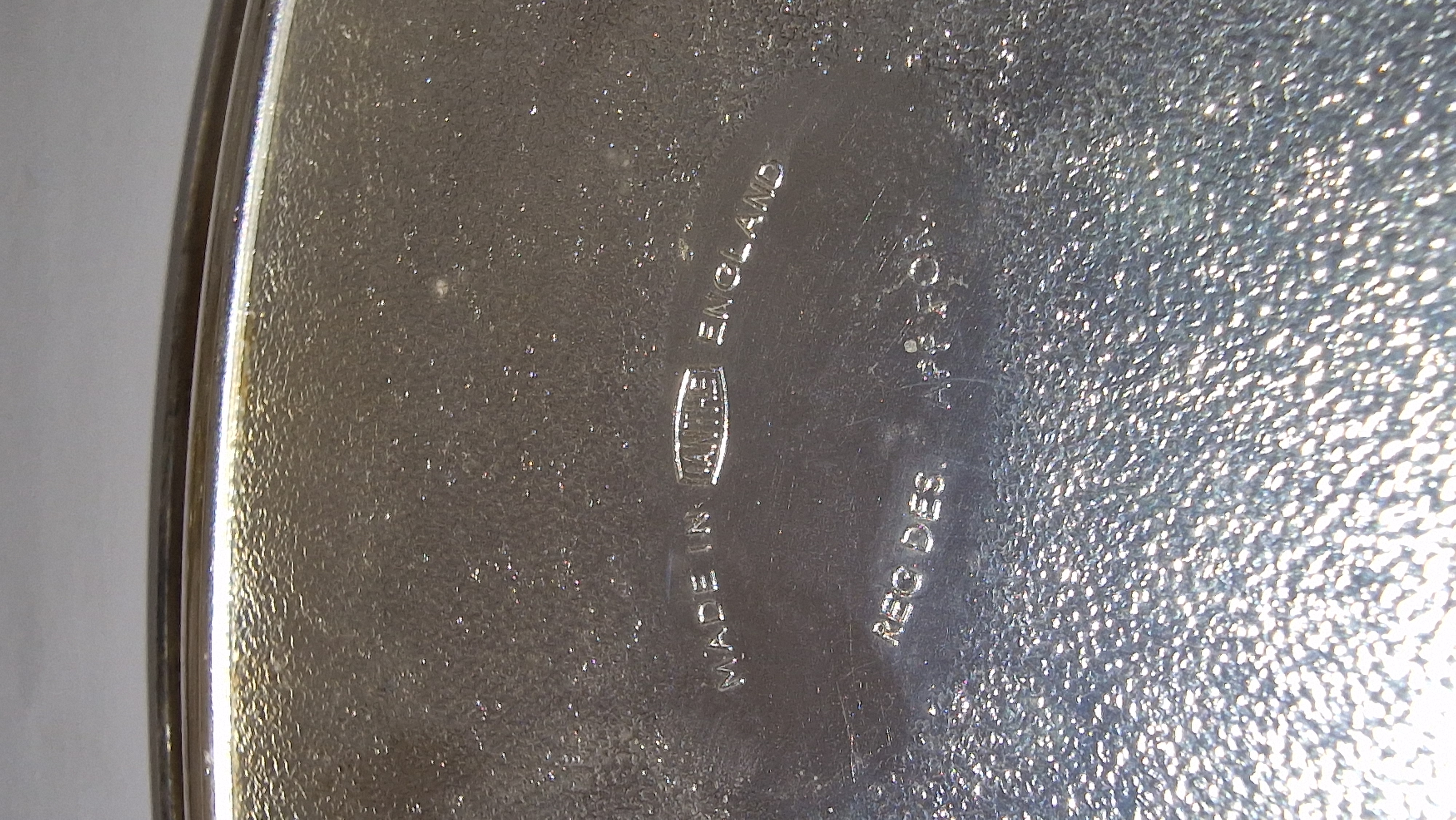 A classic set of silver plated tableware comprising a sugar bowl with matching spoon, cream jug, and serving platter, all stamped Made in England. This traditional grouping is complemented by a silver tone three-candle centrepiece candelabra, adding a decorative and functional element for elegant dining or display.
