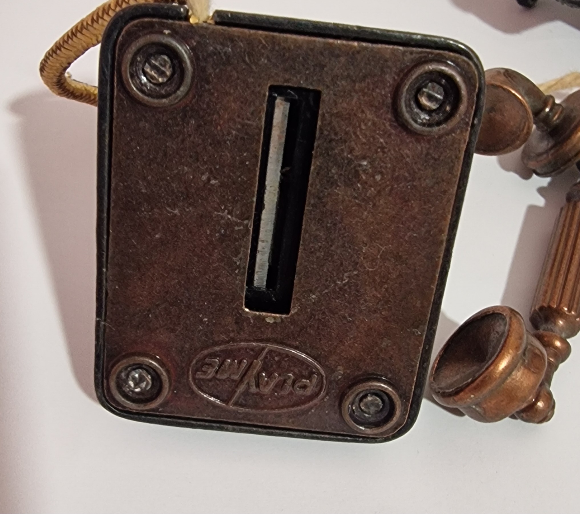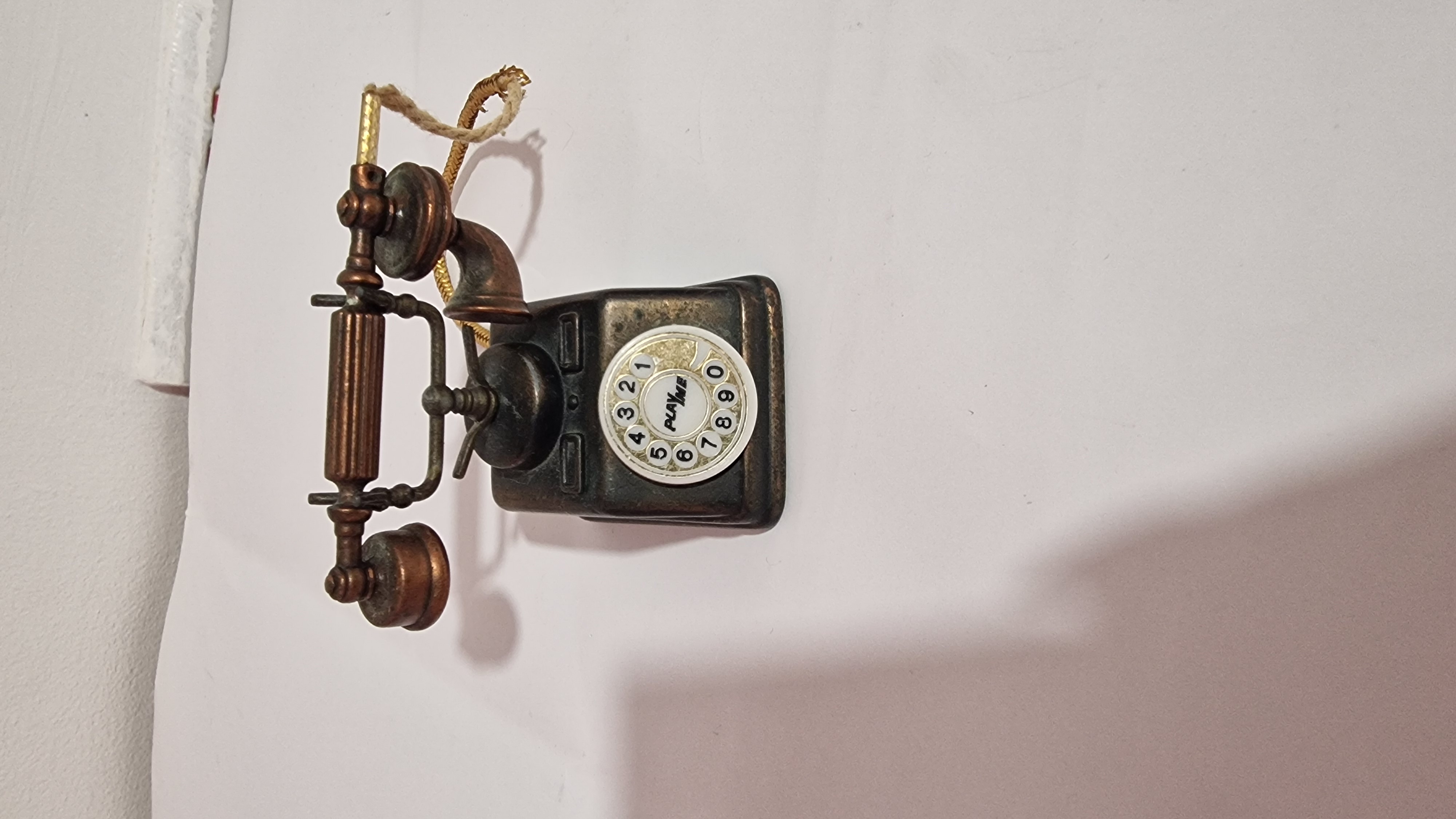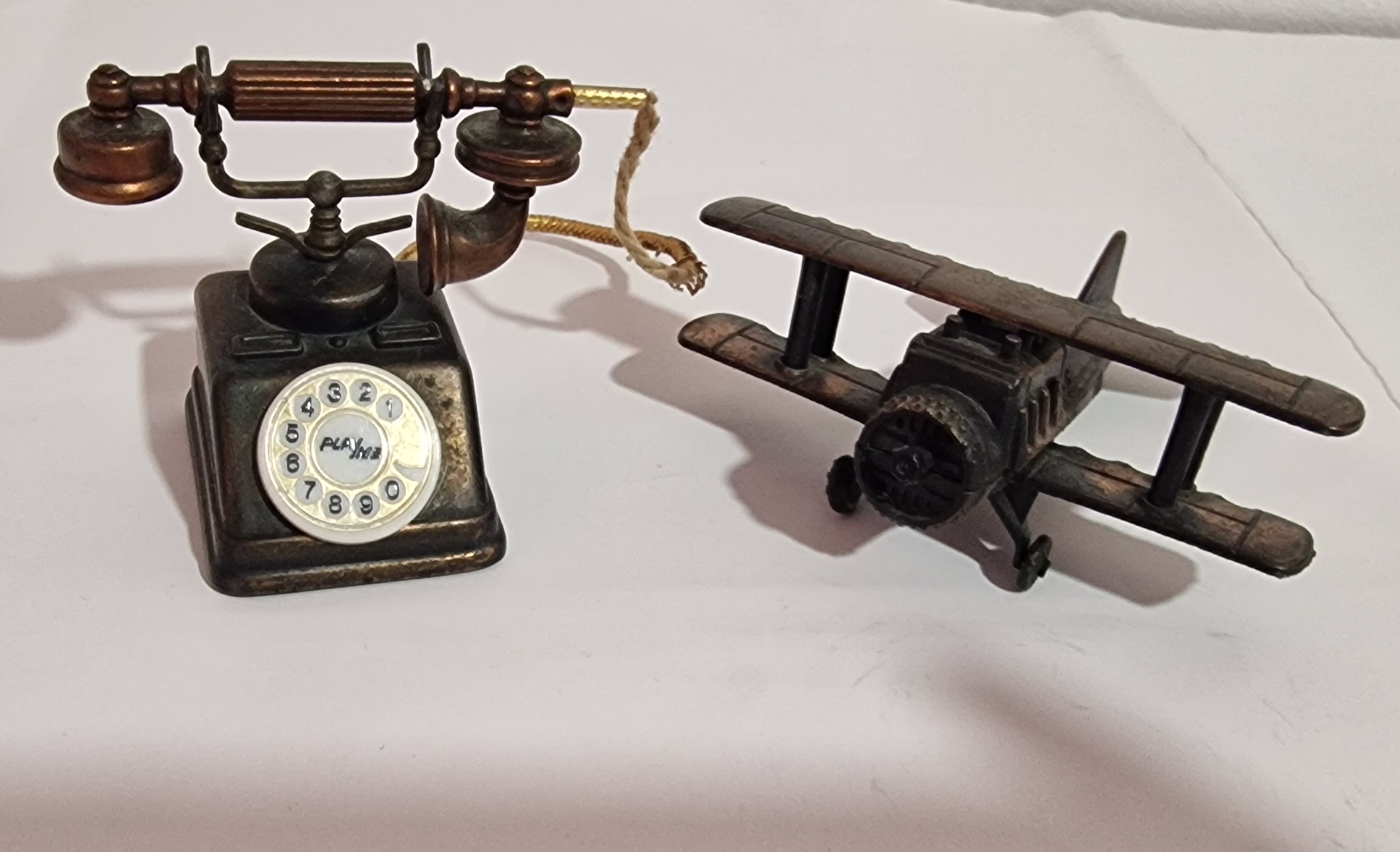 A collectible pair of vintage die-cast metal pencil sharpeners from the 1970s, made by Playme. This lot includes a classic desk telephone model and a metallic-toned biplane design. Both items reflect the novelty and craftsmanship typical of mid-century stationery and toy crossovers.