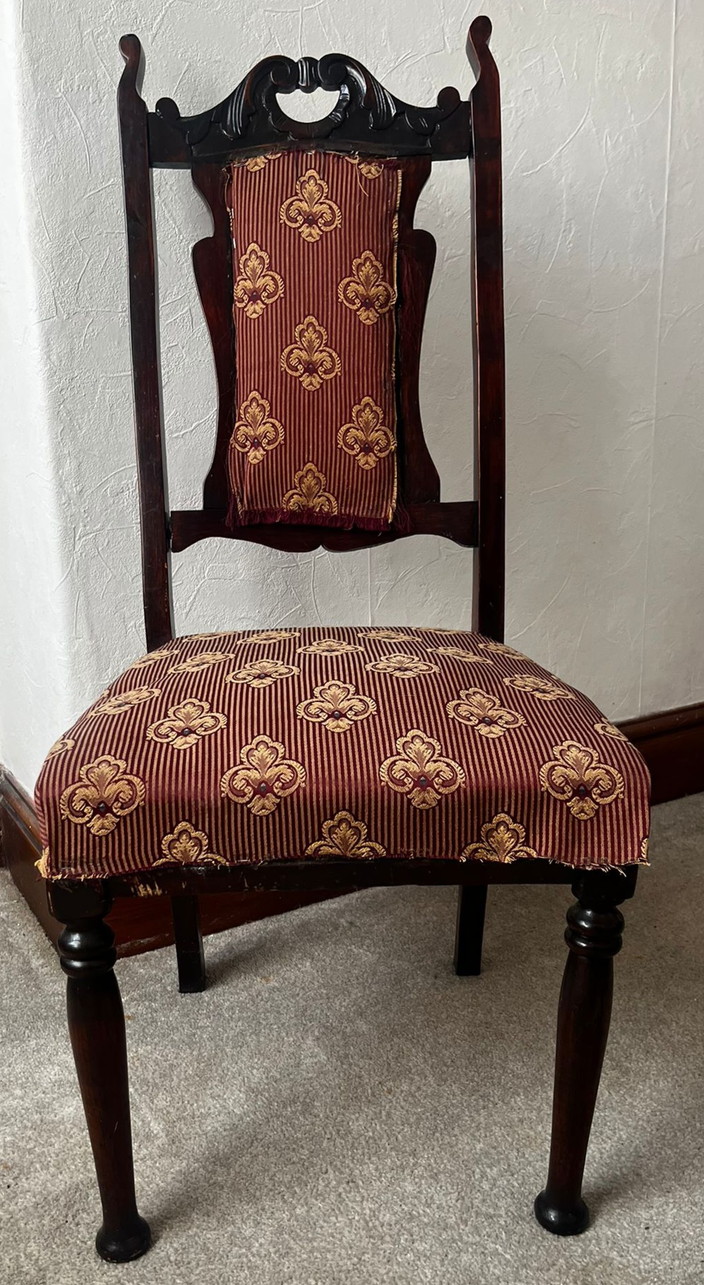 A decorative late Victorian walnut hall chair, featuring a finely carved frame with elegant cabriole front legs and straight rear legs. Upholstered in a rich red and gold fabric, which may not be original and could benefit from refurbishment.