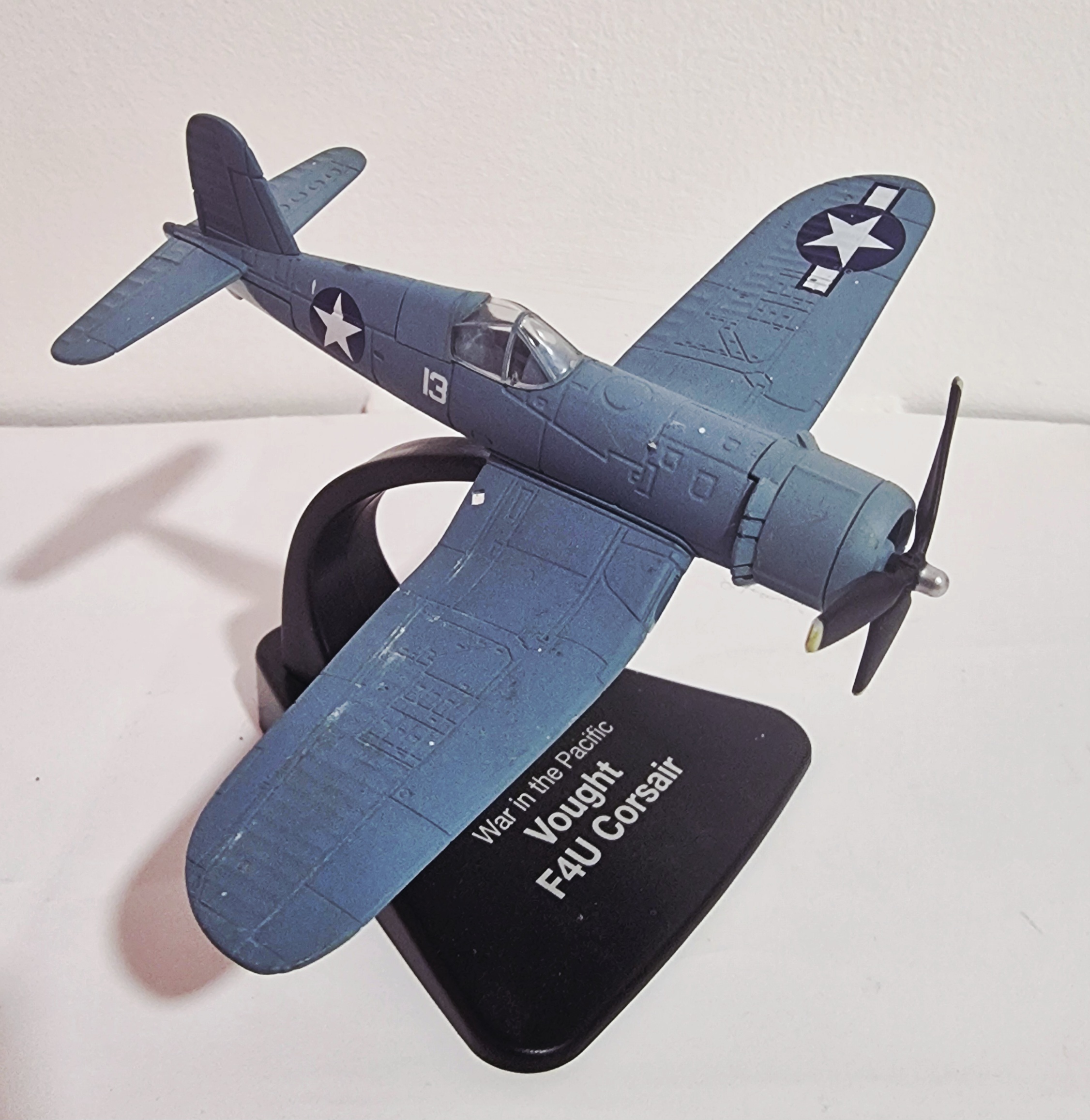 A finely crafted scale model of the Vought F4U Corsair, produced by Atlas Editions and mounted on a display stand. The Corsair is a legendary American World War II fighter known for its distinctive gull wing design and powerful performance.