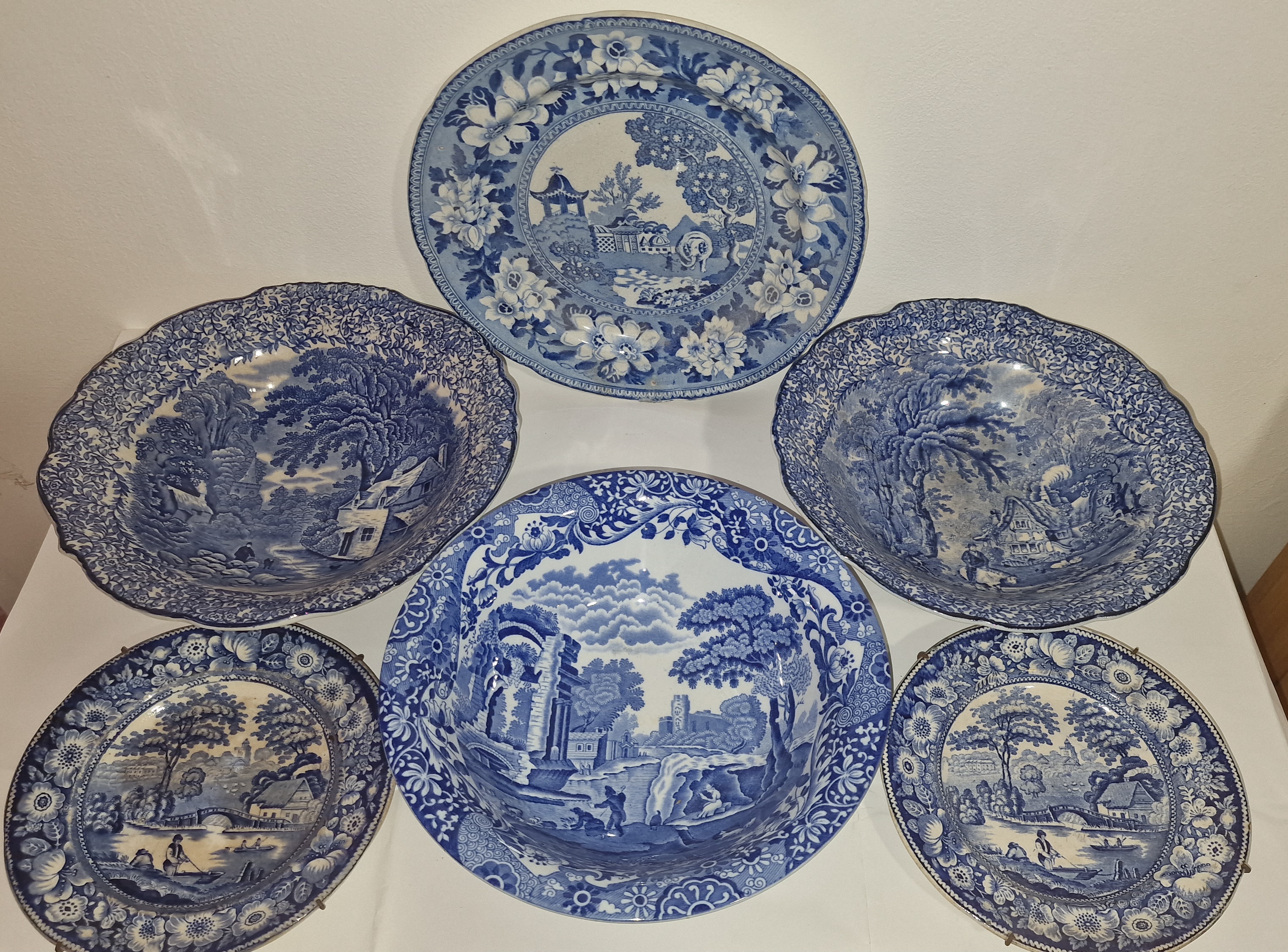 A charming selection of blue and white ceramic serving bowls and plates, featuring well-known makers such as Fenton and Spode. This lot includes: