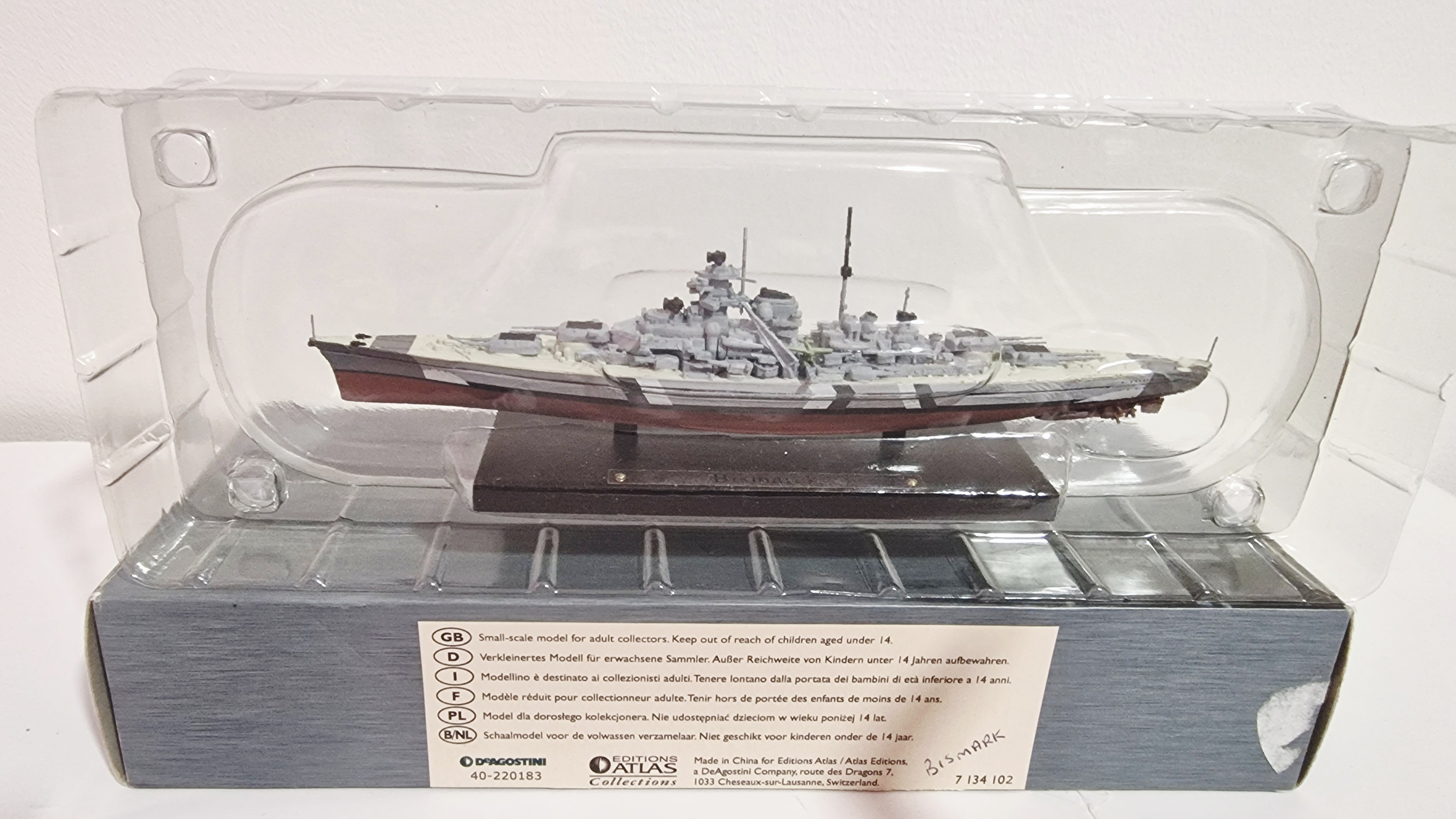 A detailed scale model of the German battleship Bismarck, produced by Atlas Editions, complete with its original presentation box.