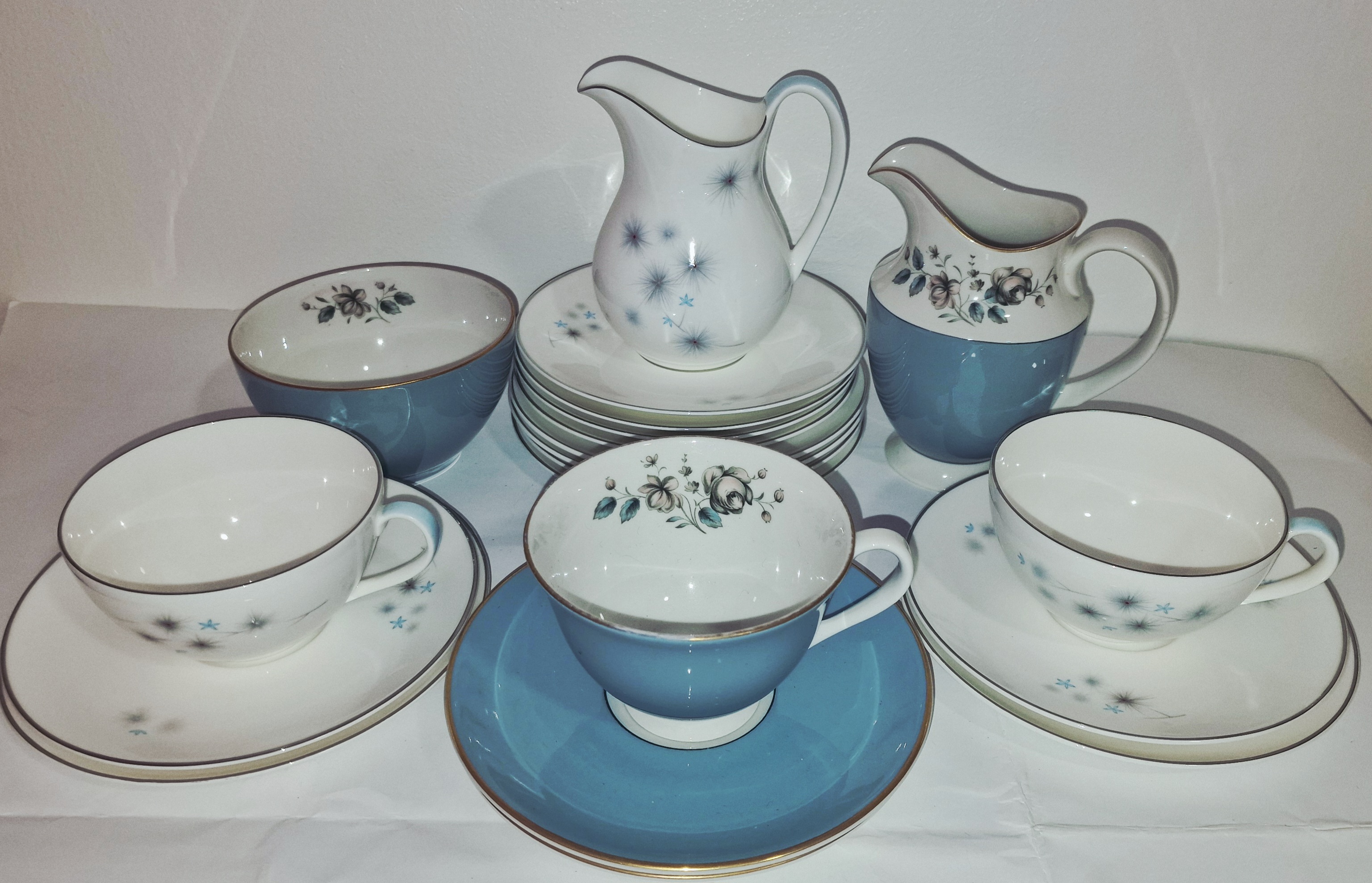 A charming collection of Royal Doulton part tea sets, featuring pieces from the Rose Elegance and Thistledown patterns. Perfect for collectors or those seeking to complement existing dinnerware with elegant vintage china.