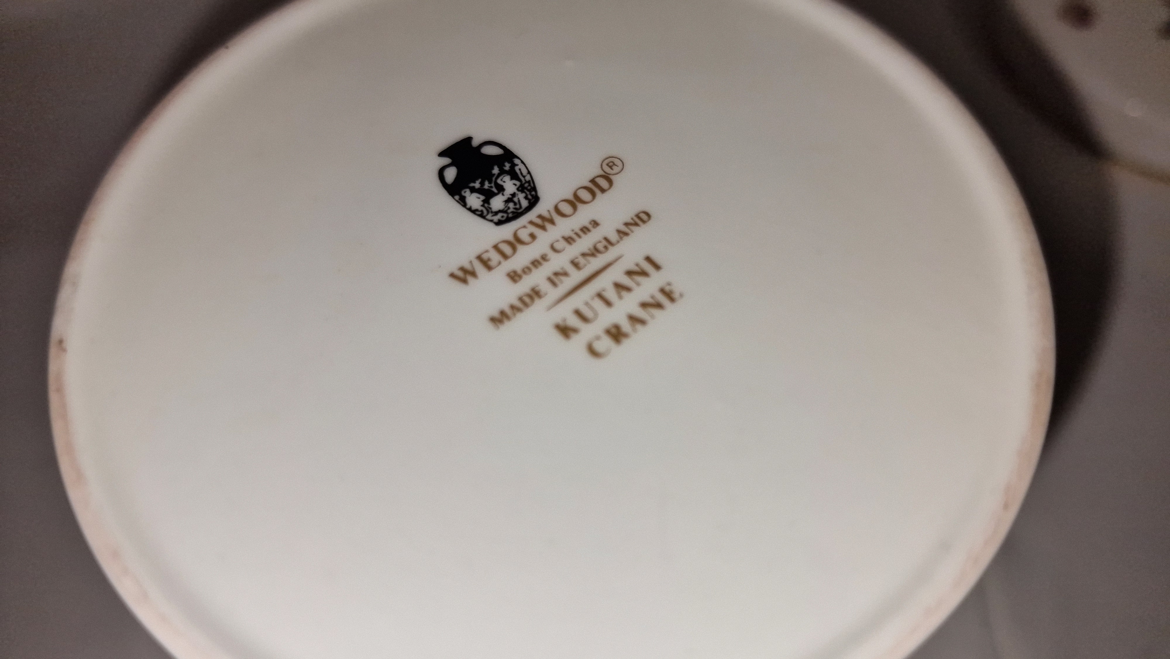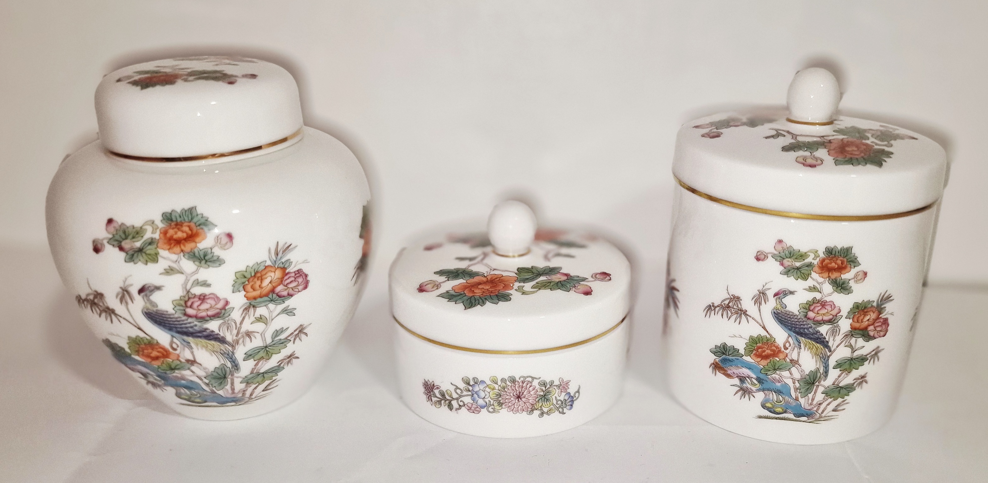A lovely set of three Wedgwood Kutani Crane lidded jars, including one ginger jar and two matching pots—one short and one tall—all featuring the elegant Kutani Crane pattern. Each piece is complete with its original lid.