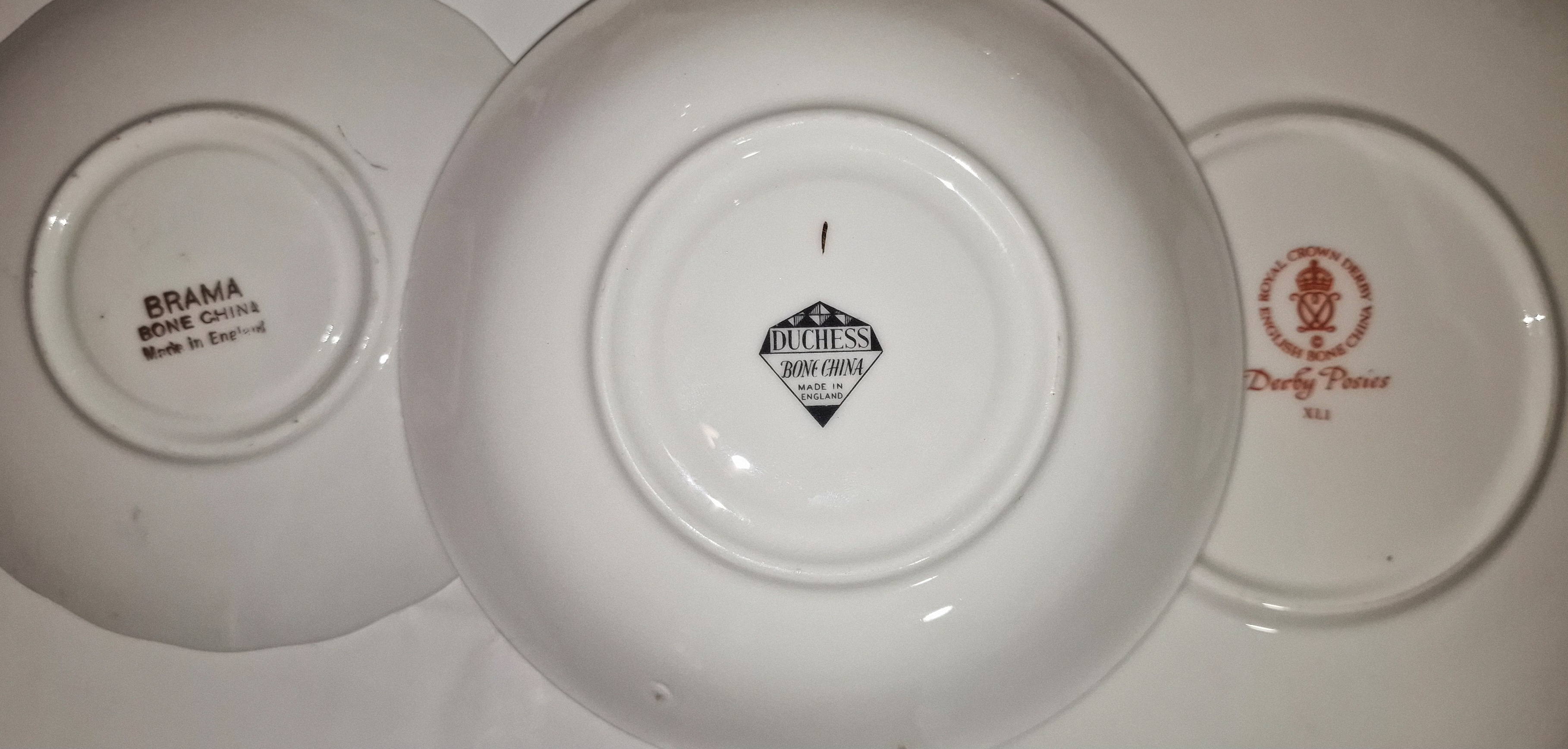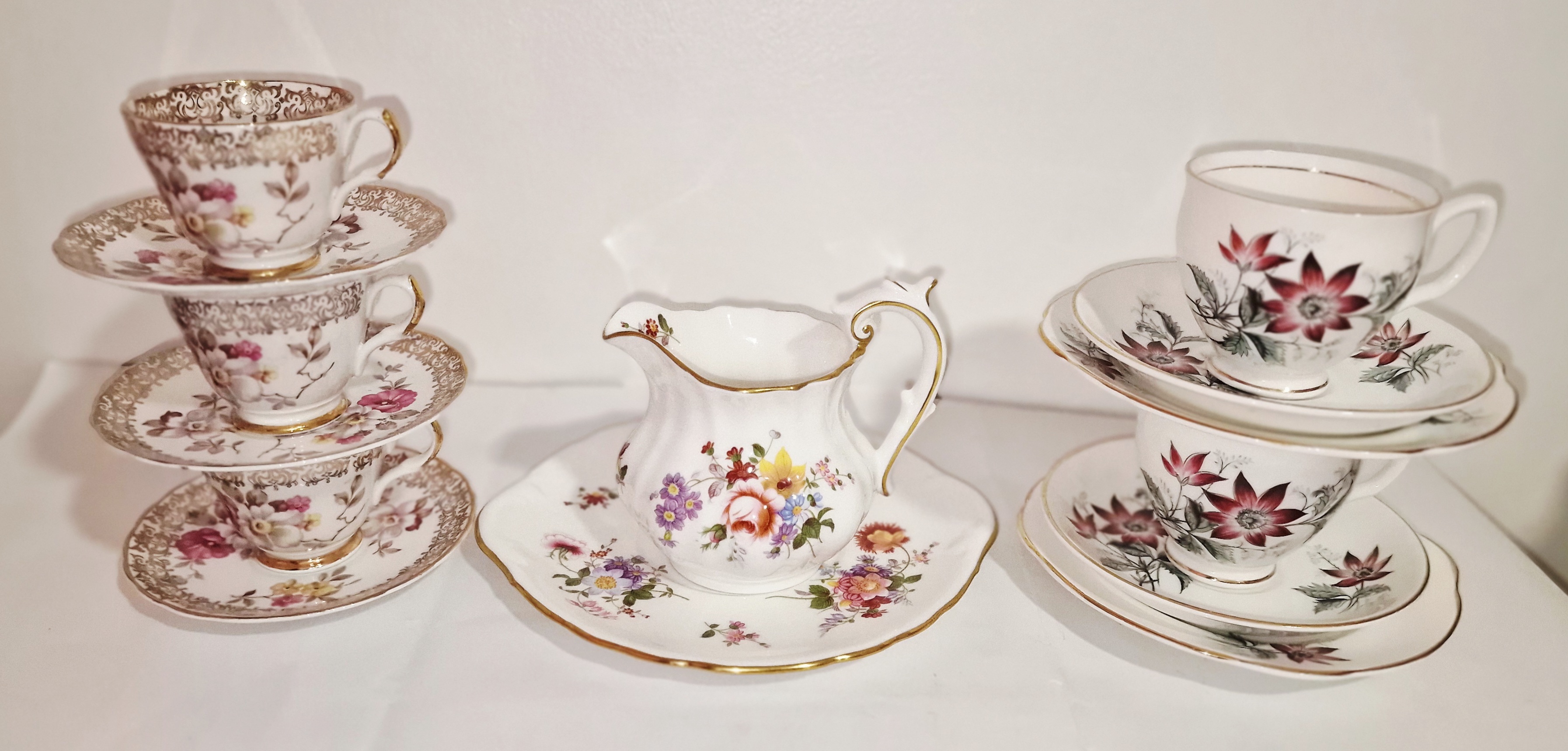 An exquisite selection of fine china featuring pieces from Duchess, Royal Crown Derby, and Brama. This lot includes three matching cup and saucer duos with stunning rose and gold detailing, a matching gold-rimmed milk jug and saucer adorned with a delicate flower design, plus two matching trios showcasing a charming pink flower pattern.