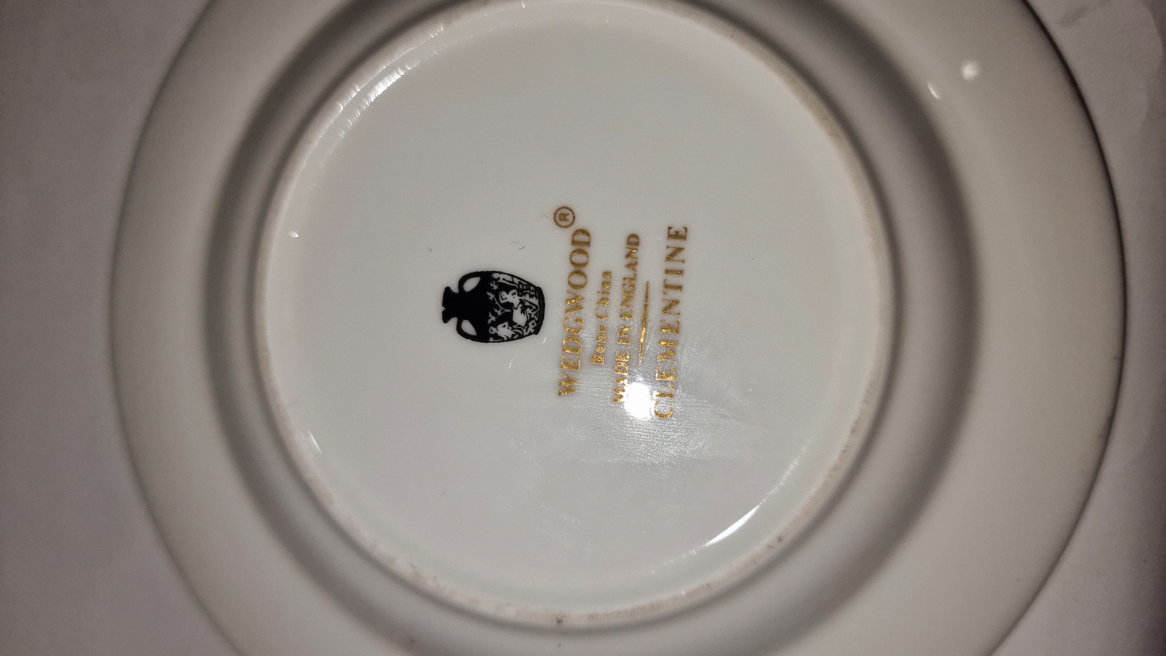 A charming collection of Wedgwood bone china featuring the elegant Clementine design. This set includes two matching side dishes, a lidded heart-shaped trinket dish, a lidded hexagon-shaped jar, a leaf-shaped trinket dish, a mug, a small hexagon pot, and a plate. The Clementine pattern is prized for its quality craftsmanship and versatile appeal, making it suitable for both collectors and everyday use.