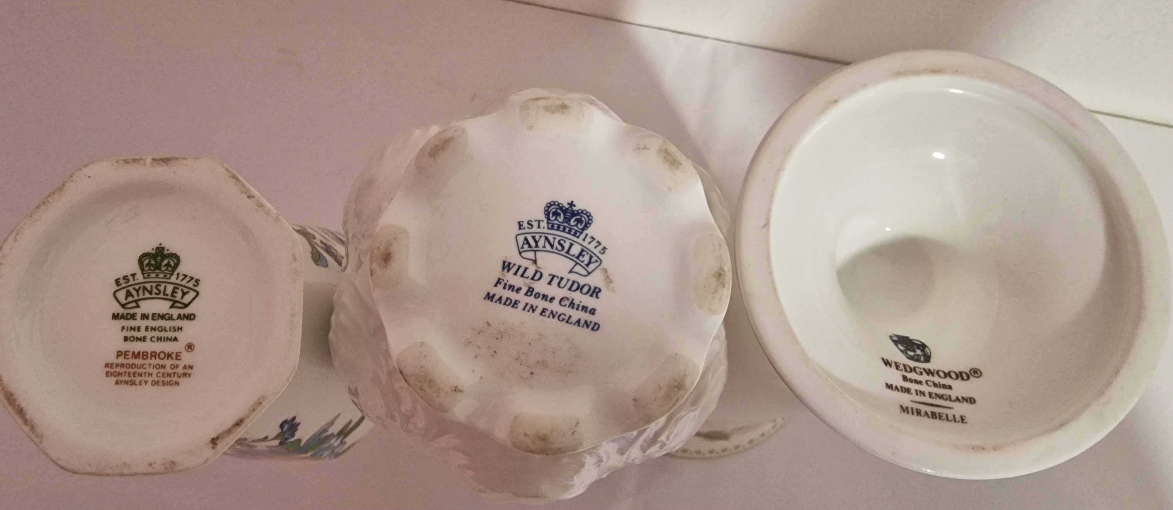 A beautiful lot of three vintage English bone china vases from renowned makers Aynsley and Wedgwood, featuring classic and collectible patterns: