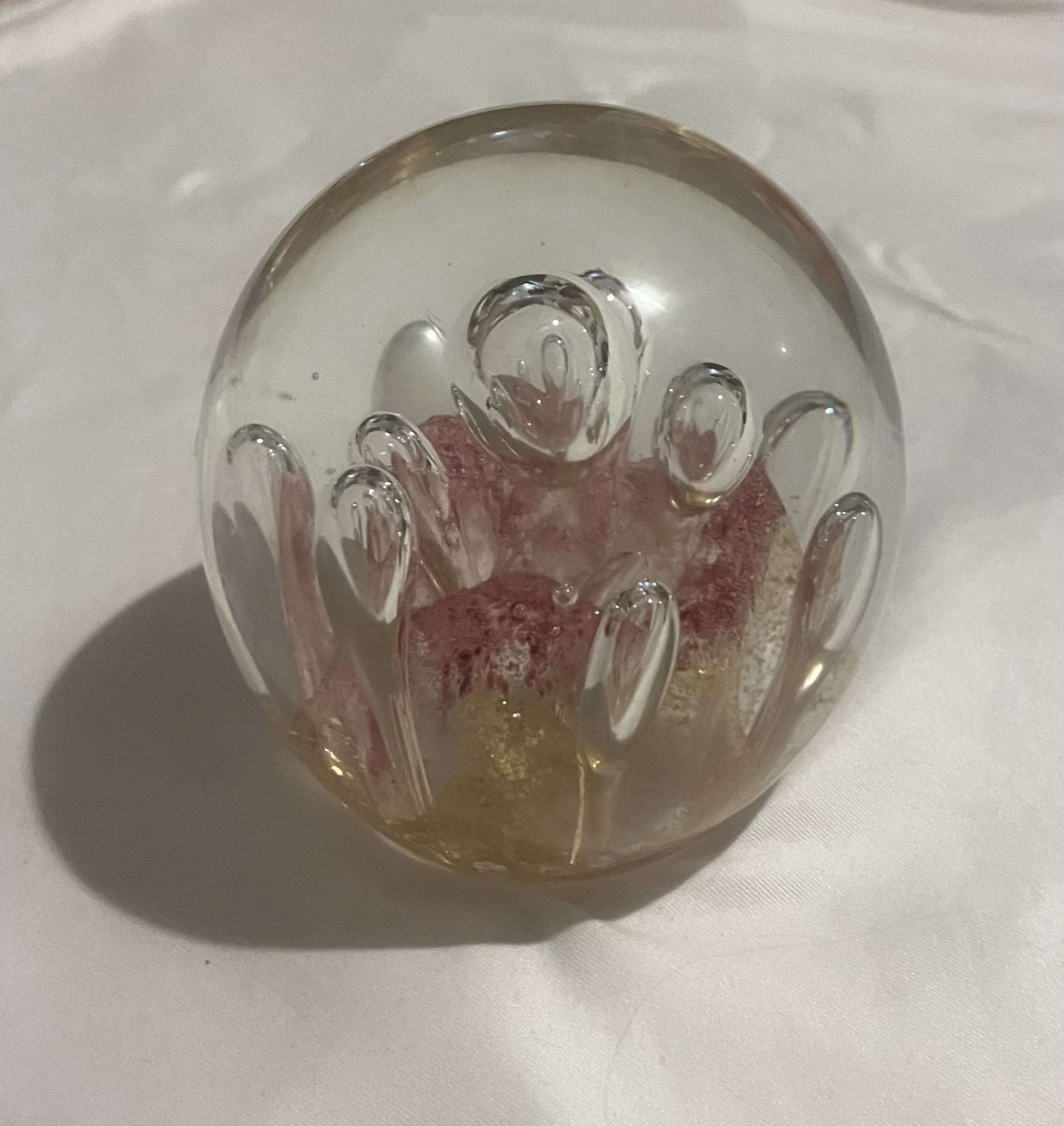 A striking vintage art glass paperweight with a bold, decorative presence: