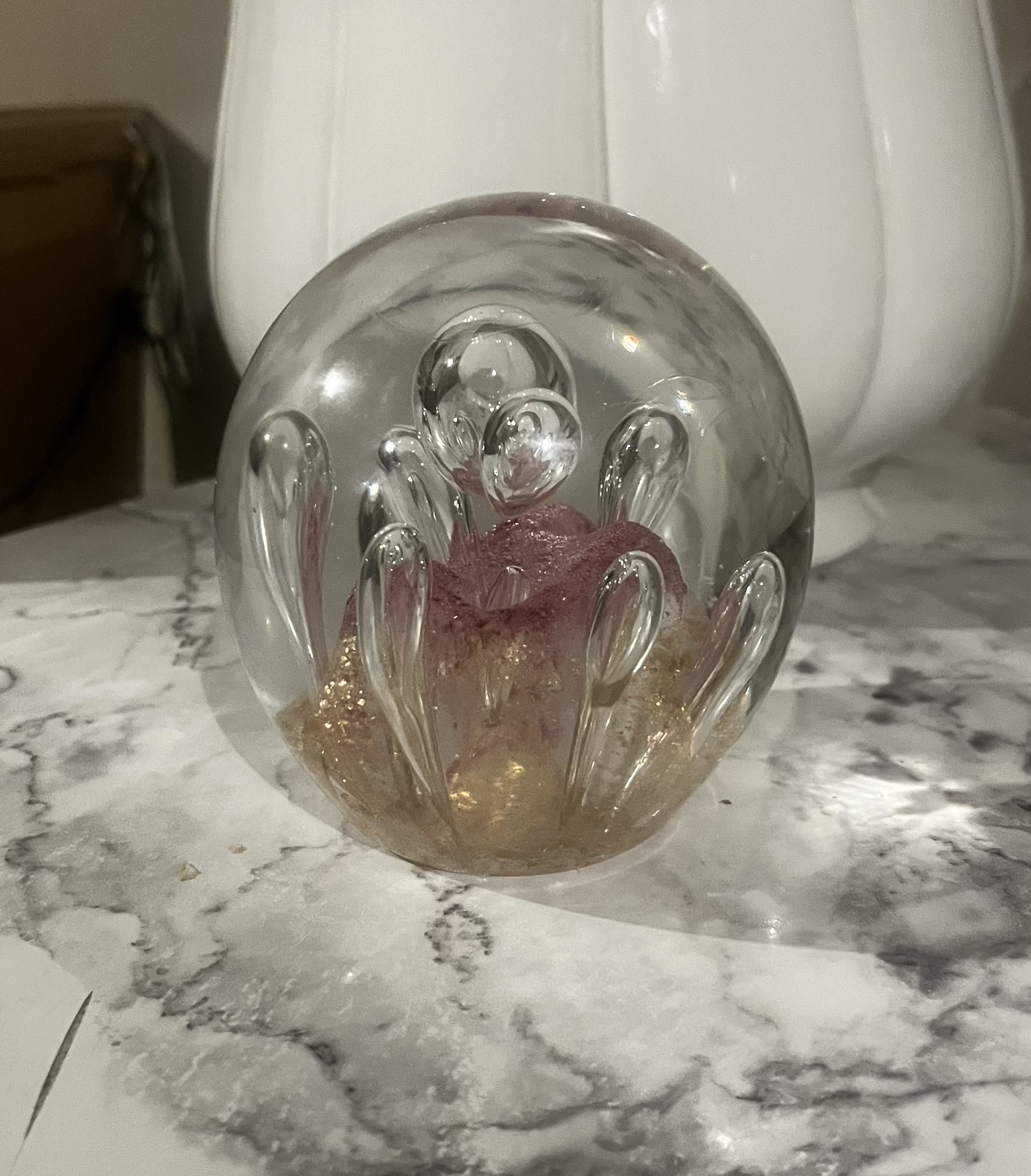Rich berry pink glass infused with gold accents and controlled bubbles