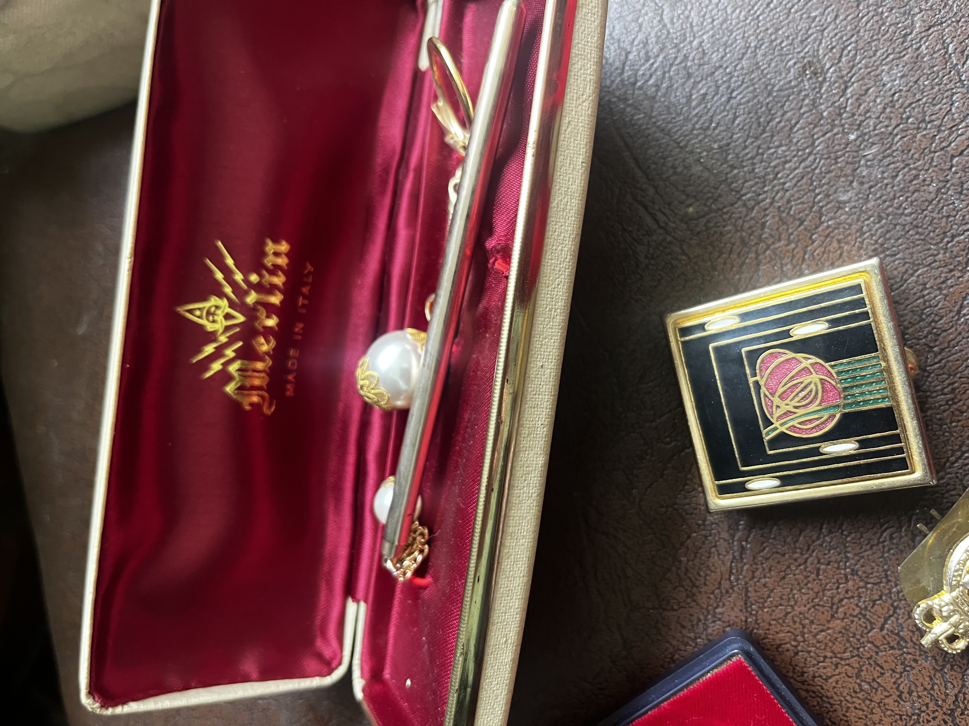 The first item is a Merlin pen and key ring gift set, presented in a soft pink and cream faux pearl-finish gift box. The set is likely from the 1960s or 1970s and contains a small pen and matching key ring. The presentation box, with its retro pearlescent surface and velvet-look interior, gives this set a distinct mid-century charm.