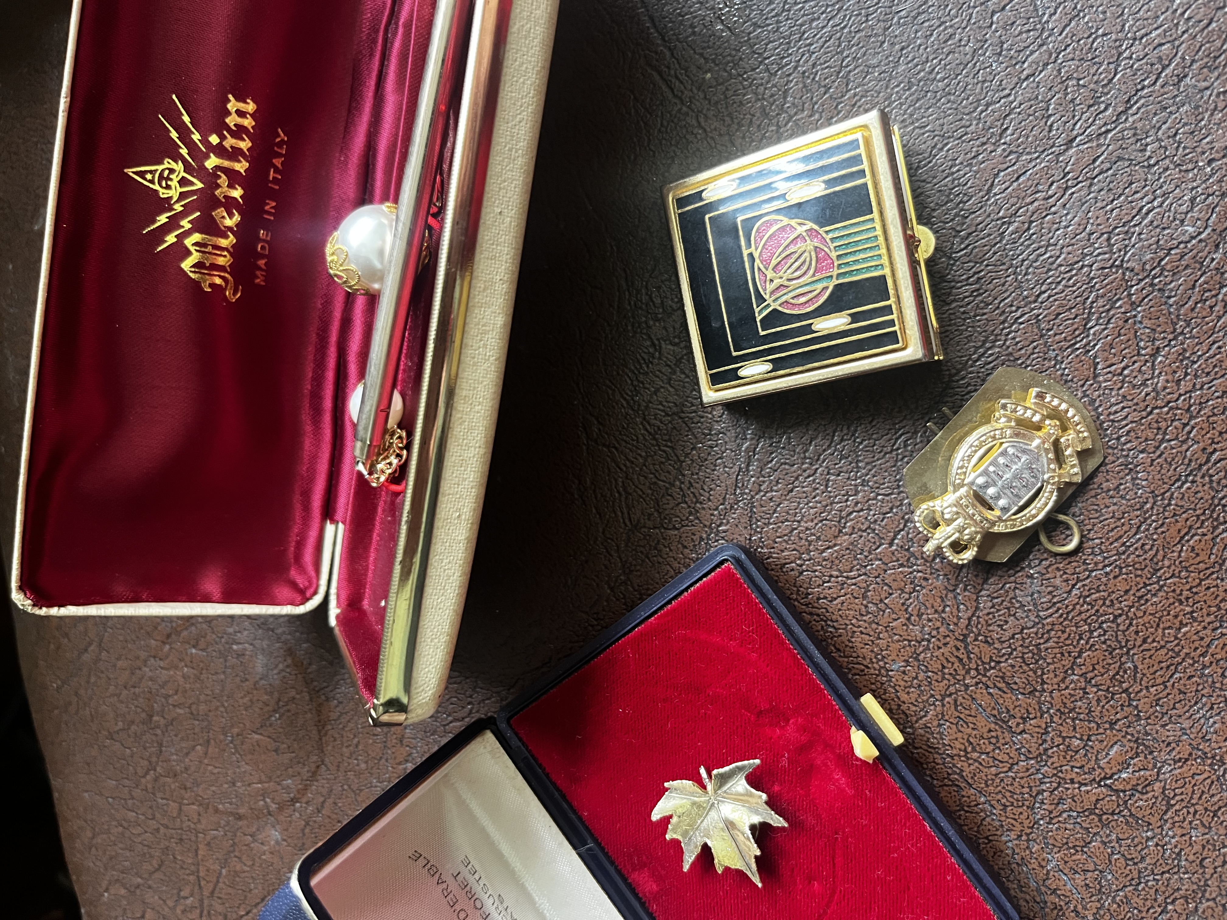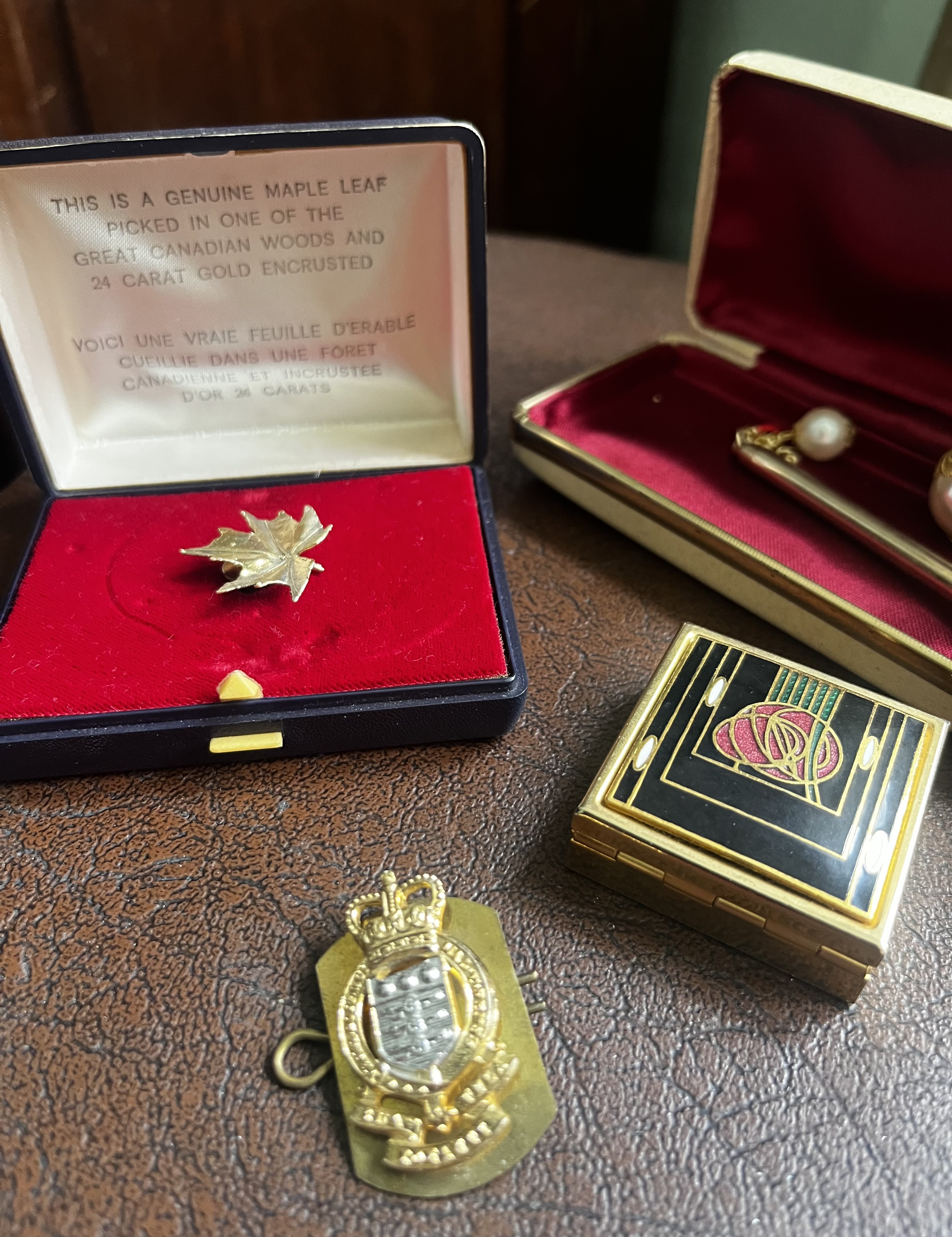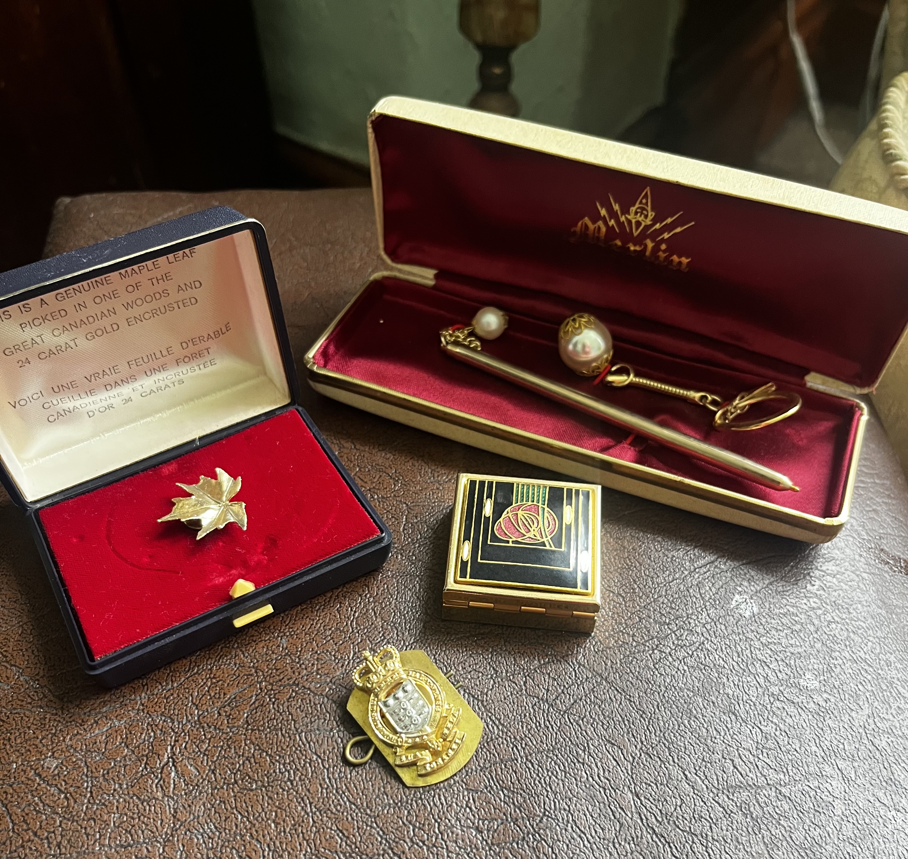The final item is a vintage maple leaf brooch, gold-encrusted with 24 carat detailing, and presented in its original box. The brooch is inscribed with “Picked in one of the great Canadian woods” and features a textured gold finish. It’s a classic Canadian souvenir piece from the mid-20th century, collectible for both its patriotic theme and its delicate craftsmanship.