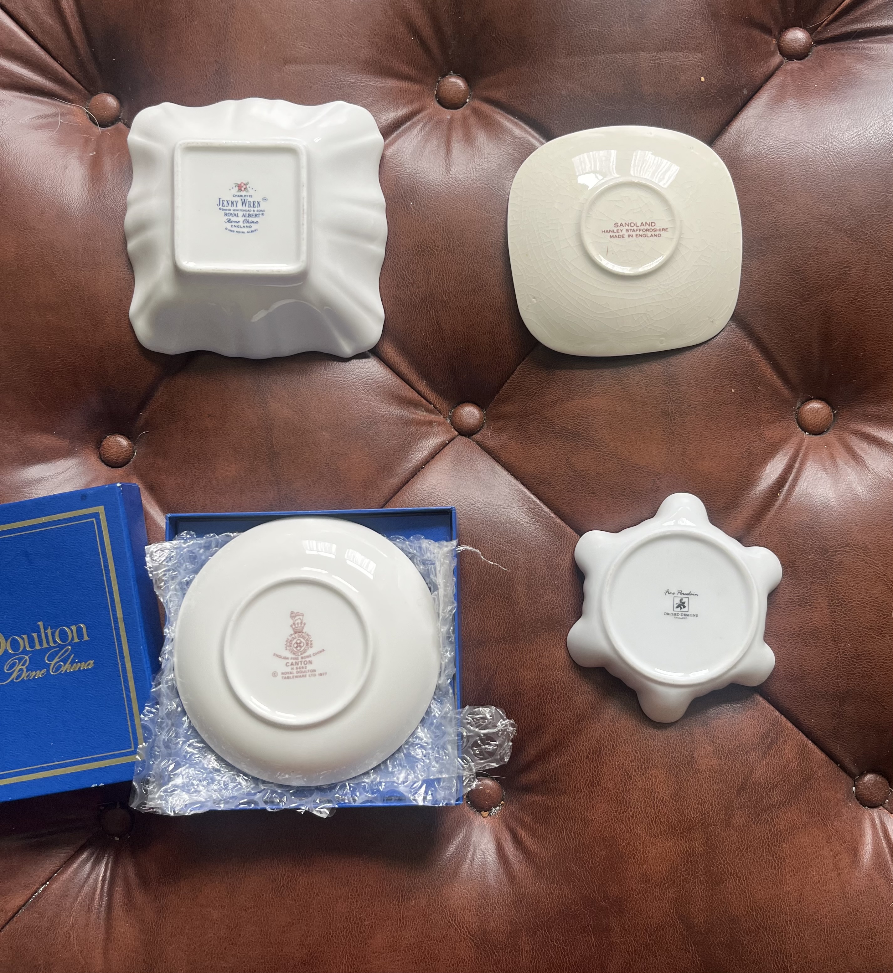 A decorative lot of four vintage porcelain trinket dishes by classic English makers — ideal for display, jewellery, or small keepsakes: