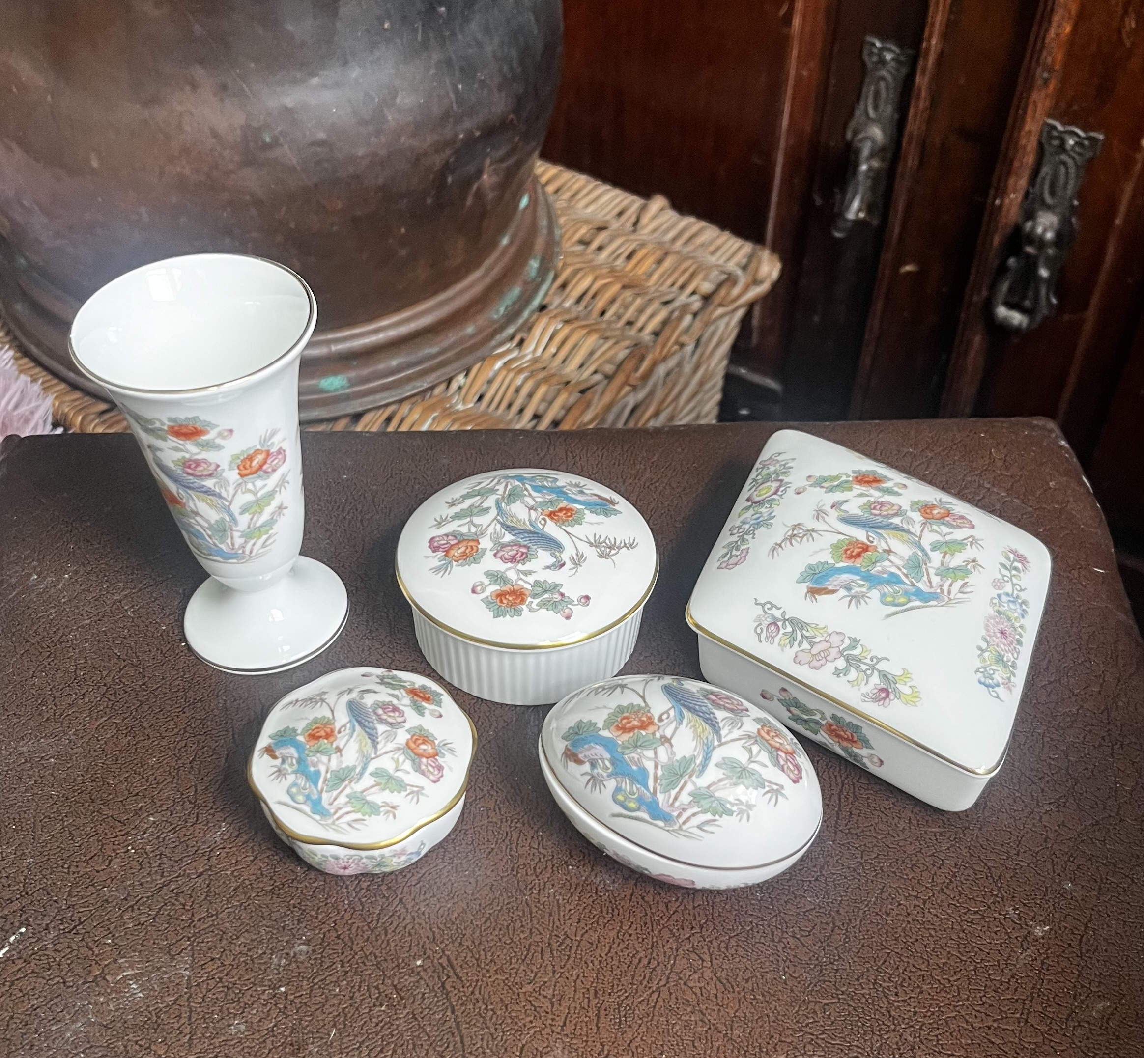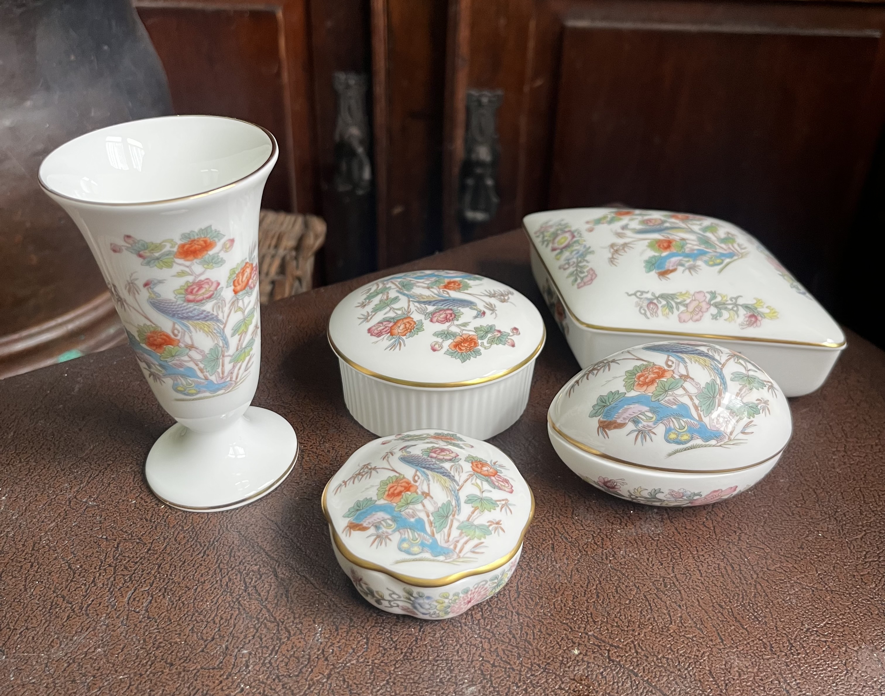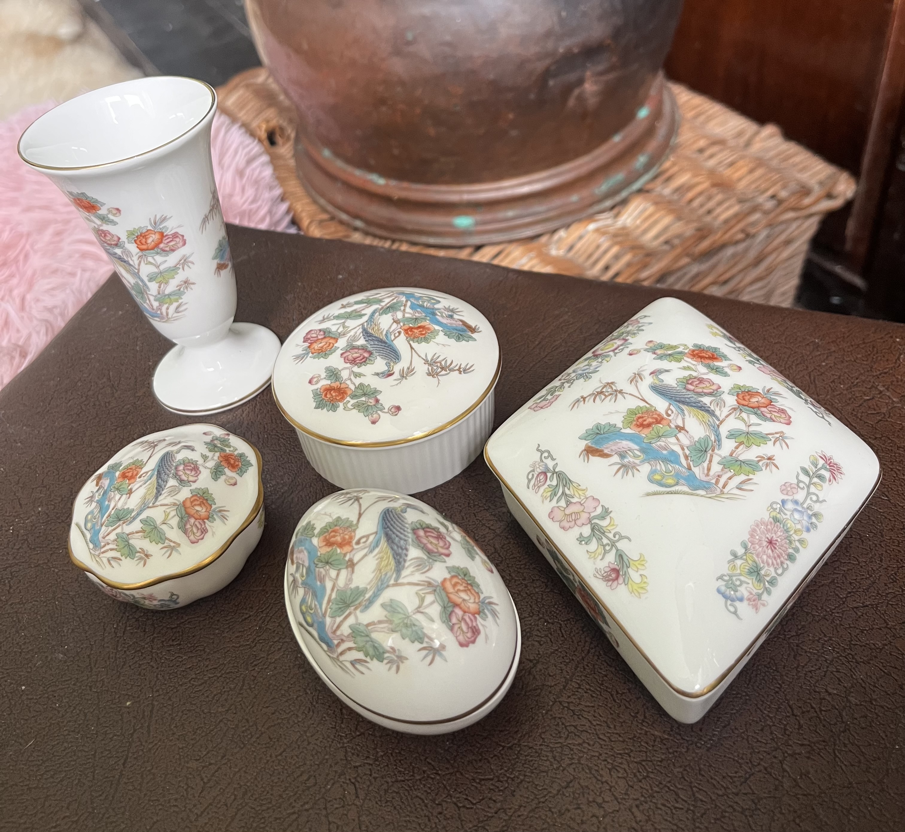 A beautifully coordinated collection of Wedgwood bone china trinket and decorative items in the Kutani Crane pattern — a sought-after design inspired by traditional Japanese motifs: