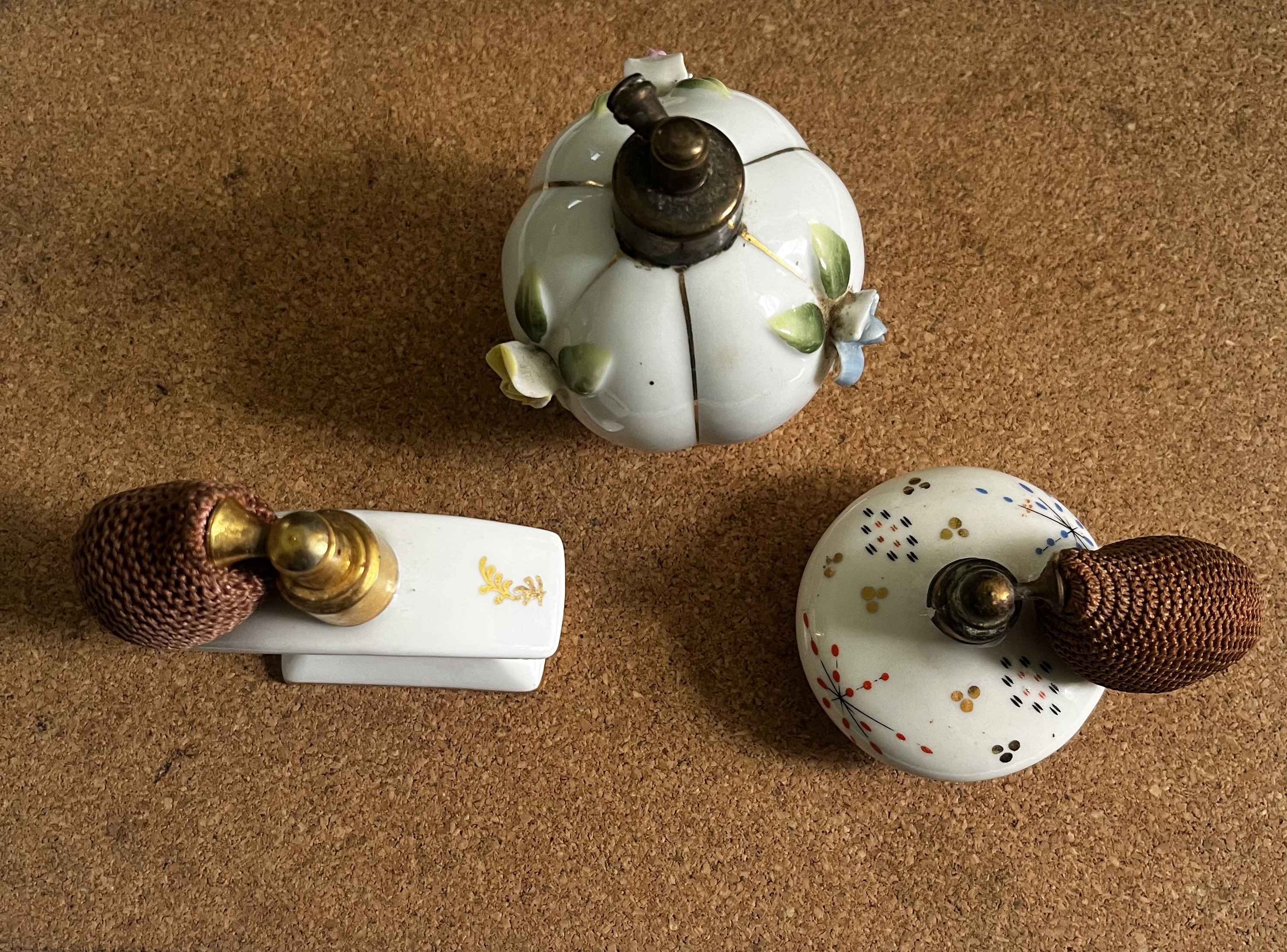 A decorative trio of vintage bone china perfume atomisers, each with delicate detailing and classic floral motifs: