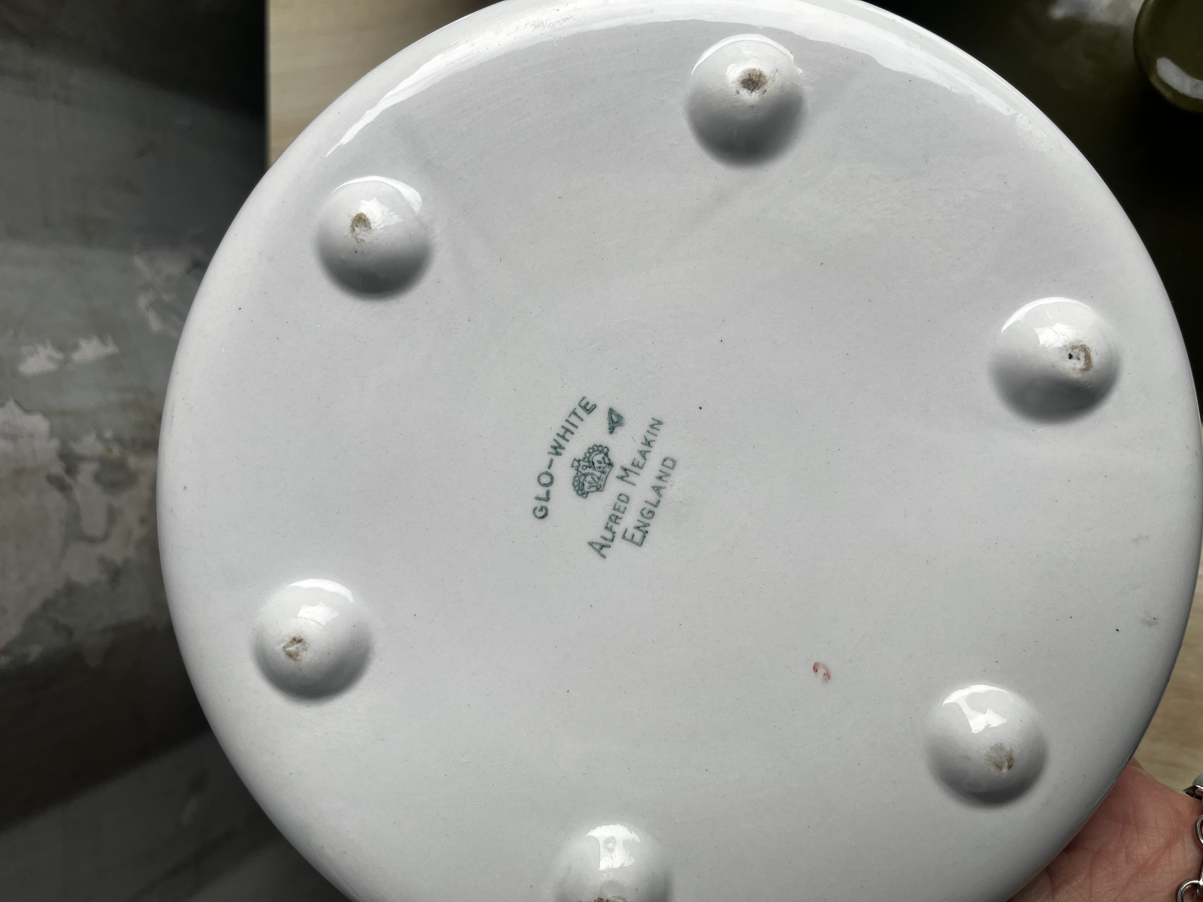 Alfred Meakin Ltd, founded in 1875 in Tunstall, Staffordshire, was known for producing high-quality tableware that balanced affordability with classic English design. Glow-White dishes are now widely collected for their retro charm and kitchen utility.