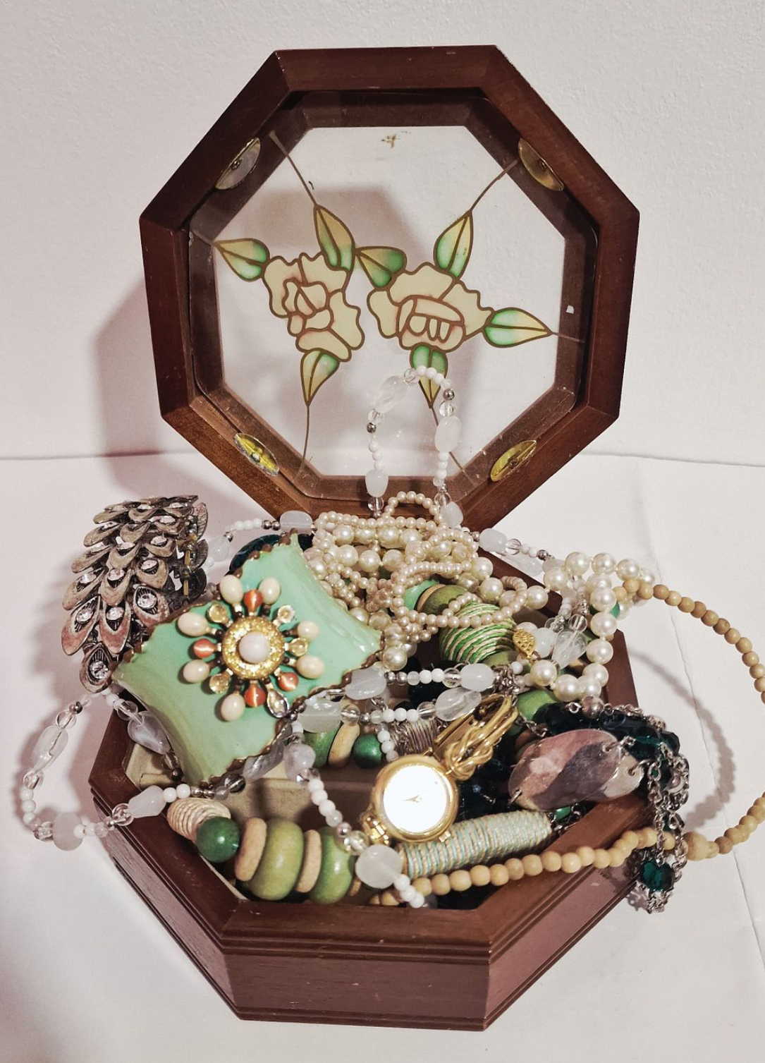 A useful lot for jewellery lovers, resellers, or crafters, offering a ready-made mix of wearable costume pieces and a stylish box for display or storage.
