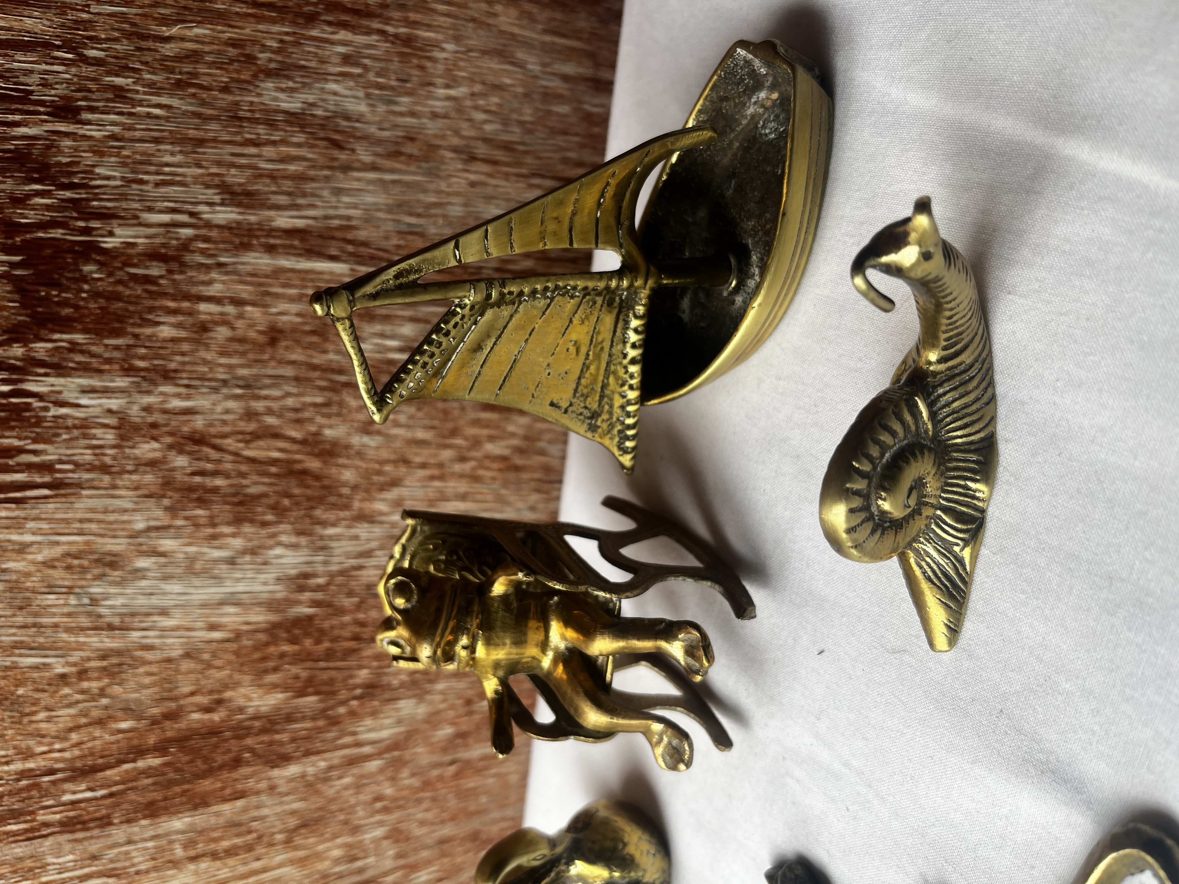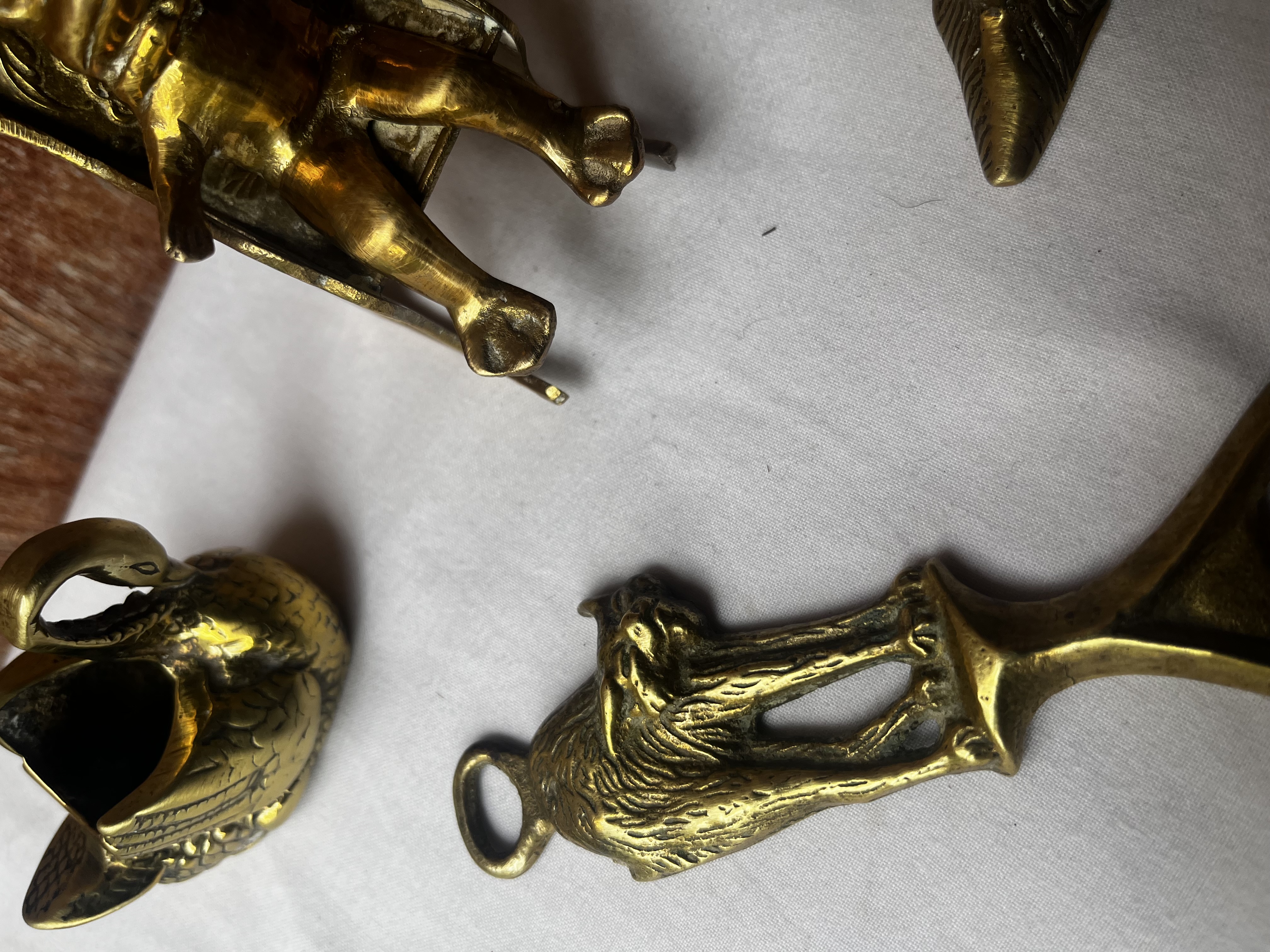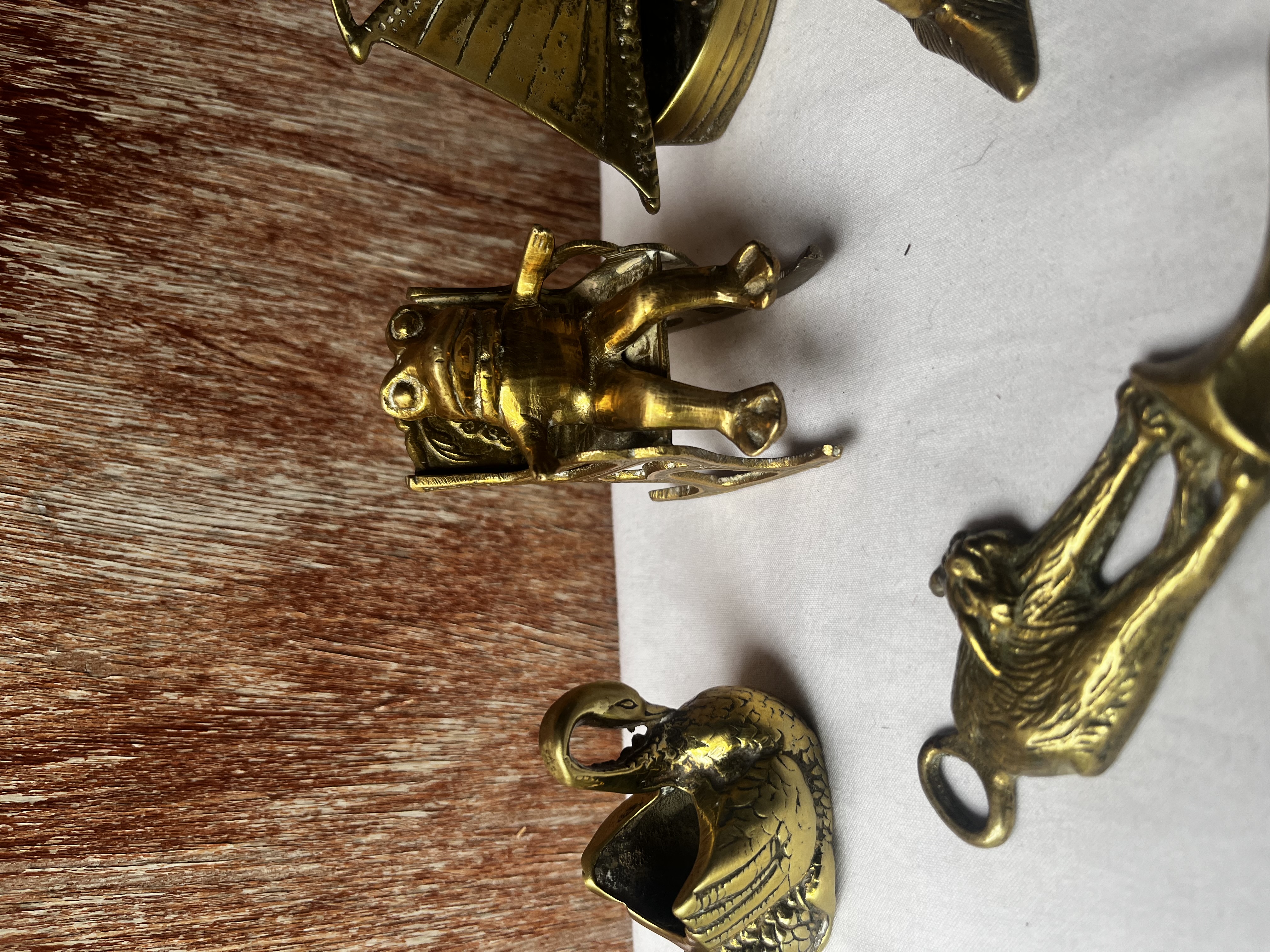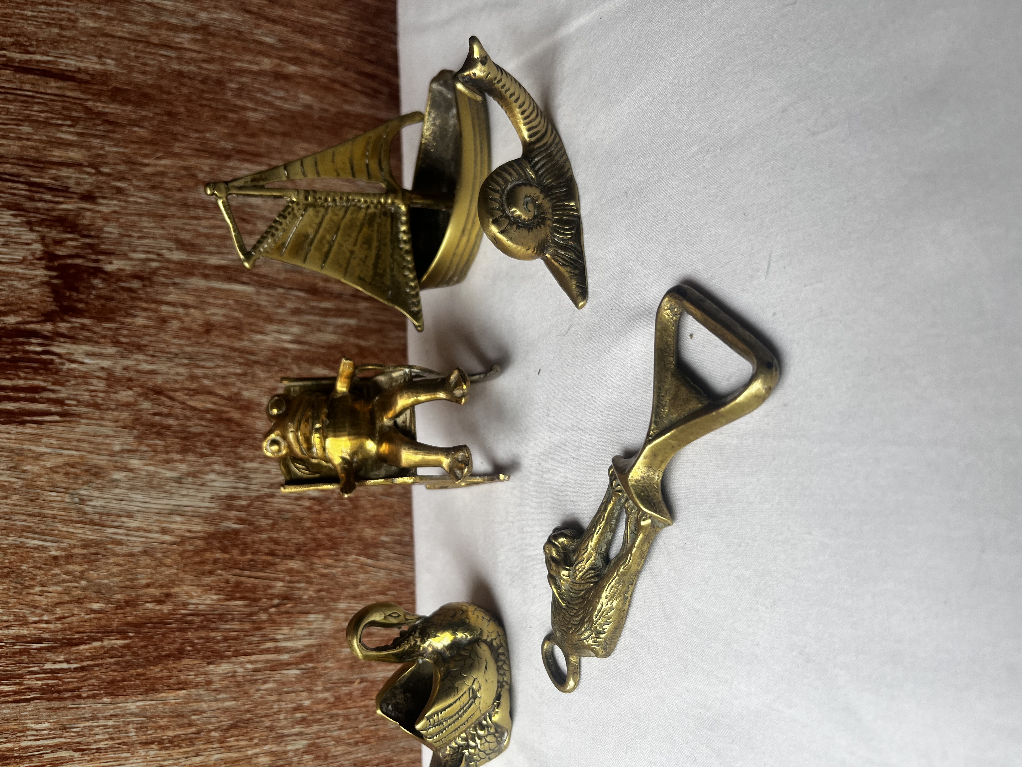items, including: A cat shaped bottle opener. A swan figurine. A frog in a rocking chair figurine. A sailboat figurine. A snail figurine.