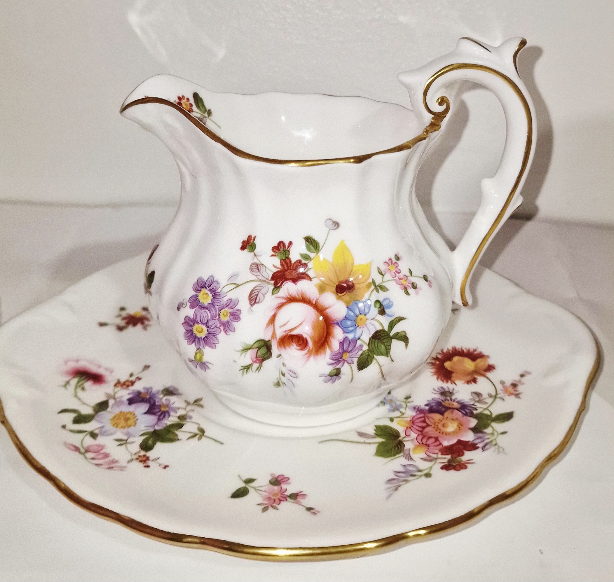An exquisite selection of fine china featuring pieces from Duchess, Royal Crown Derby, and Brama. This lot includes three matching cup and saucer duos with stunning rose and gold detailing, a matching gold-rimmed milk jug and saucer adorned with a delicate flower design, plus two matching trios showcasing a charming pink flower pattern.