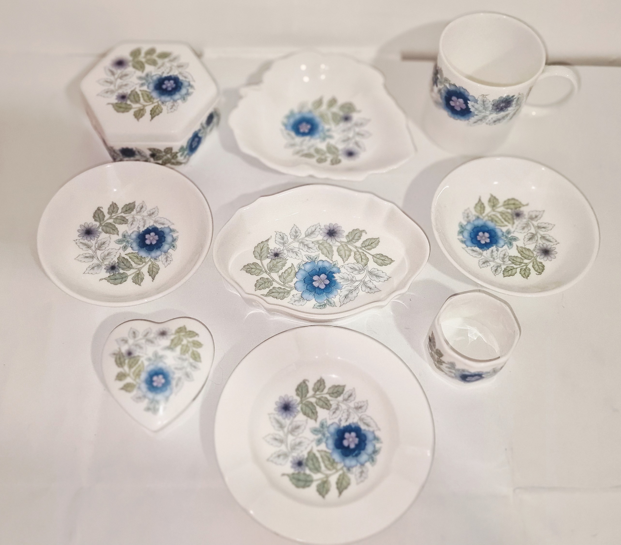 A charming collection of Wedgwood bone china featuring the elegant Clementine design. This set includes two matching side dishes, a lidded heart-shaped trinket dish, a lidded hexagon-shaped jar, a leaf-shaped trinket dish, a mug, a small hexagon pot, and a plate. The Clementine pattern is prized for its quality craftsmanship and versatile appeal, making it suitable for both collectors and everyday use.