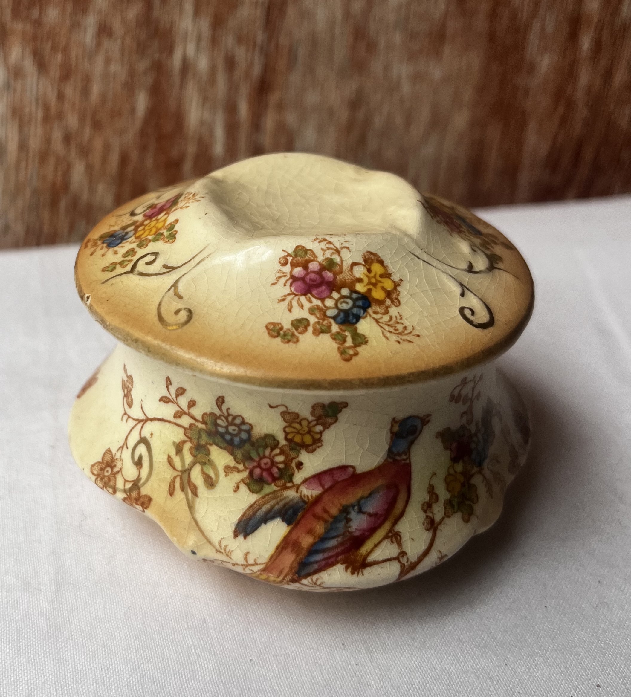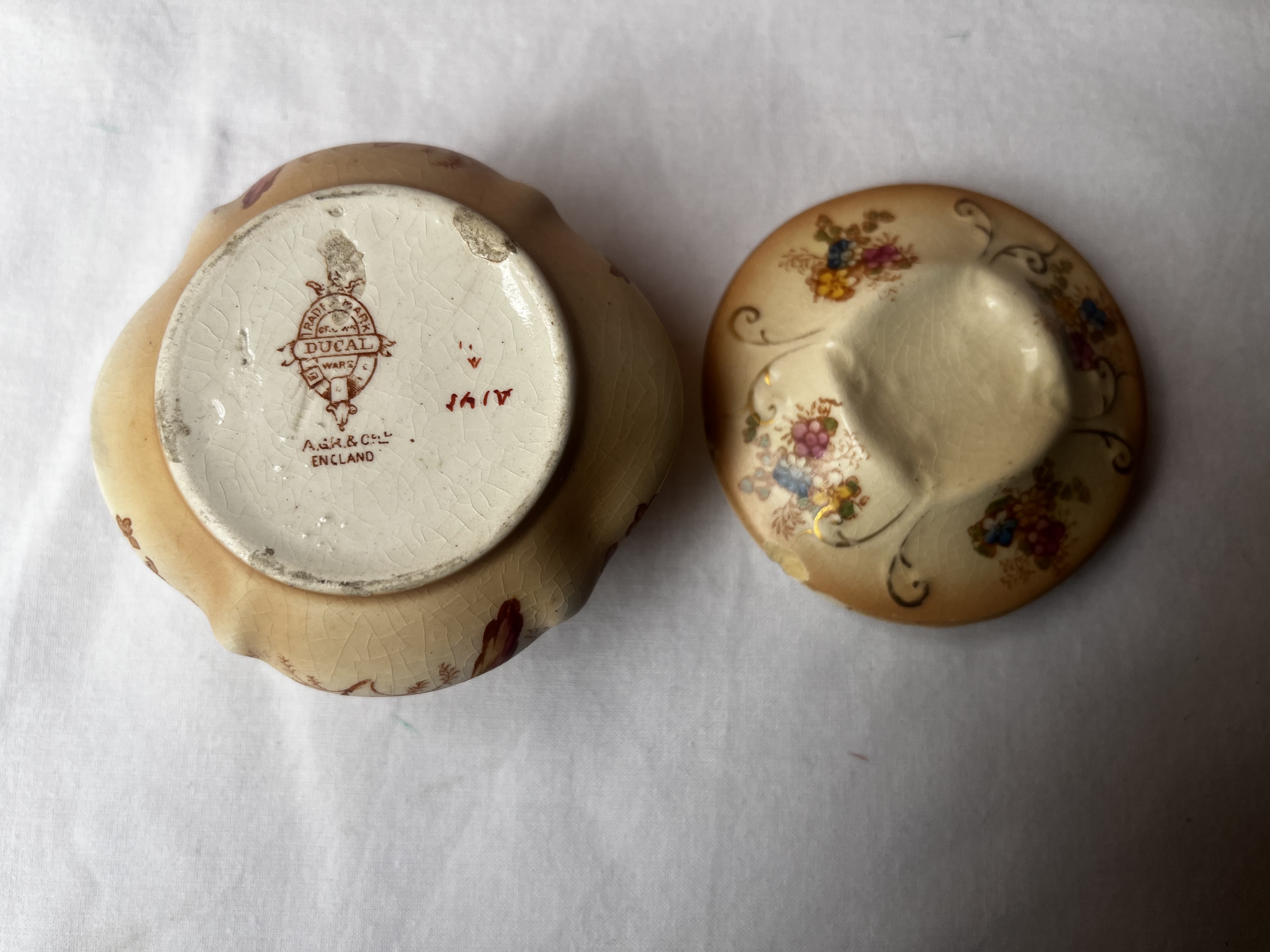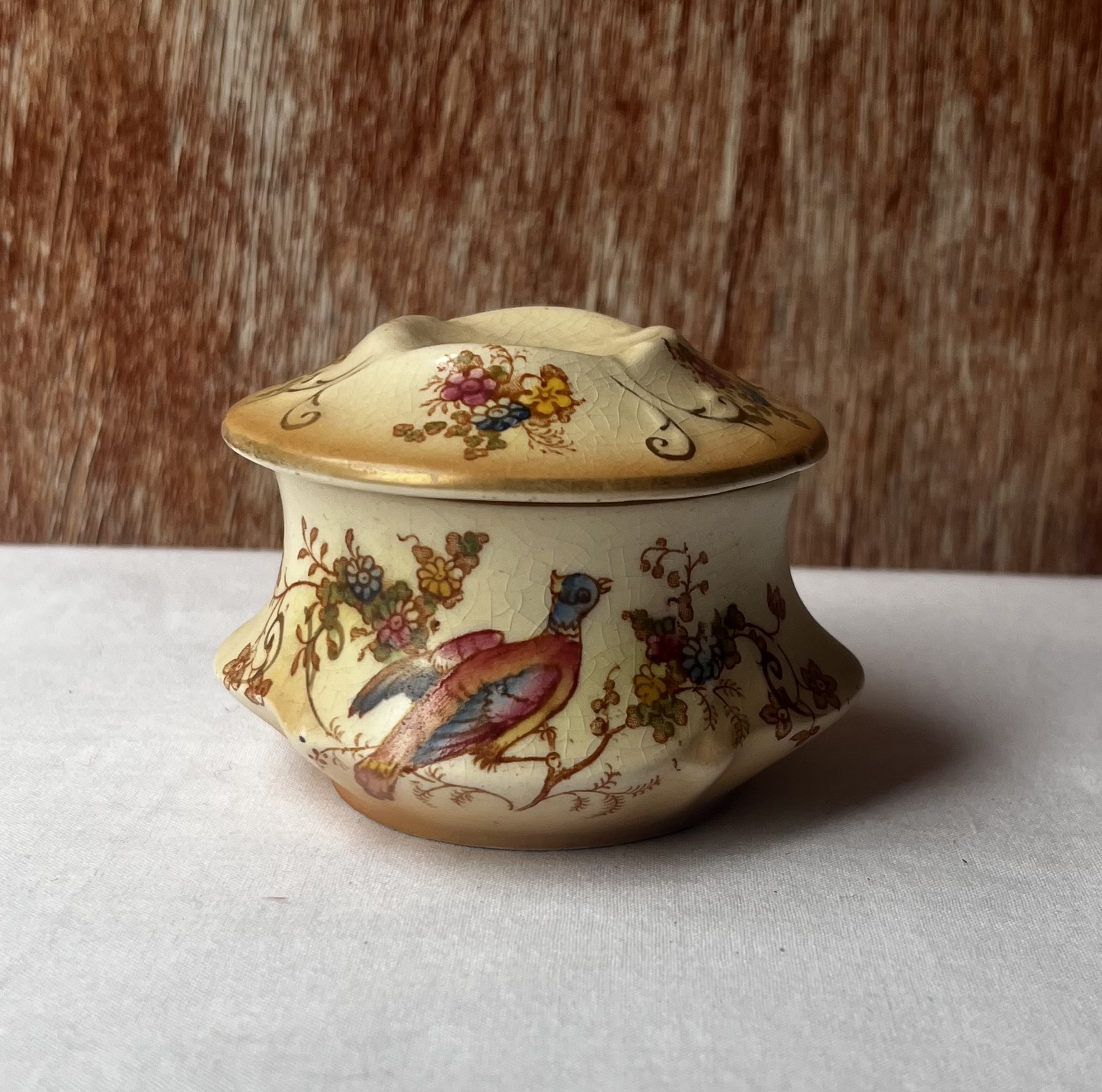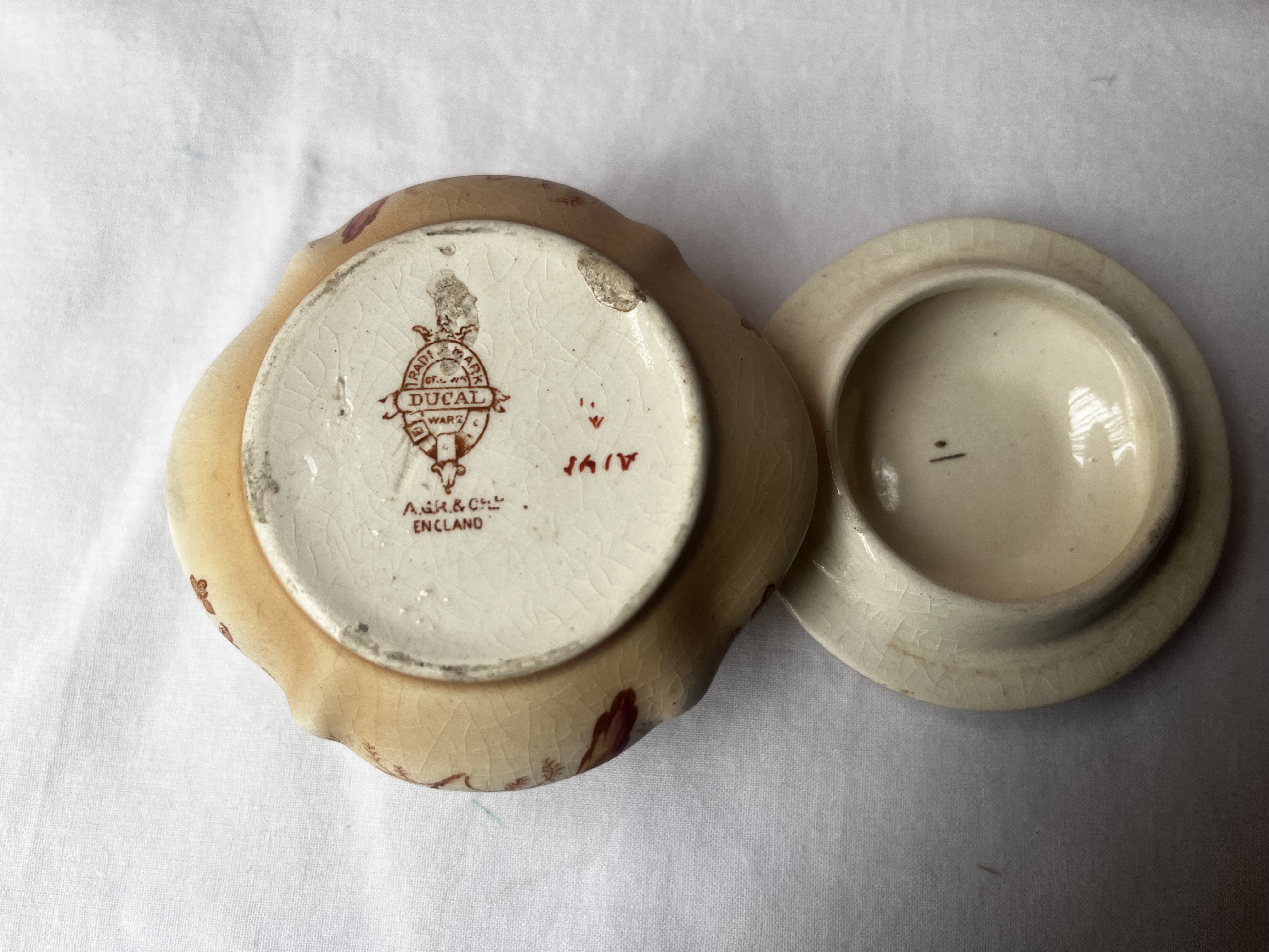 A charming example of early 20th-century British ceramics, this lidded dressing table powder pot is crafted by Crown Ducal Ware, a renowned pottery manufacturer established in 1915. The piece features the distinctive “AGR & Co ENGLAND” backstamp, confirming its origin from A.G. Richardson & Co Ltd.()