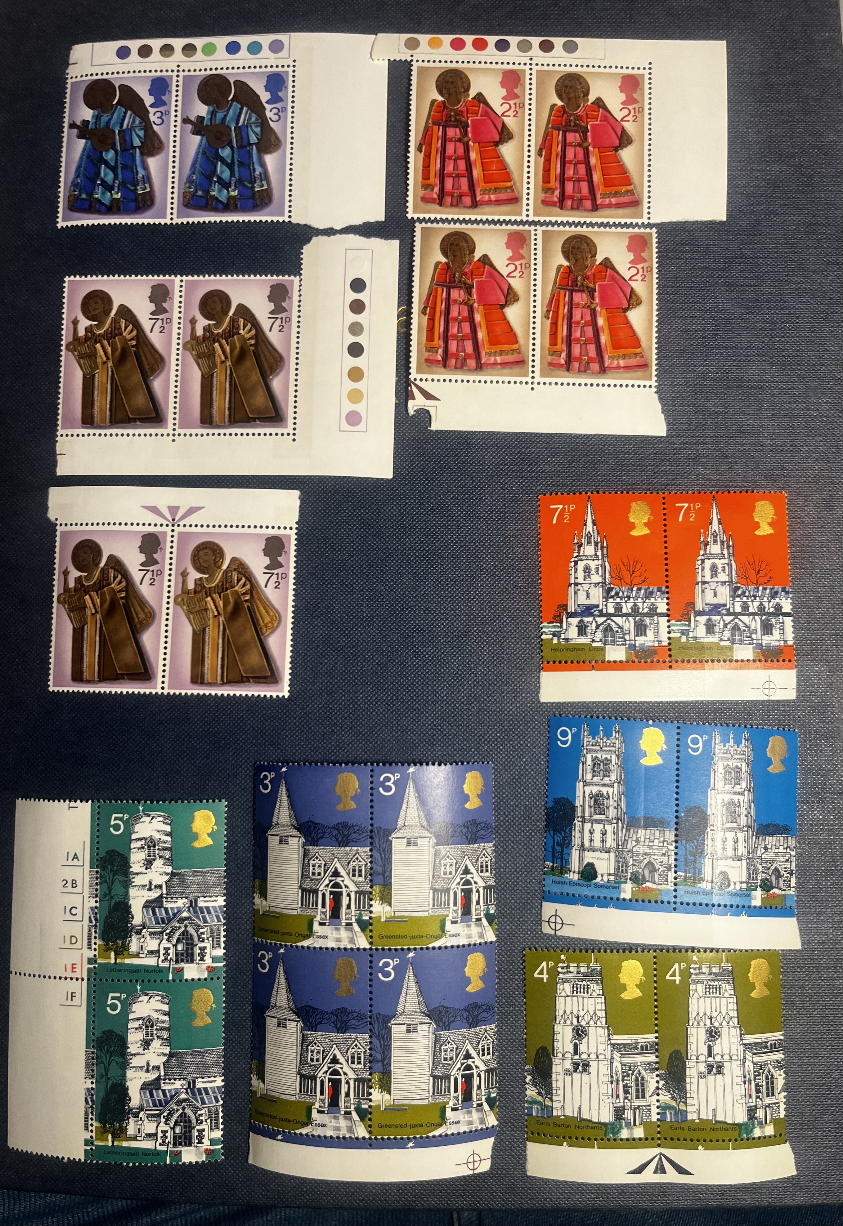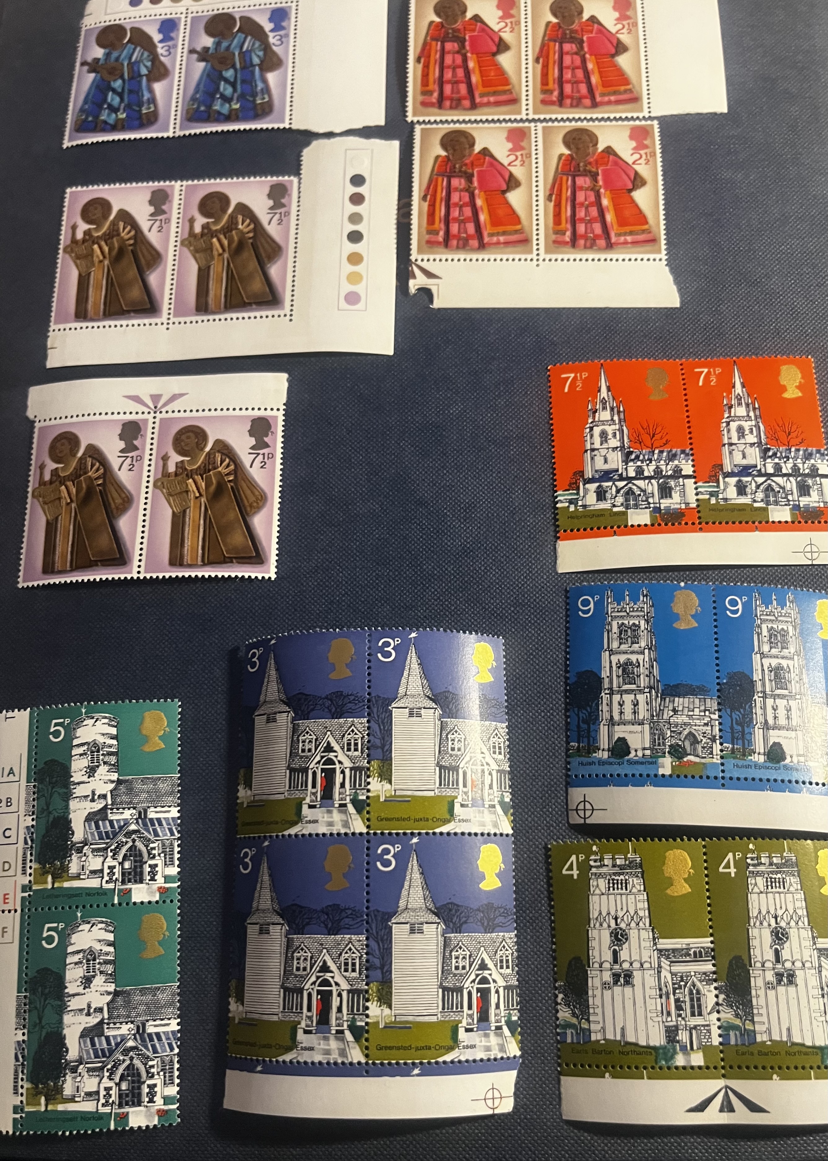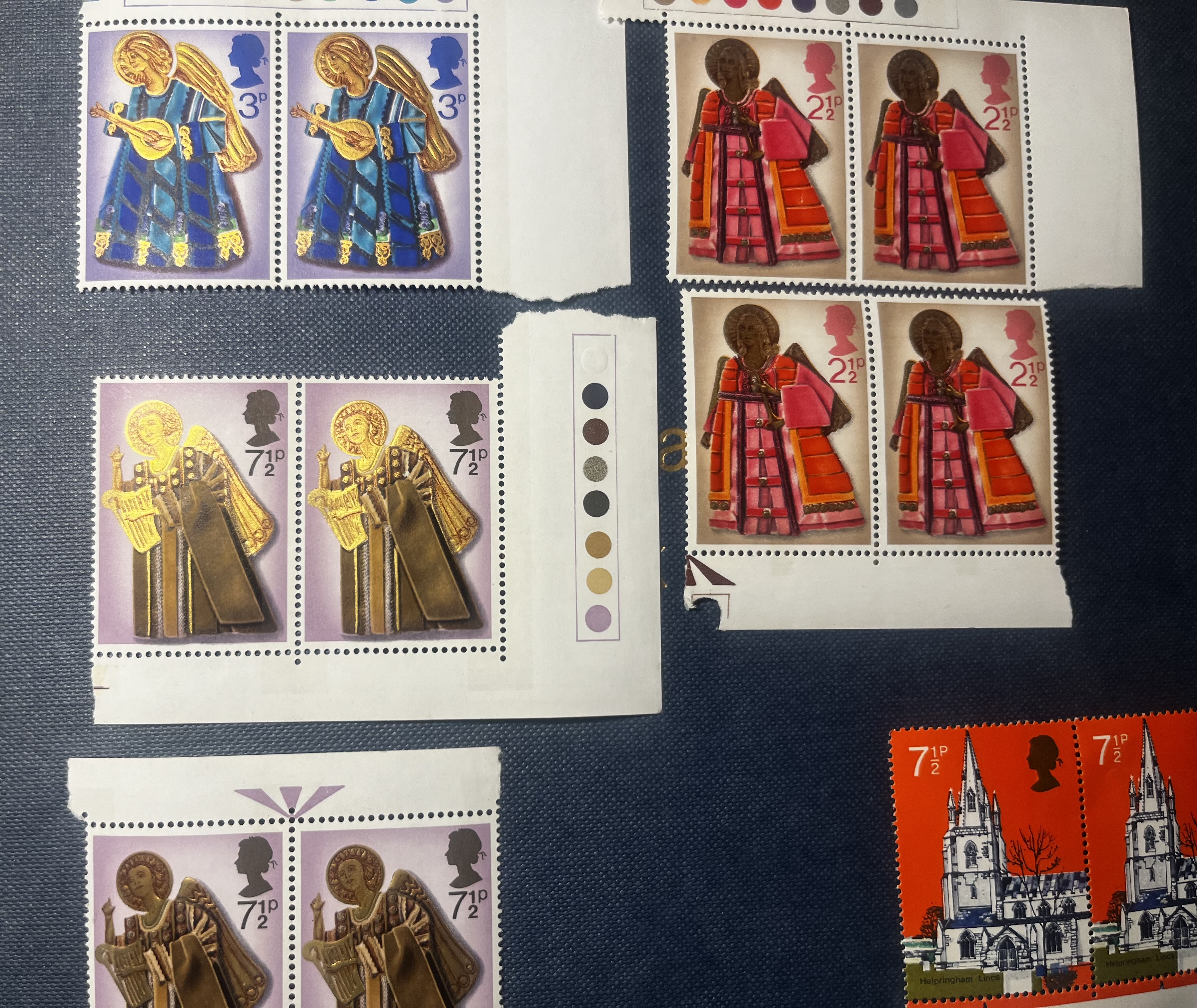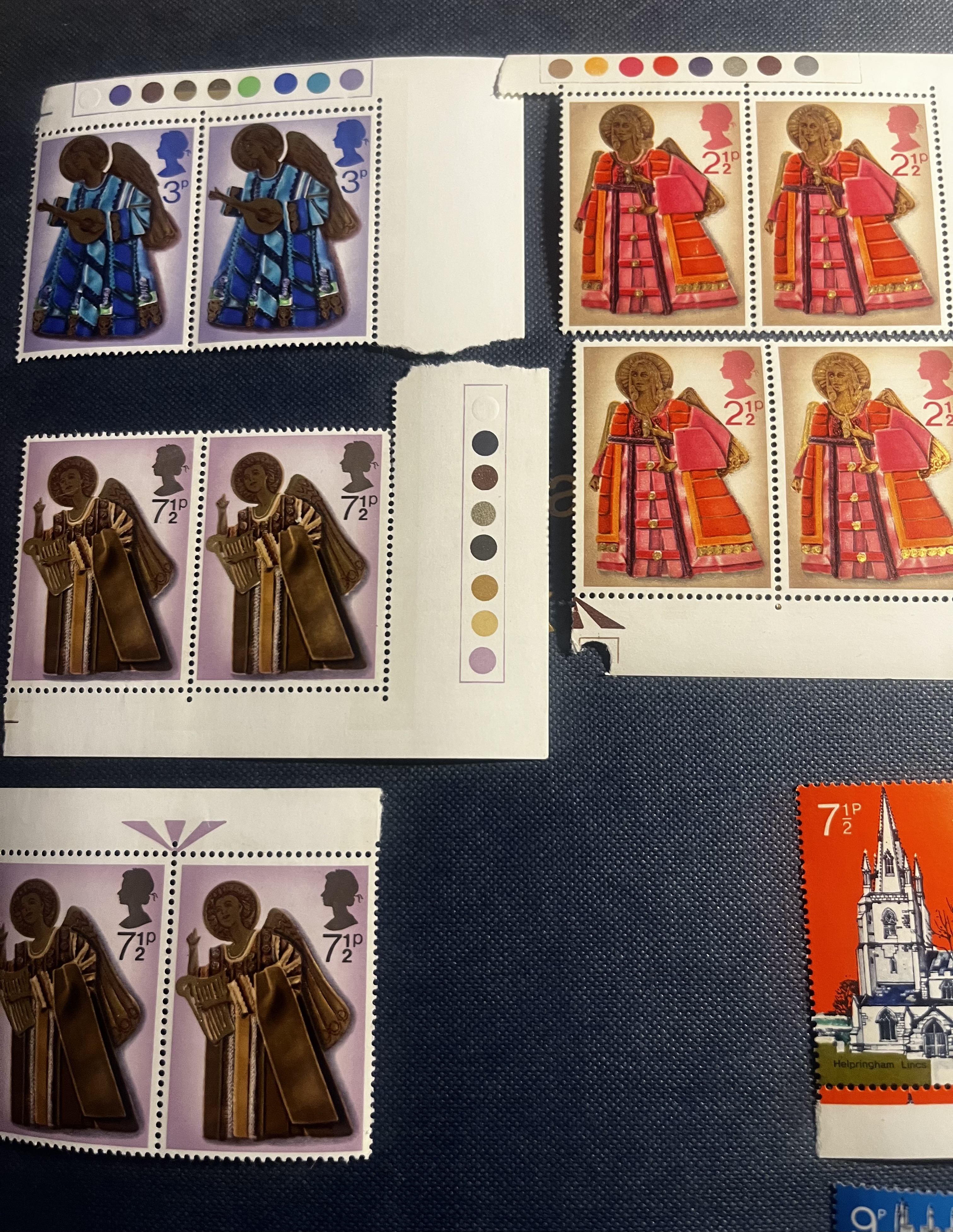 • Christmas Angels (1974): Featuring angelic figures with trumpets, likely from the 1974 Christmas issue (SG 966–969).