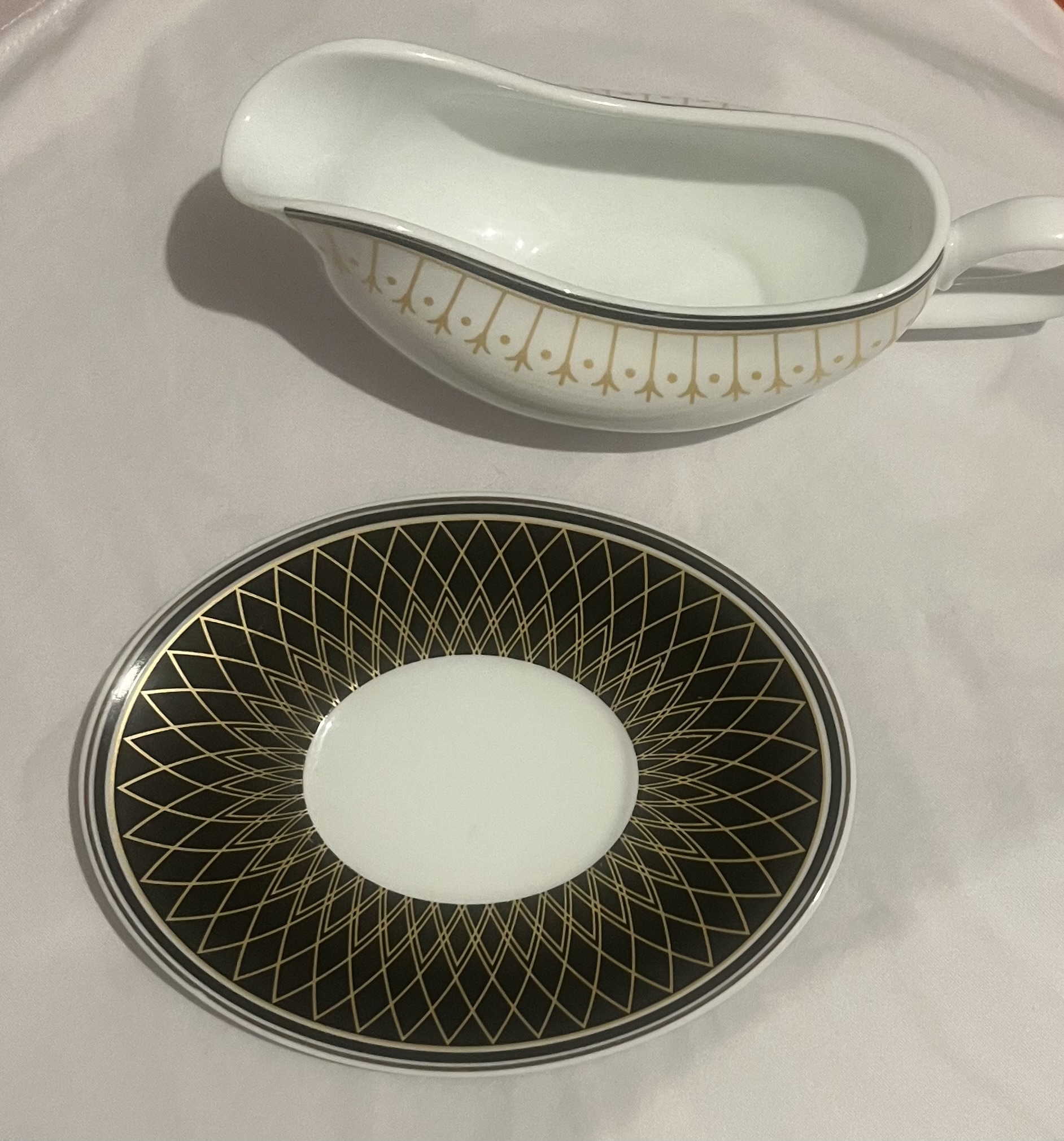 White ceramic gravy boat with a rich navy band and delicate gold detailing