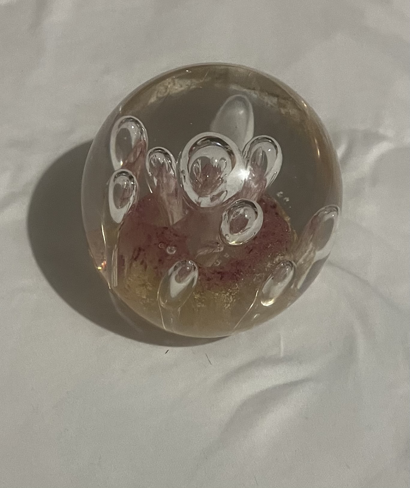 A striking vintage art glass paperweight with a bold, decorative presence: