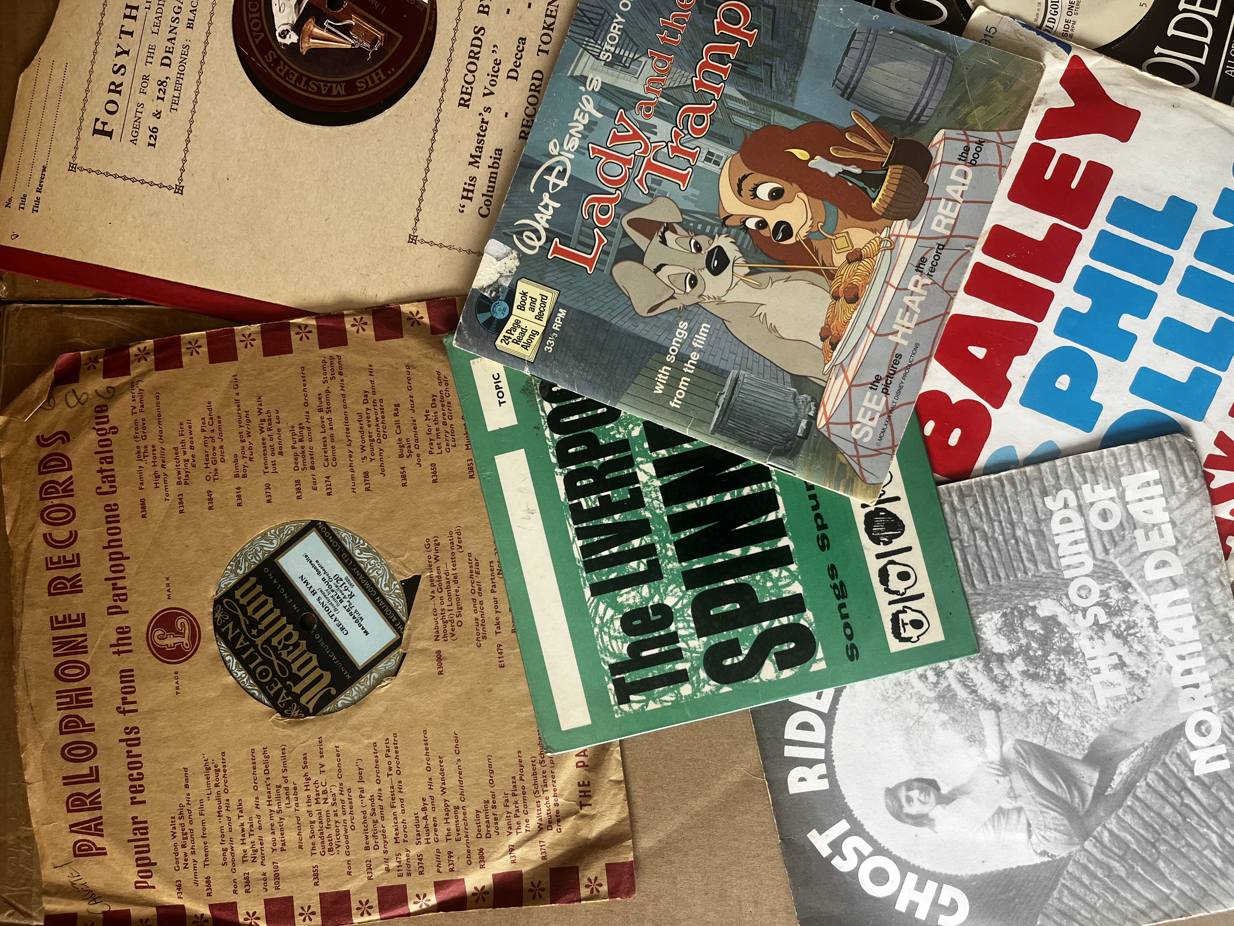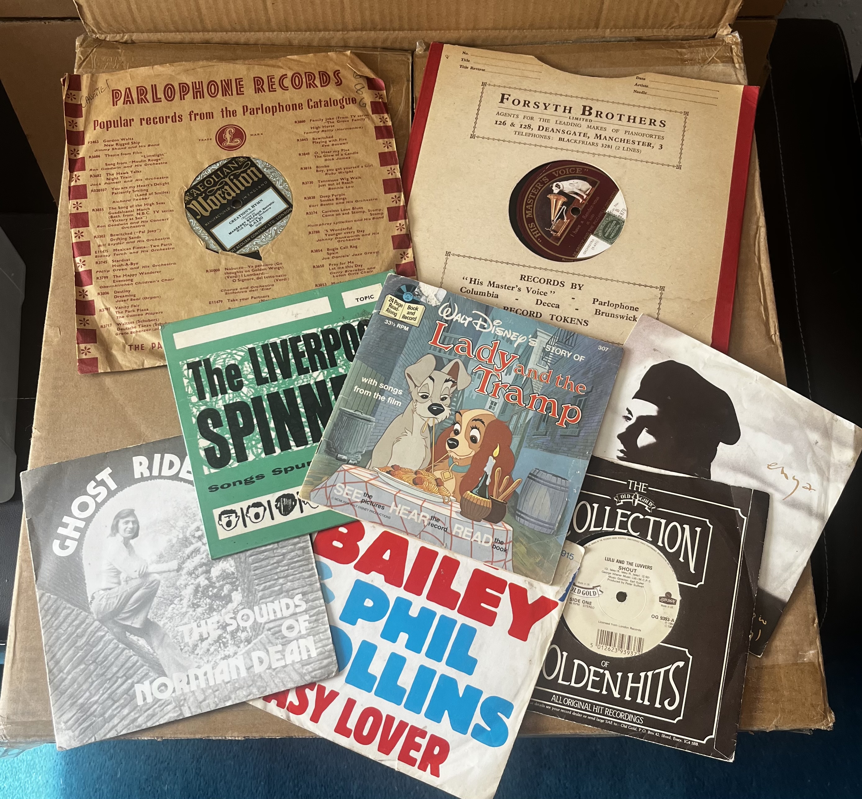 It includes two early 78 RPM shellac records, six 45 RPM vinyl singles covering folk, pop, and easy listening genres, and a Disney read-along storybook and record.