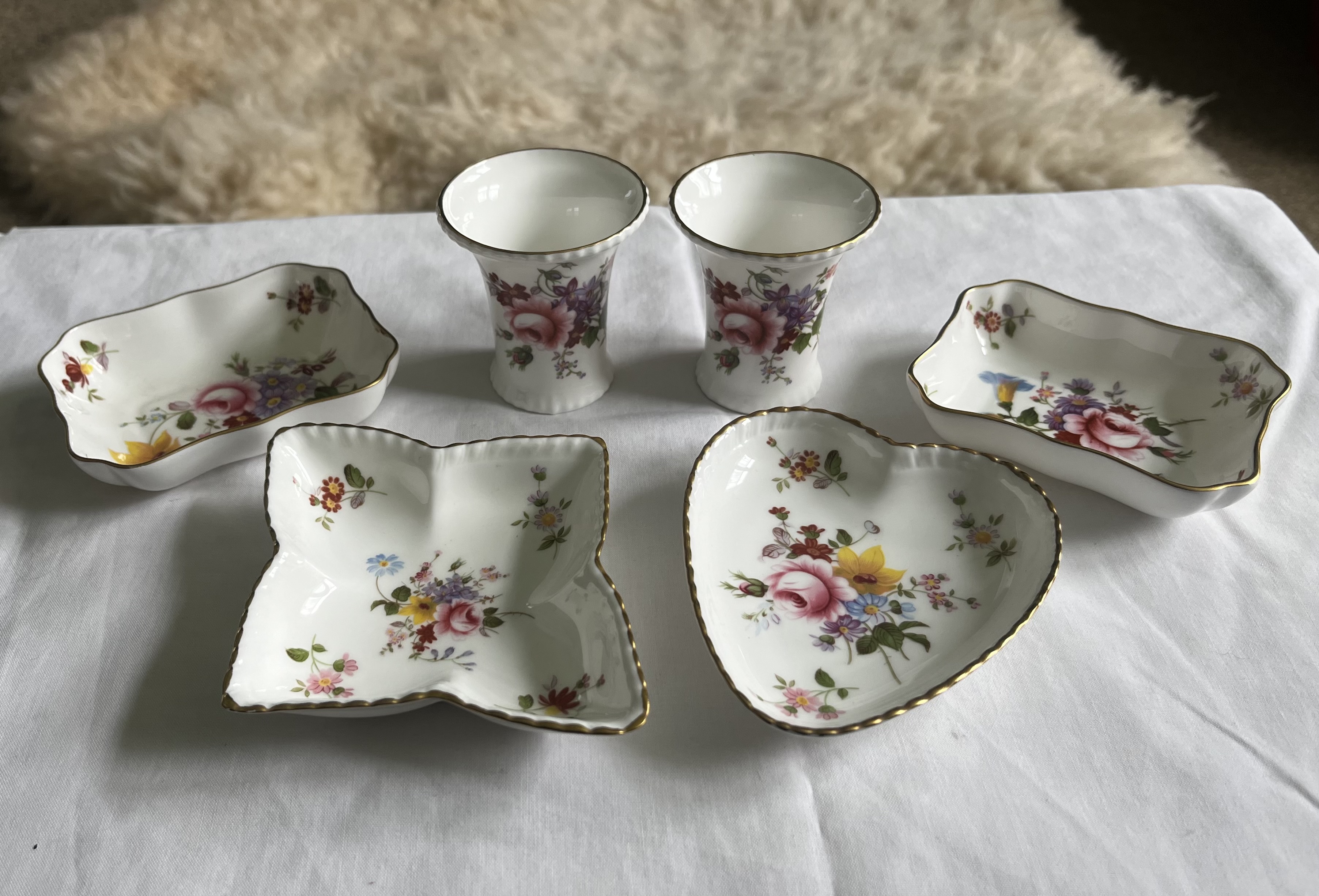 A coordinated group of six vintage bone china pieces in the ever-popular “Derby Posies” pattern by Royal Crown Derby — featuring delicate floral sprays in soft pastel tones: